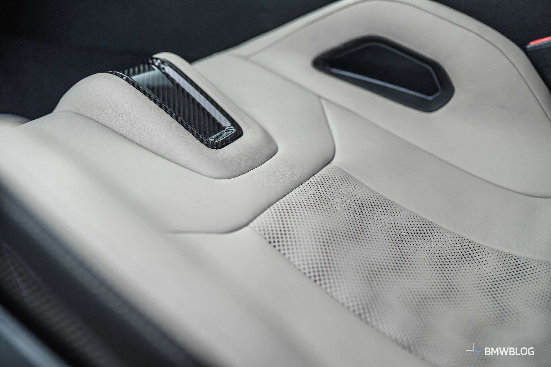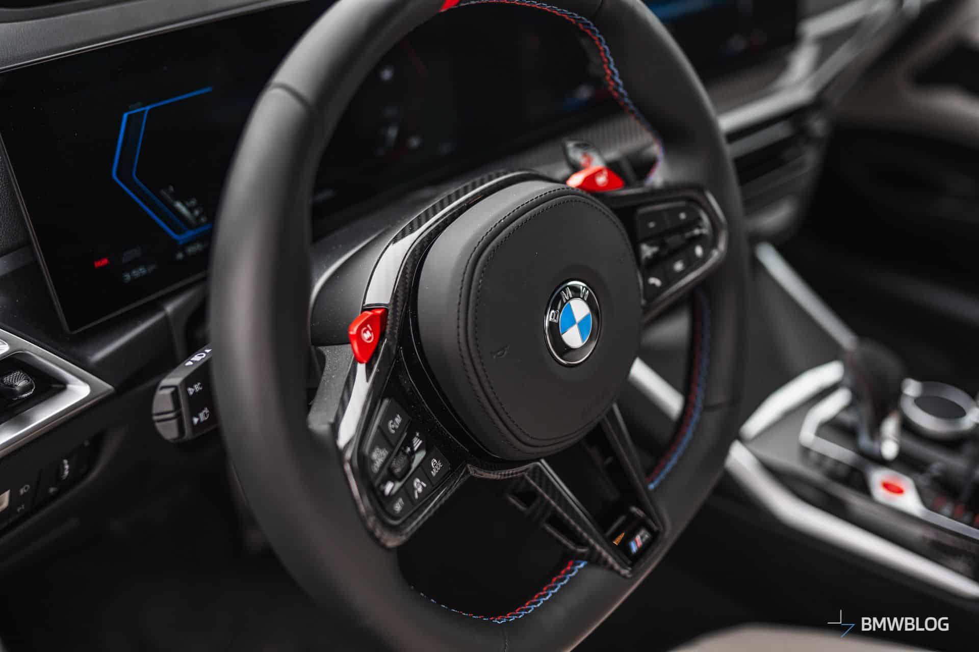 Stepping inside, BMW wants $4,500 for those carbon bucket seats in the front. This 2025 M4 has a Silverstone/Black interior but there are more daring alternatives. Yas Marina Blue, Kyalami Orange, and Fiona Red can all be combined with Black.