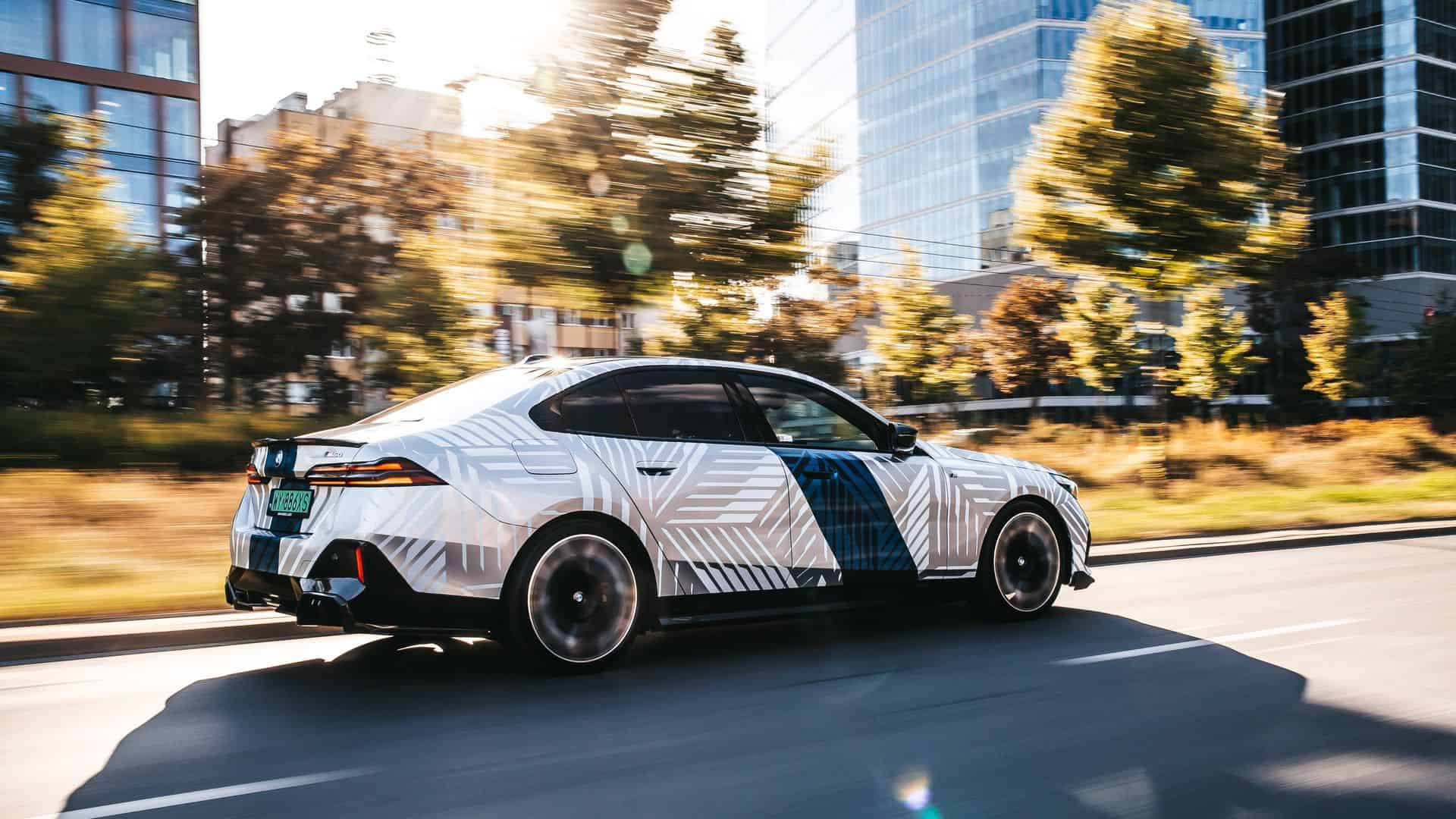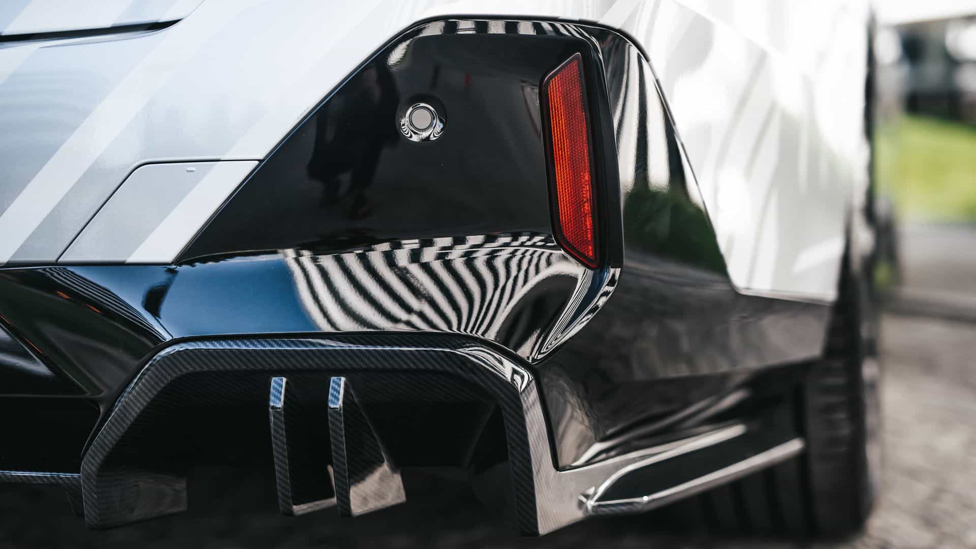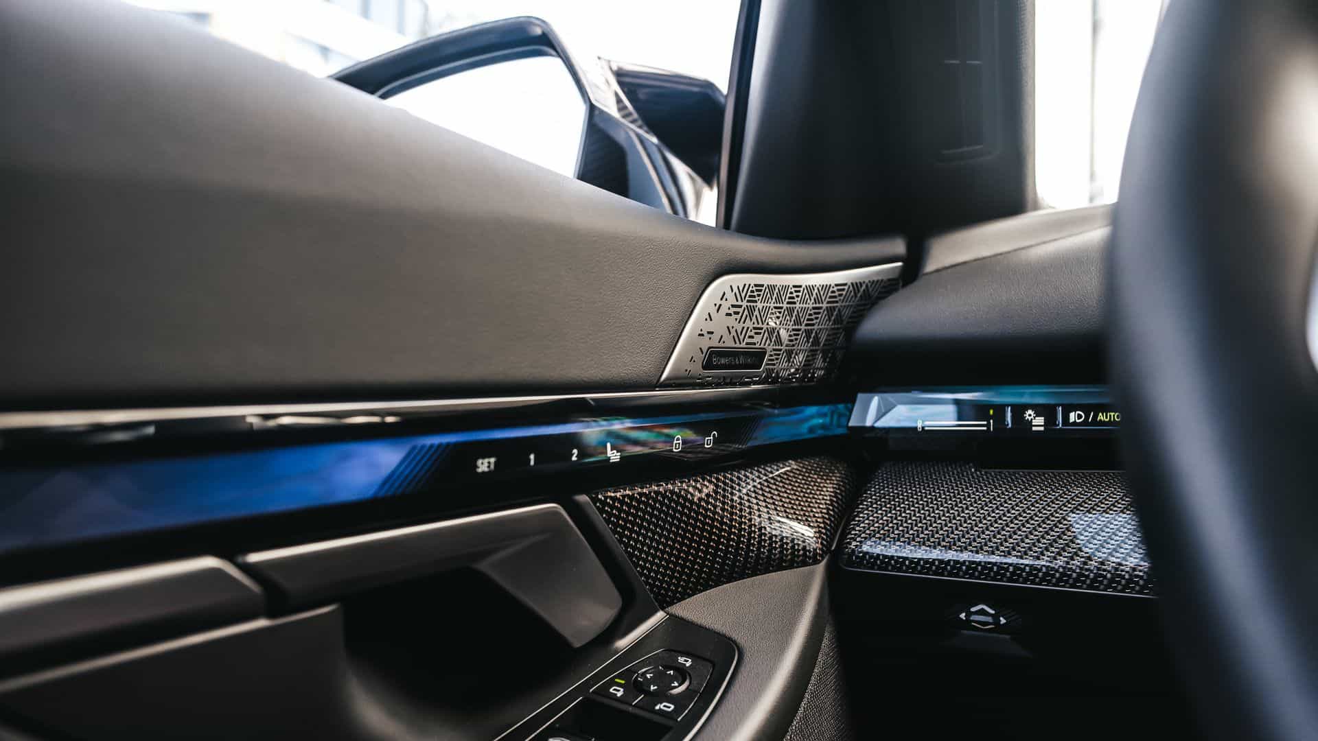 From the split spoiler lip at the front to the diffuser at the back, this electric 5er has it all. Those side sill extensions are also of the carbon fiber variety, which is the same we can say about the mirror caps. BMW also sells the large luxury sedan with an antenna that uses aramid. It’s a composite material that looks like carbon fiber. On the more practical Touring model, the rear spoiler boasts a carbon fiber fin.