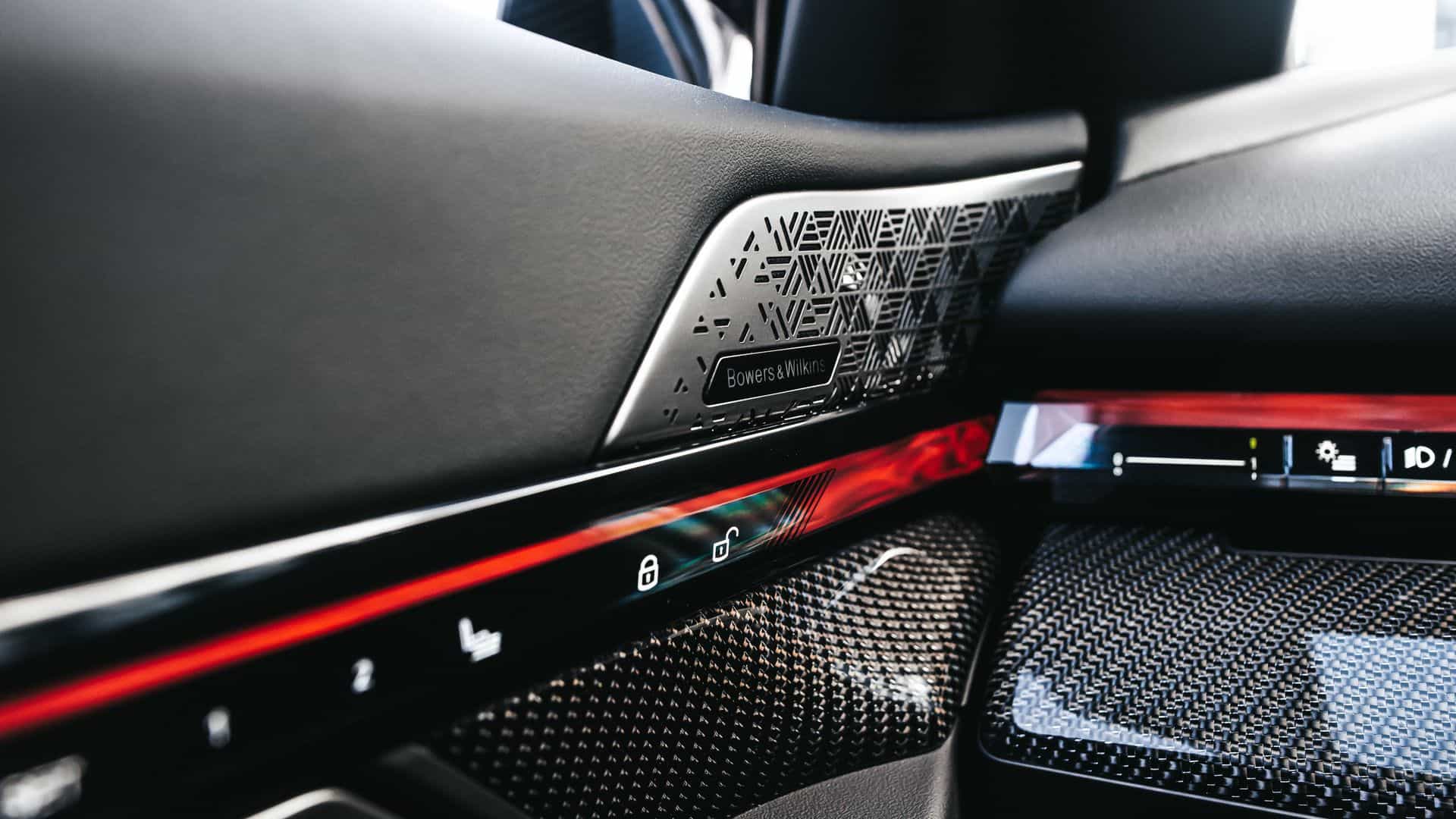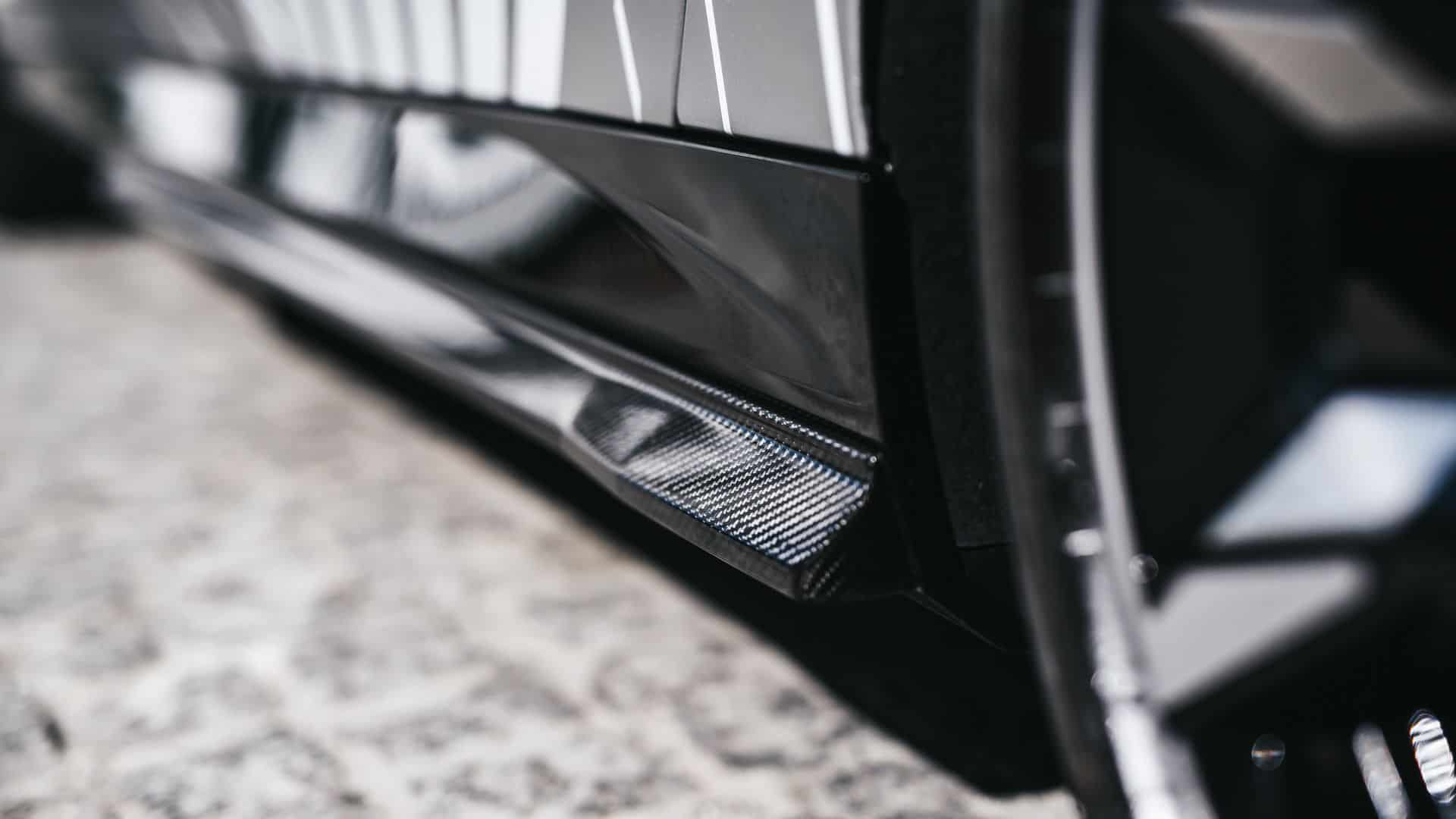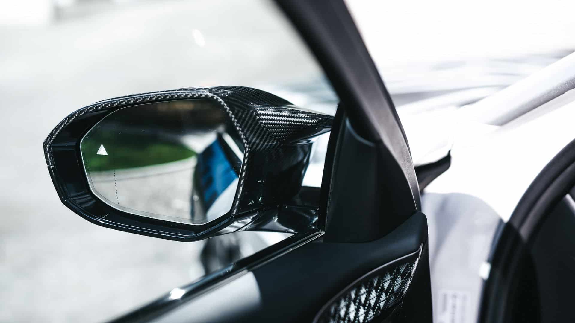 From the split spoiler lip at the front to the diffuser at the back, this electric 5er has it all. Those side sill extensions are also of the carbon fiber variety, which is the same we can say about the mirror caps. BMW also sells the large luxury sedan with an antenna that uses aramid. It’s a composite material that looks like carbon fiber. On the more practical Touring model, the rear spoiler boasts a carbon fiber fin.