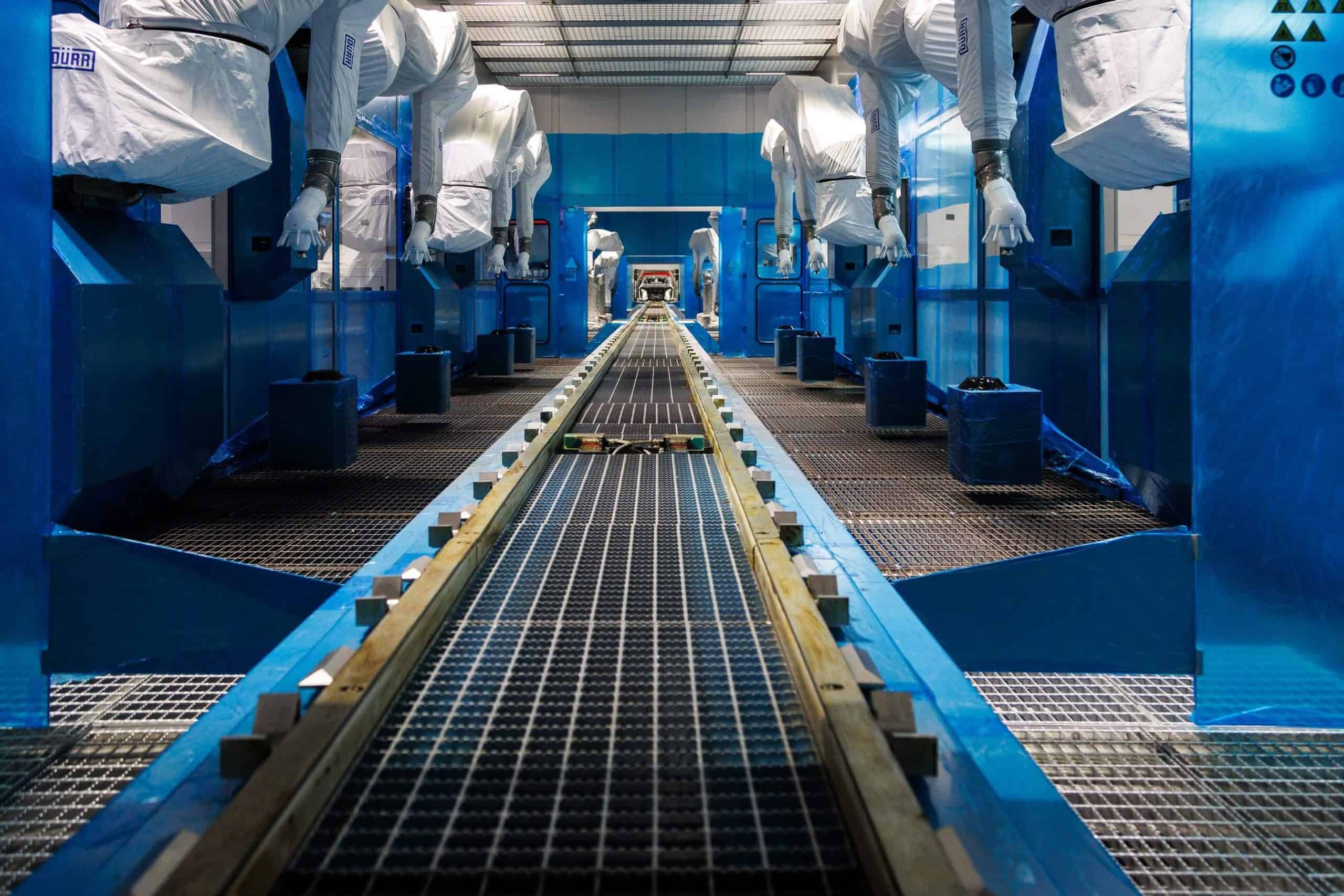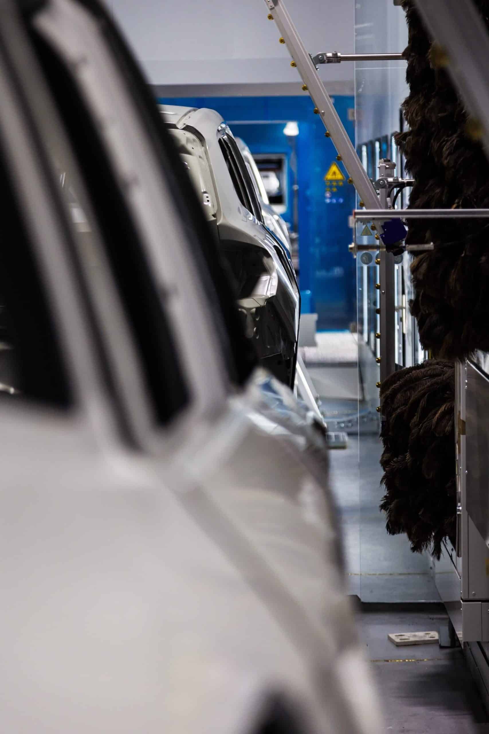 The paint shop spans 33,000 square meters and uses hot water heated at 65 degrees Celsius (149 degrees Fahrenheit) rather than the usual 90-120 degrees Celsius (194-248 degrees Fahrenheit). The water is used to supply the hall ventilation systems that provide a temperature of 22 degrees Celsius (71.6 degrees Fahrenheit) in the spray booths. Humidity has been set at 60-65%. The spray booth uses up to 90% recirculating air as only 10% has to be temperature controlled and humidified.