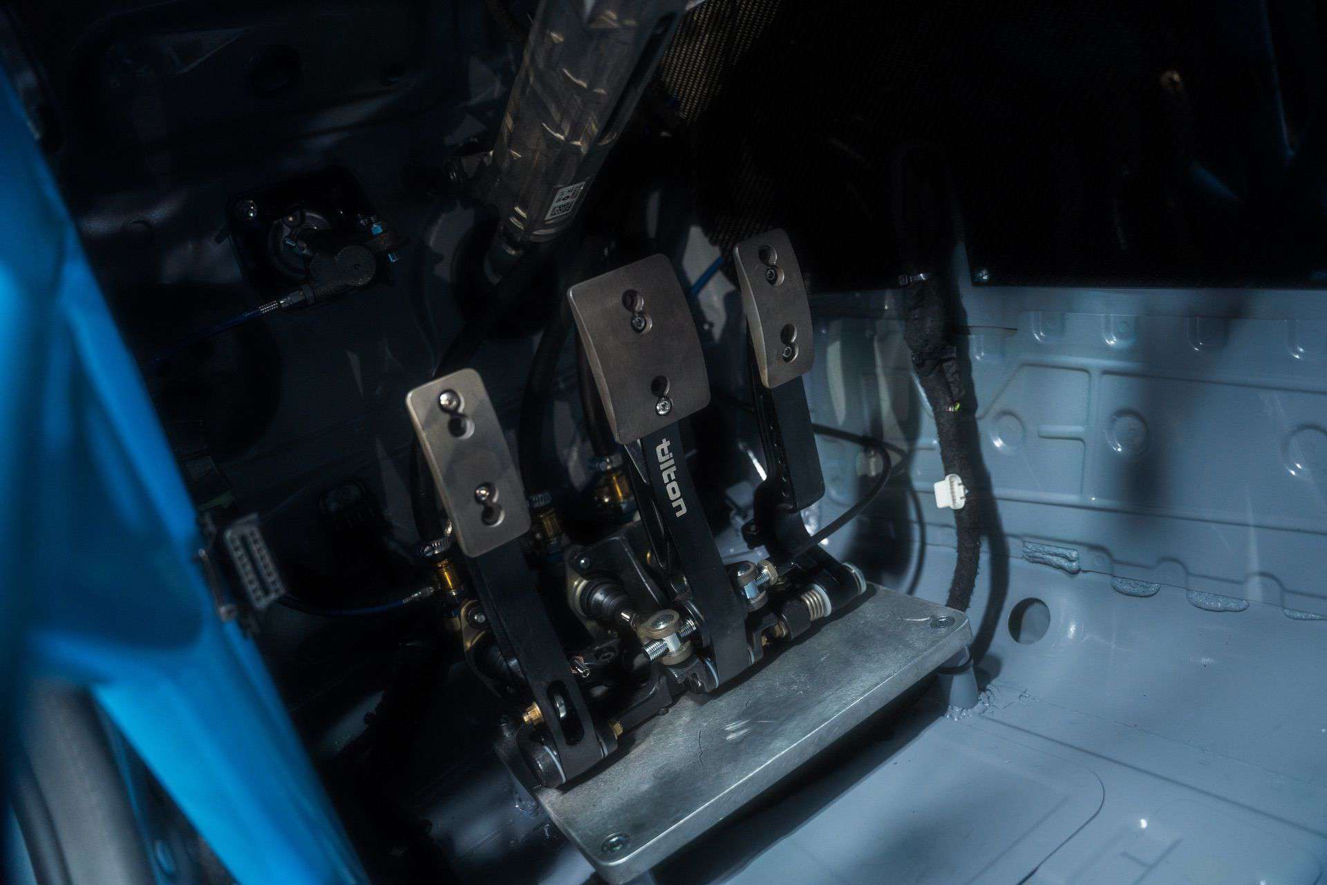 There’s now a Pikes Peak-spec full roll cage and a redesigned carbon fiber dashboard with plenty of buttons for various functions. Some controls are configurable for quicker access during a race. Although the rear doors are still there, the cabin is now strictly a two-seat affair with body-hugging Sabelt bucket seats and a racing harness.