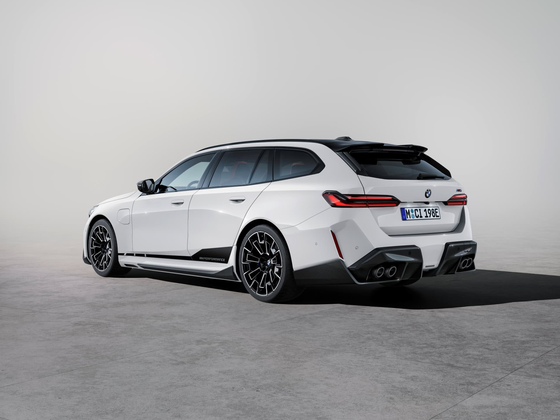 A two-section rear diffusor in carbon fiber gives the already somewhat outlandish, angular design an even more motorsport-inspired look. As is tradition, it pairs with carbon fiber exhaust tips (and likely an M Performance Exhaust…soon?). BMW also tacks on what they call “rear fins” but everyone else will call a roof spoiler. It’s perhaps the most welcome addition, as it’s the most effective at making the wagon look like the ridiculous rally-ready rampager we know someone already wants to turn it into.