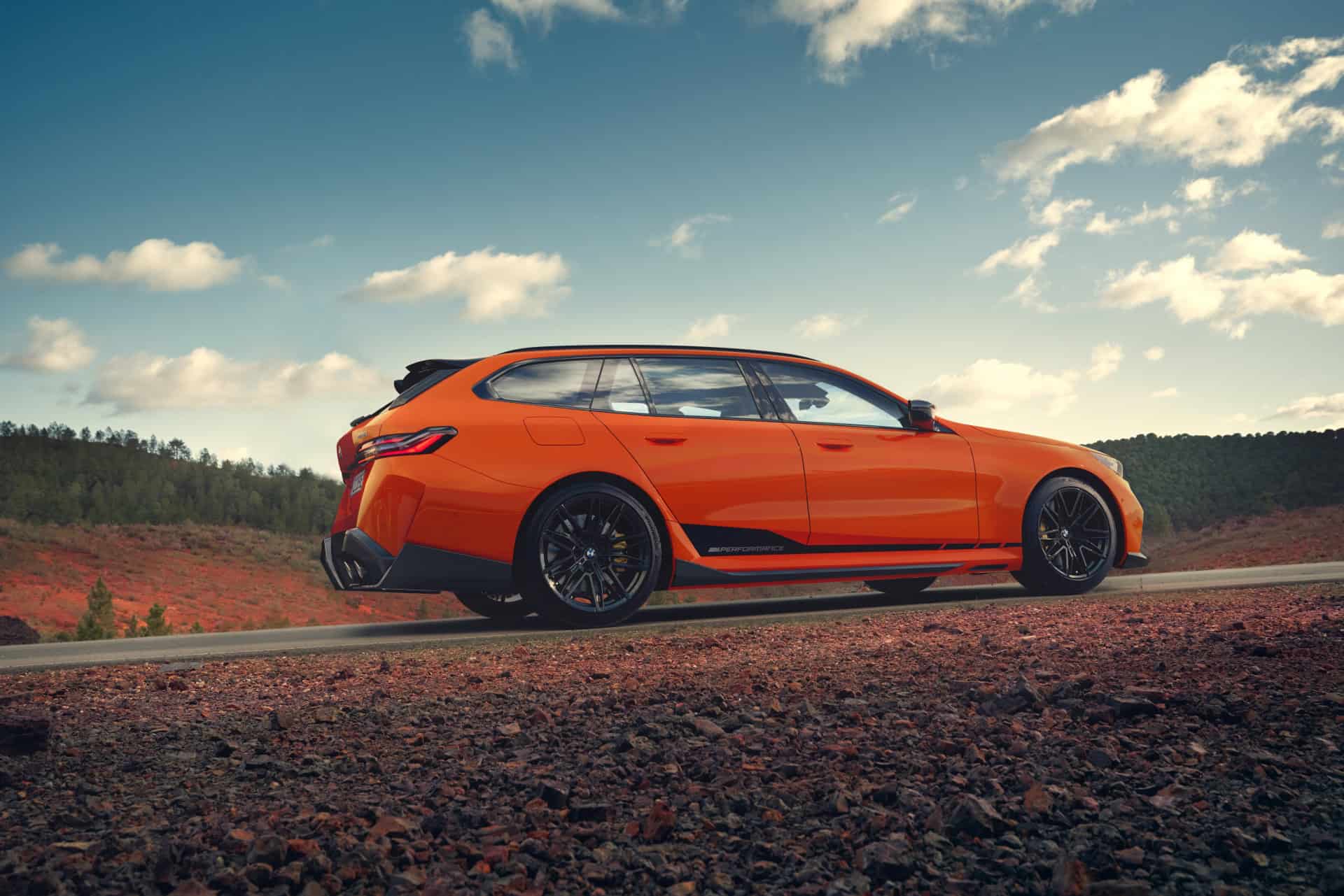 The M5 Touring is already a pretty radical ride, but it gets even better when BMW offers a cornucopia of M Performance Parts to add to the drama. The already extremely eye-catching wagon gets a little bit flashier, with crazy ground effects, chunky spoilers, and big M Performance decals that stretch the length of the long-roof. What’s better is we even get a peak at what the car looks like in Fire Orange – one of the coolest BMW Individual colors ever offered.