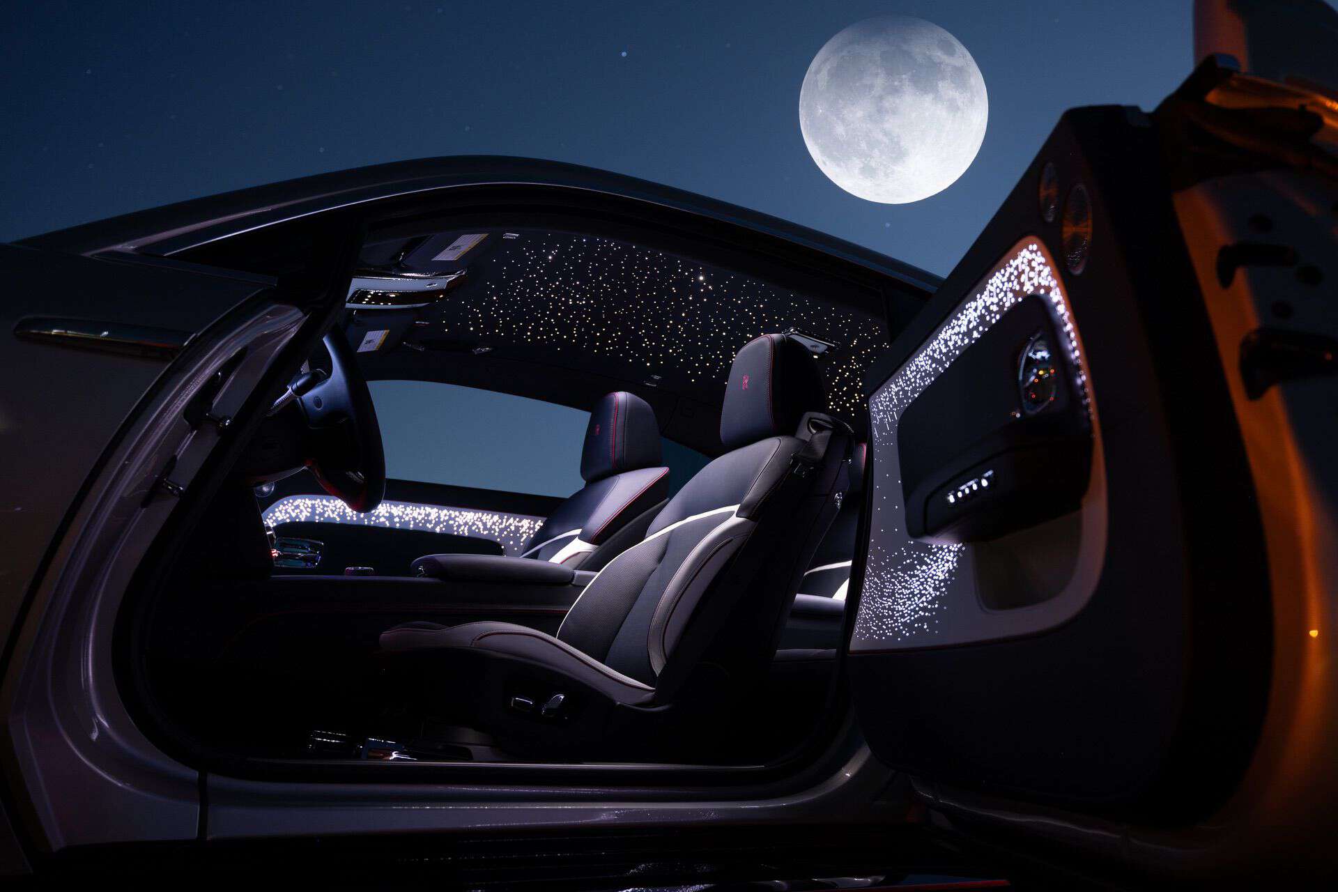 Rolls-Royce doubled down on Bespoke goodies by applying its special touch inside the lavish cabin. The interior blends Navy Blue, White, and Peony Pink accents as a nod to the shades noticeable during a lunar halo. It wouldn’t be a proper RR without the glitzy Starlight headliner, complimented by illuminated stars baked into the extra-long doors.