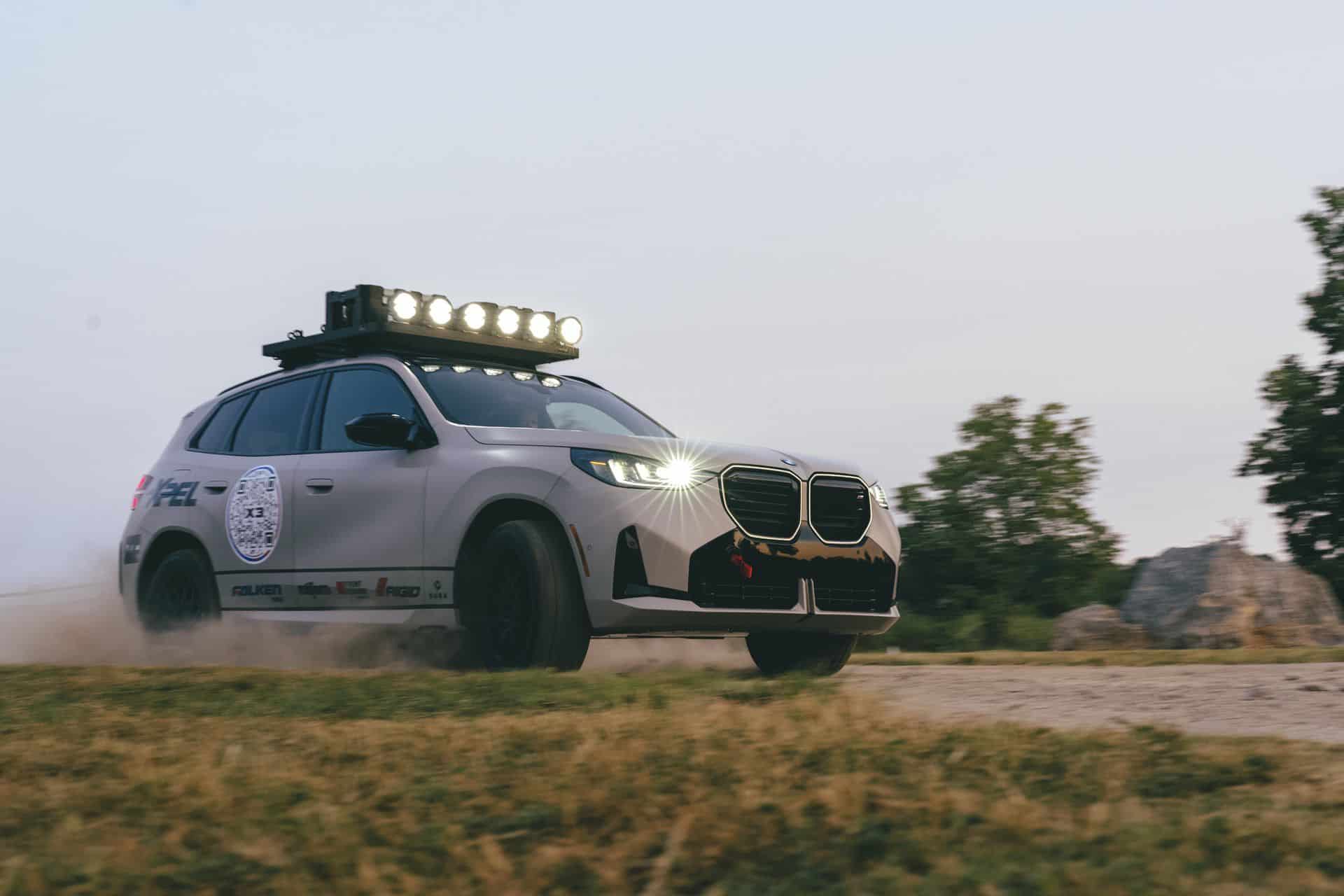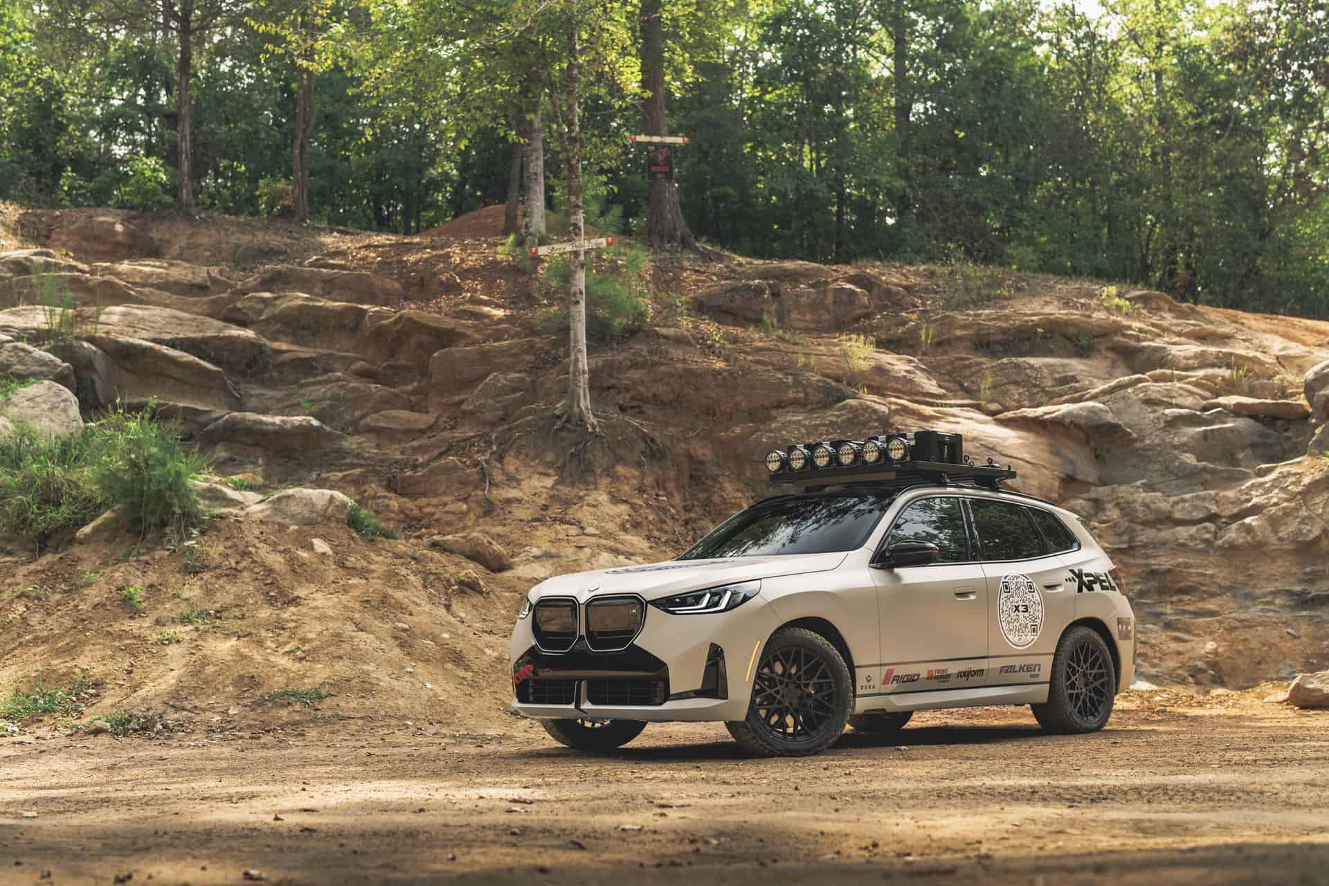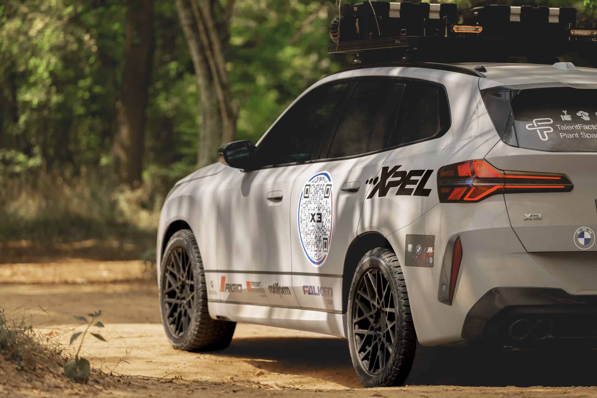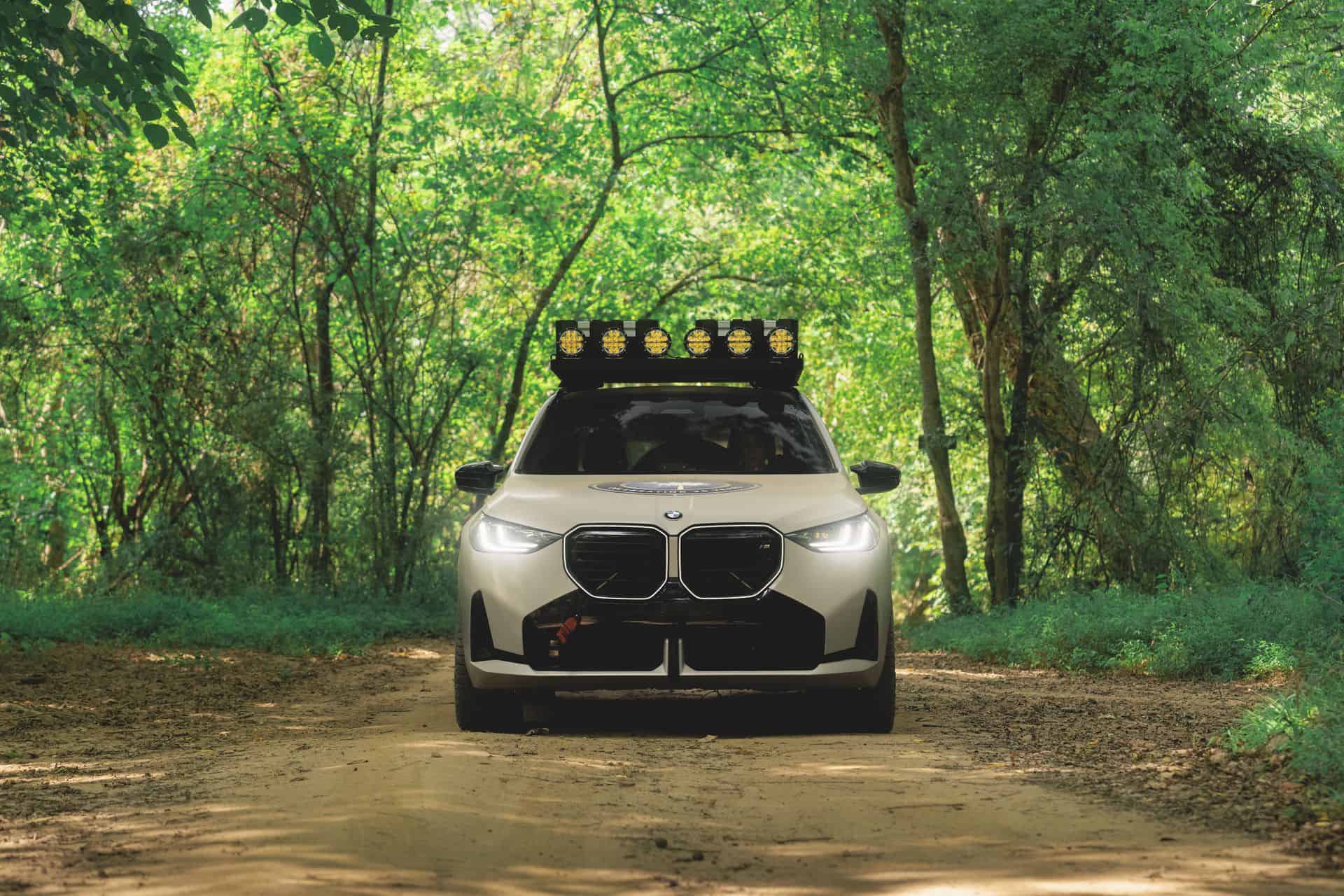 As you can tell, the original wheels are also gone, in favor of an aftermarket Rotiform BLQ-C set. Since deliveries of the normal 2025 X3 M50 haven’t even started yet, the rally-ready M50 is actually a pre-production model. It’s significantly more practical than a standard model by having a roof rail rack kit, storage boxes, and duffle bags. A nifty LED bar plus extra amber rear lights were also added, mirroring what last year’s X2 M35i had.