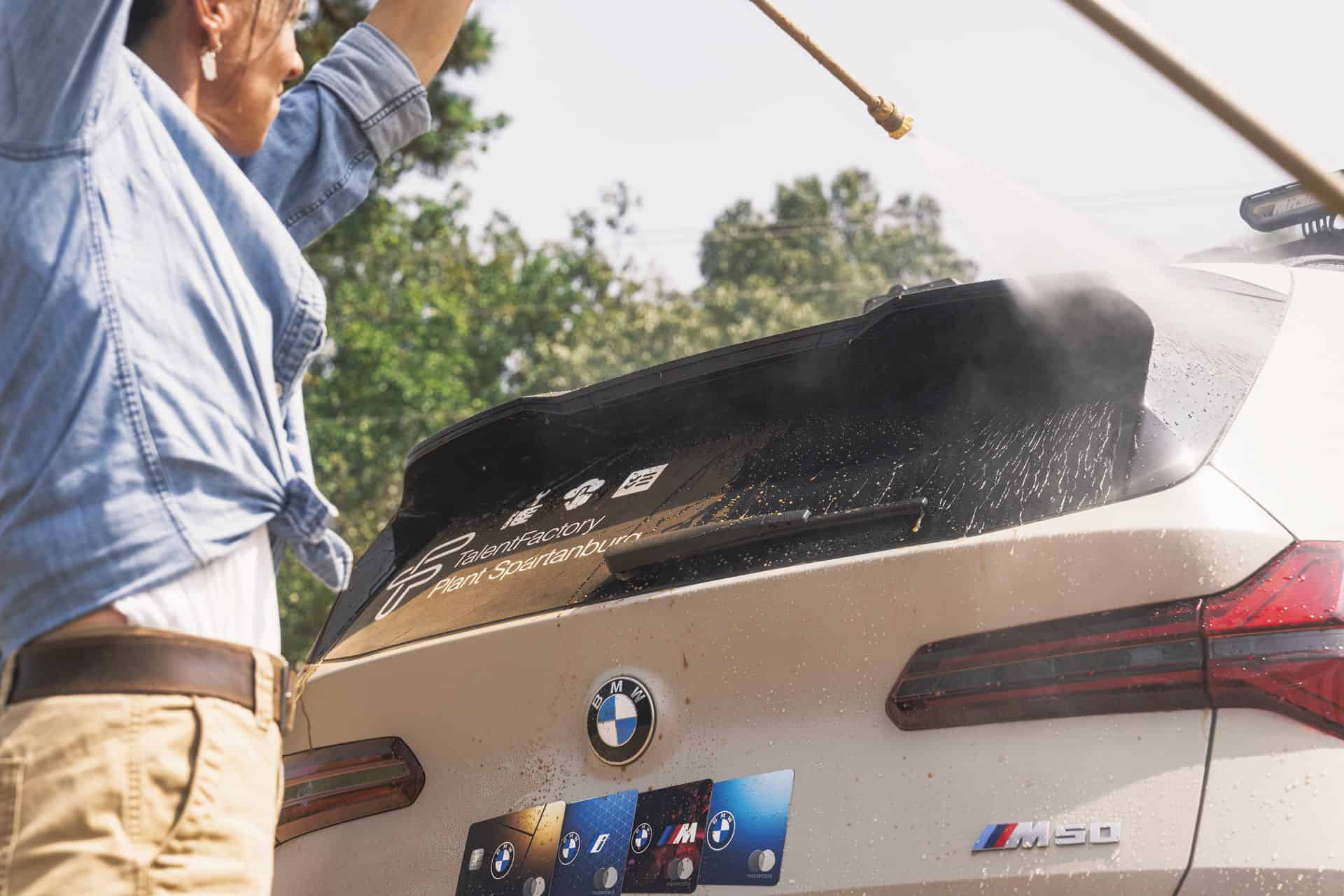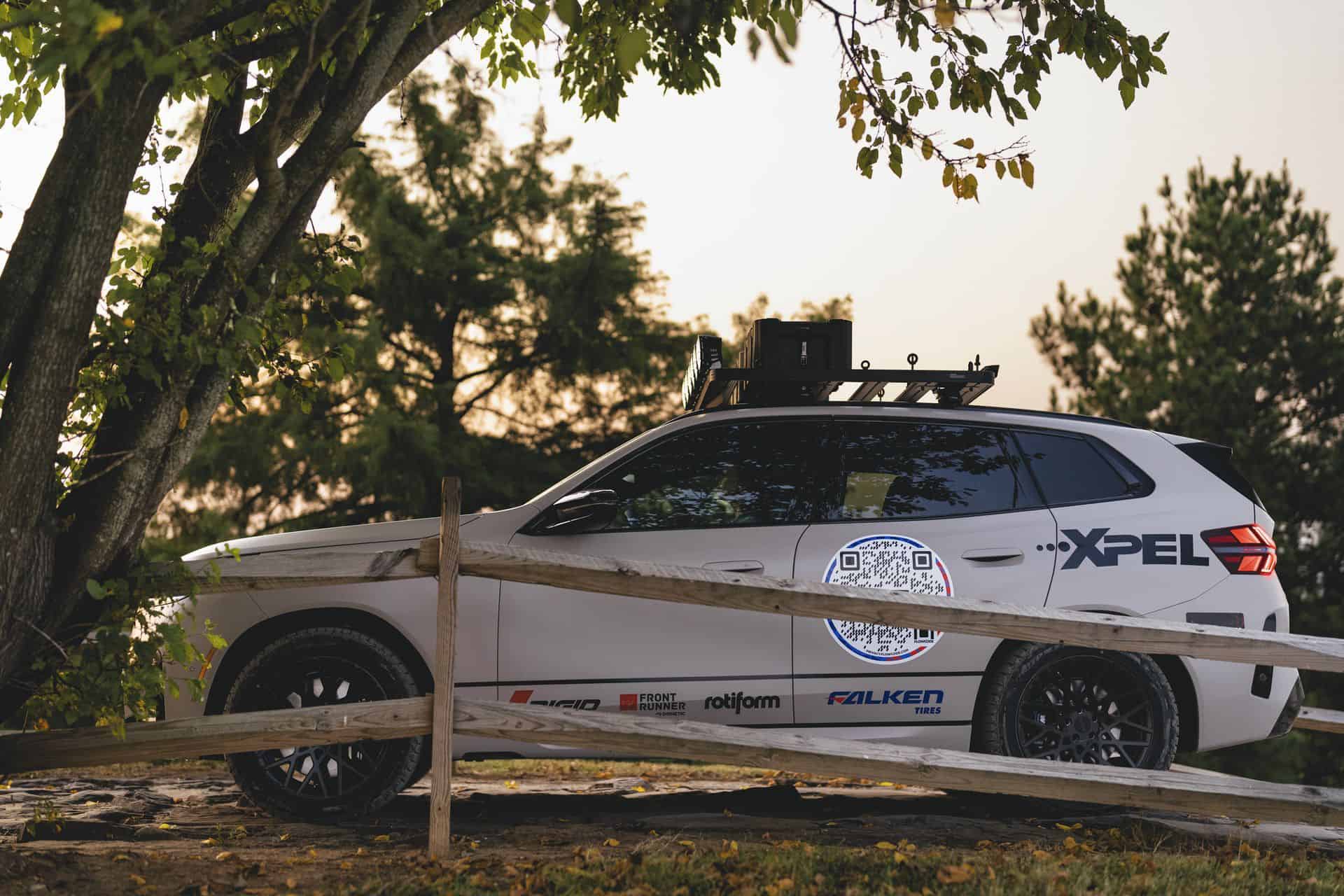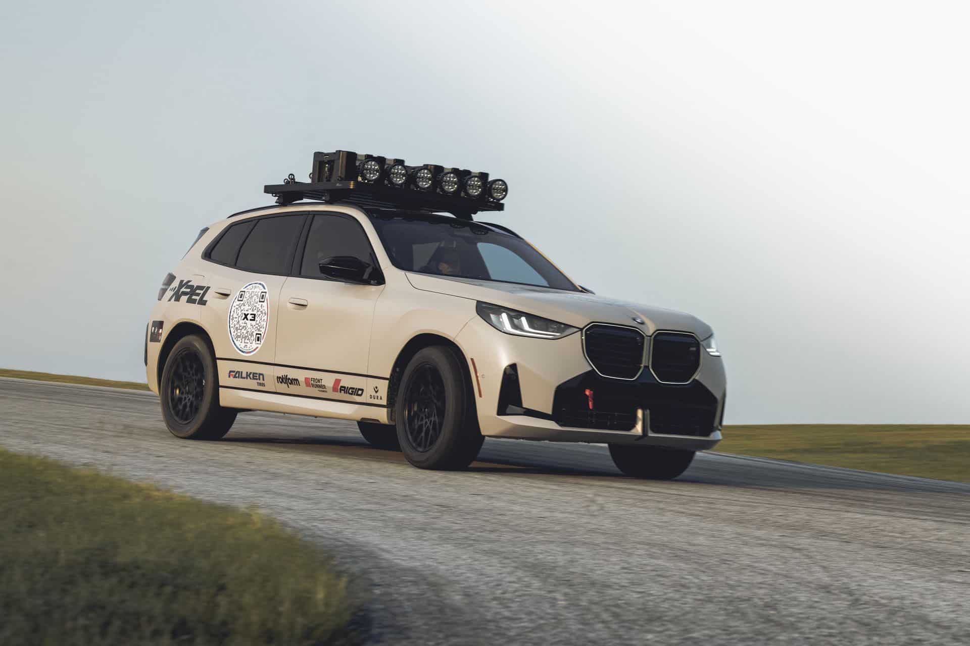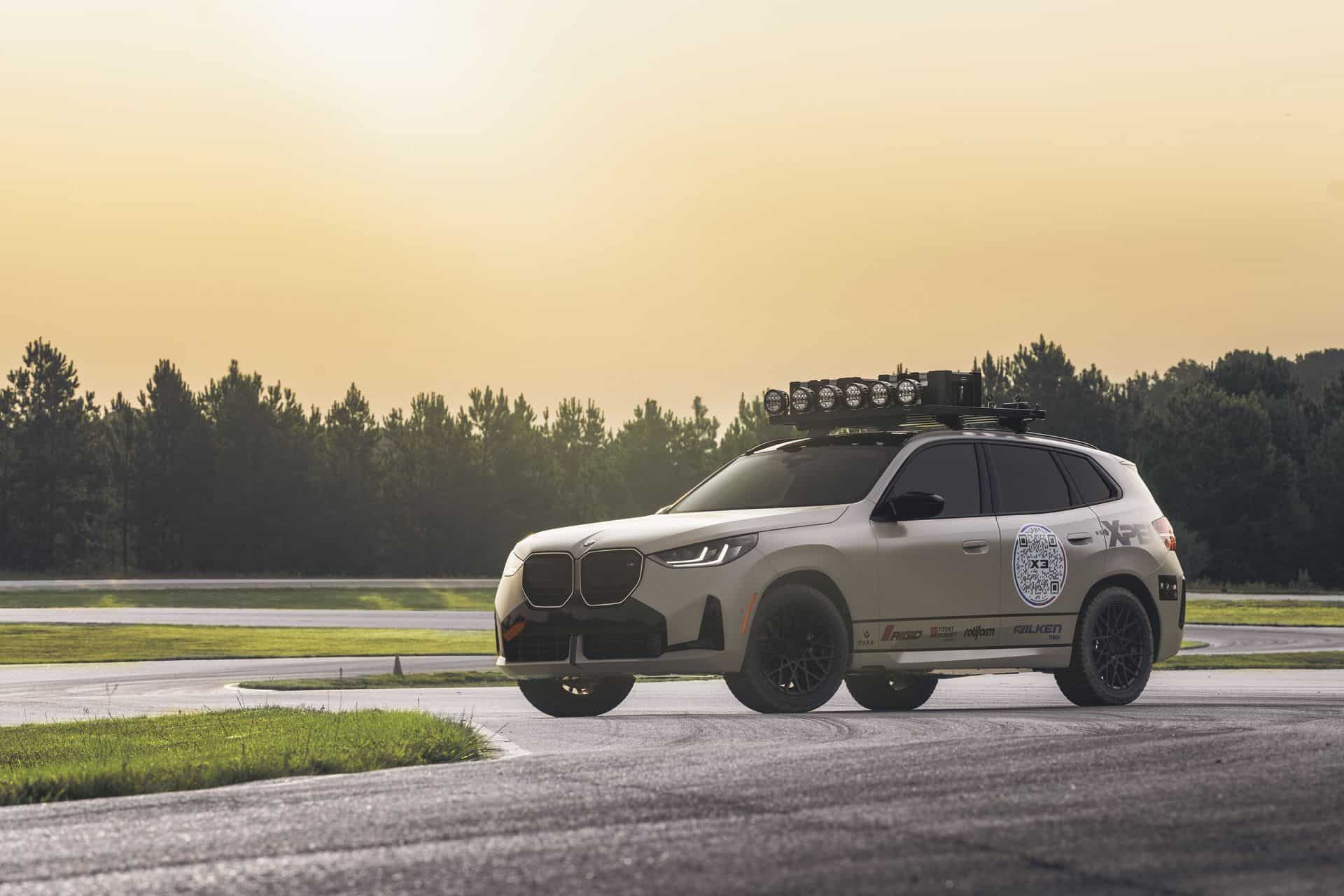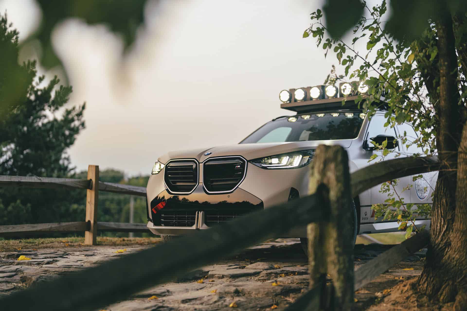 As you can tell, the original wheels are also gone, in favor of an aftermarket Rotiform BLQ-C set. Since deliveries of the normal 2025 X3 M50 haven’t even started yet, the rally-ready M50 is actually a pre-production model. It’s significantly more practical than a standard model by having a roof rail rack kit, storage boxes, and duffle bags. A nifty LED bar plus extra amber rear lights were also added, mirroring what last year’s X2 M35i had.