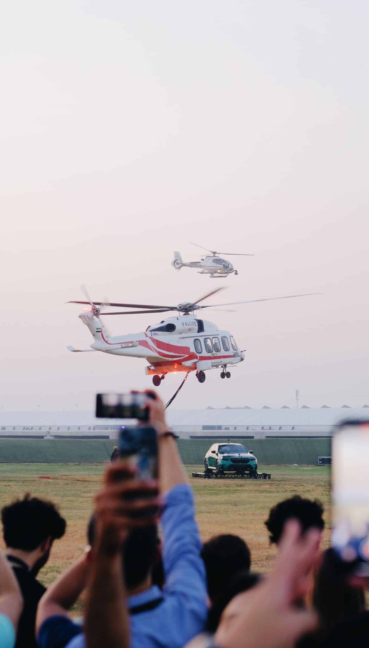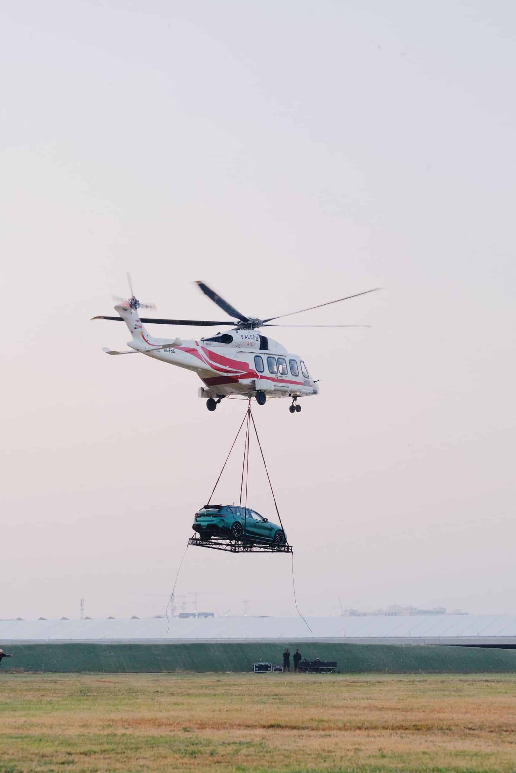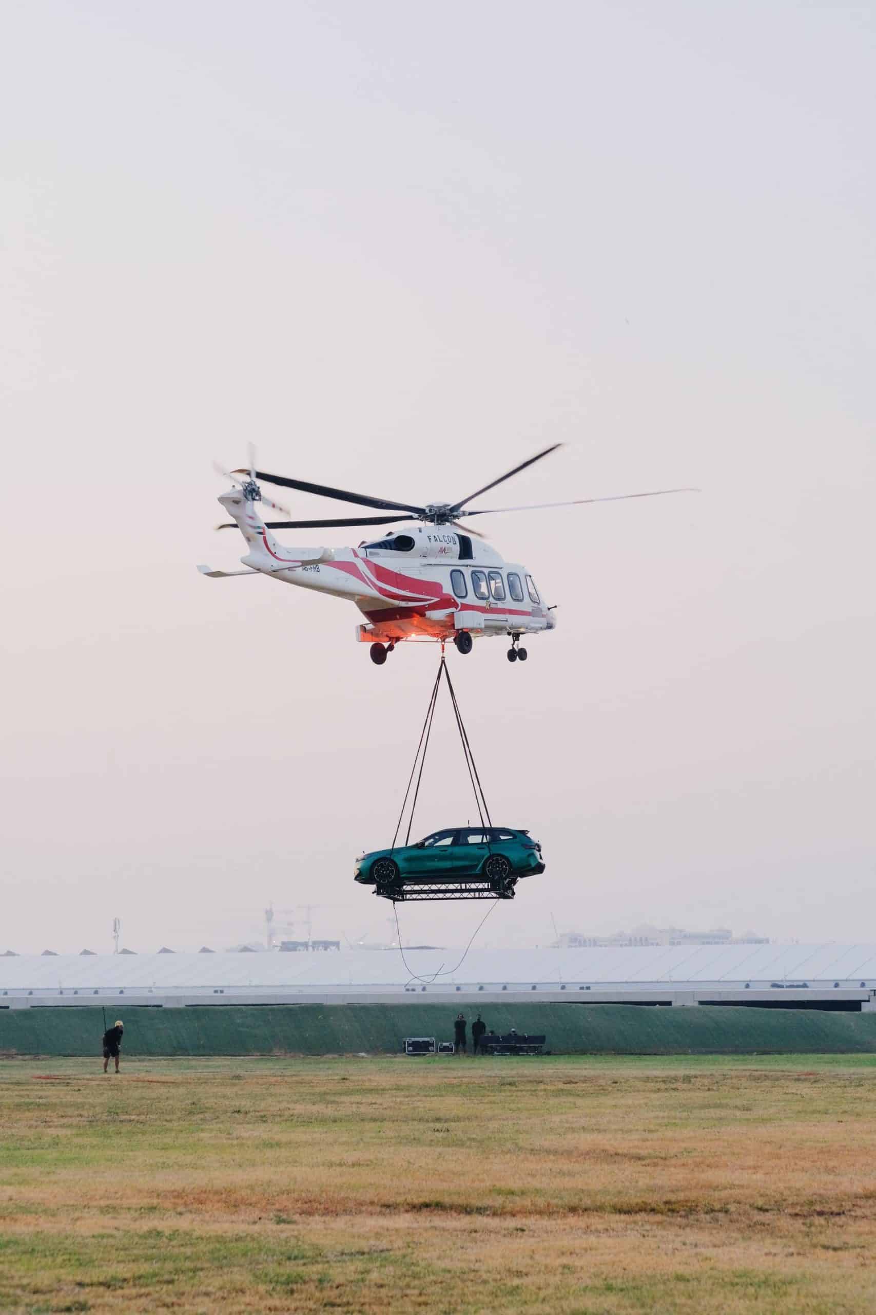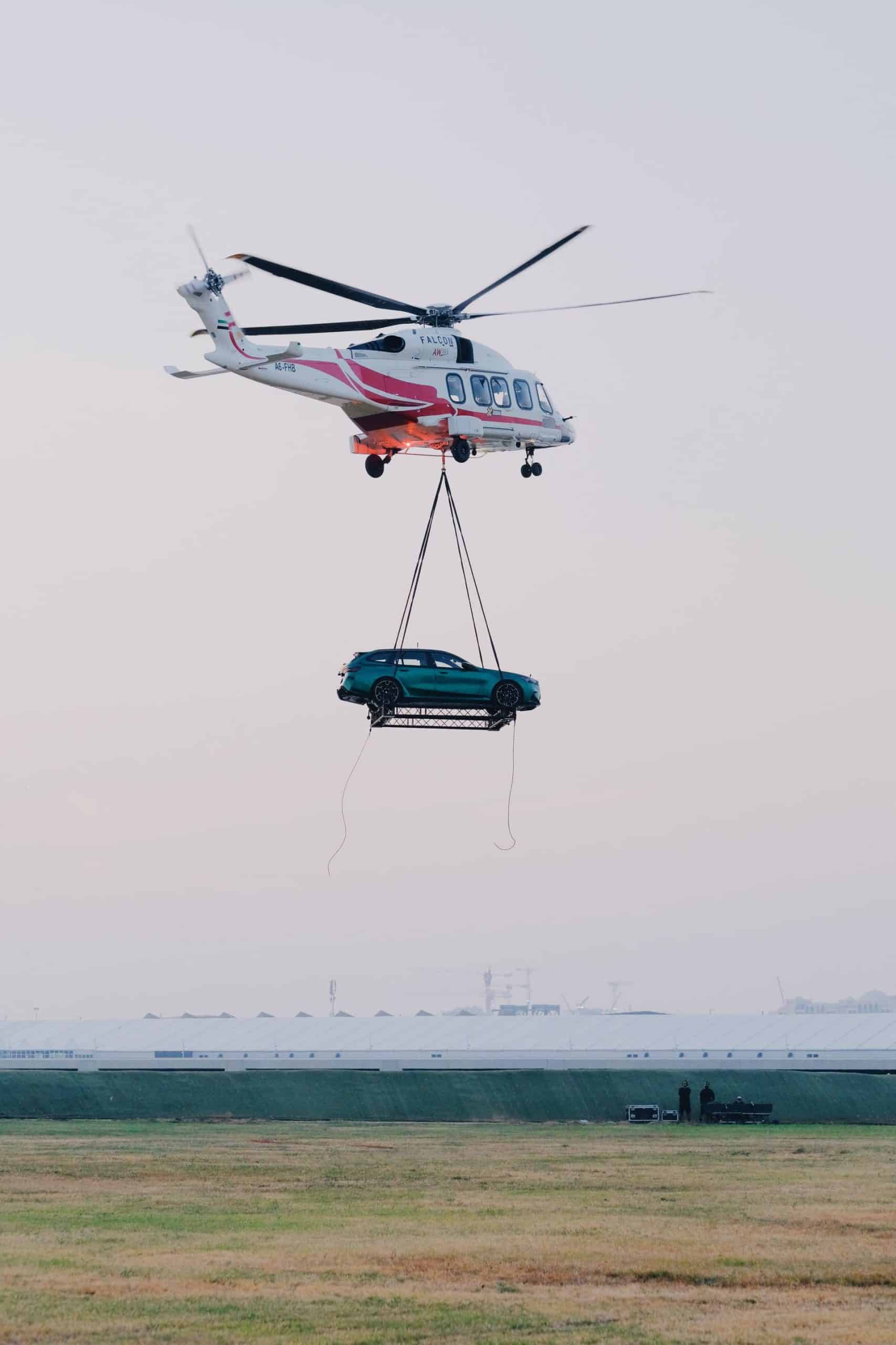 It’s not every day we see a car up in the air while being carried by a helicopter. Once it landed on the makeshift “helipad” on a field, the M5 wagon was removed from the special platform and drove off to the designated area where the event took place. Once it got there, it was accompanied by several other M5s.
