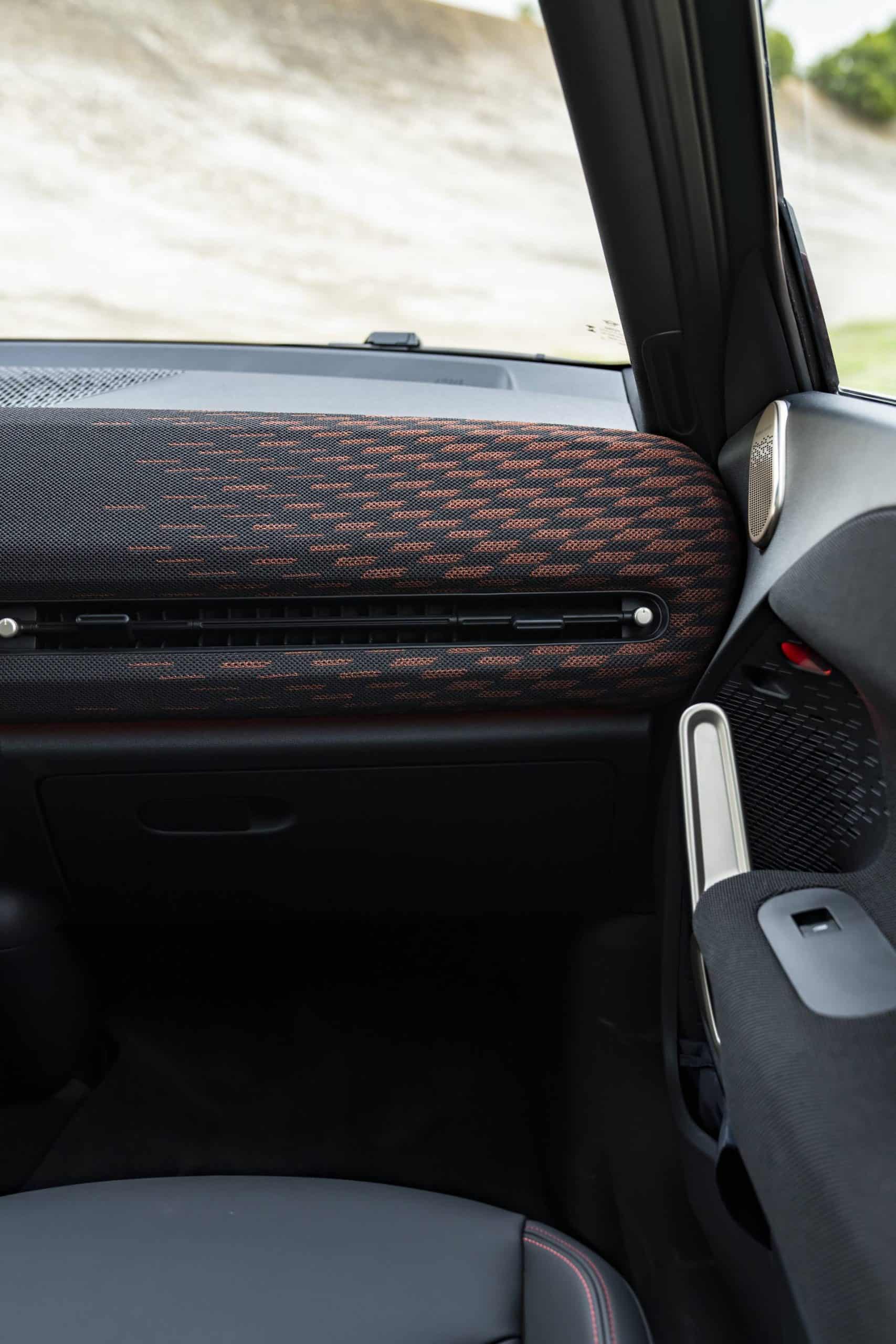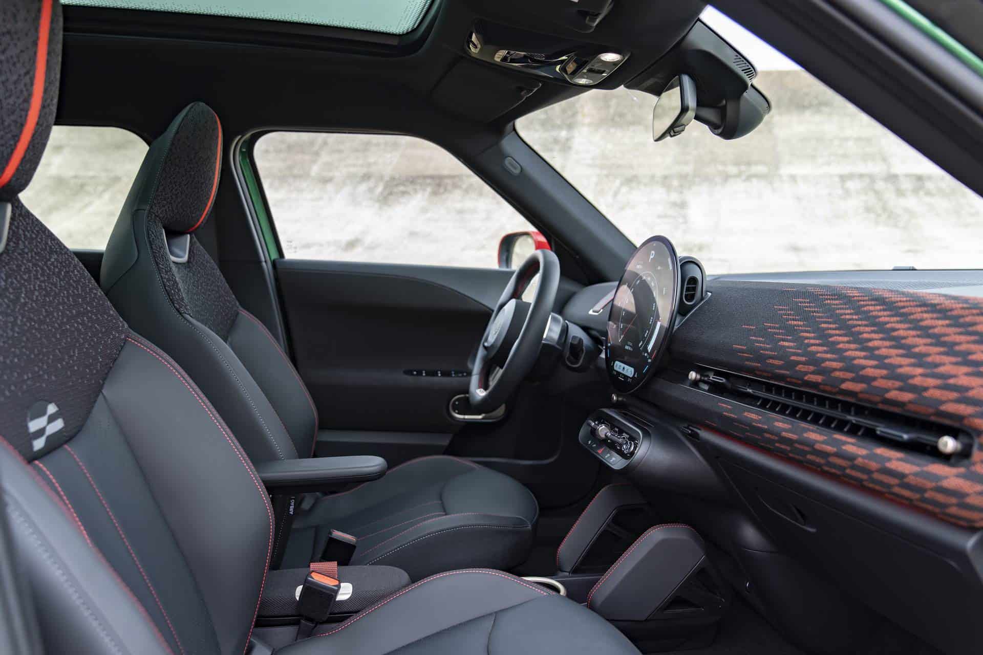 How can you tell the true JCW apart from the Aceman (J05) in the JCW trim level? Well, it’s not easy since the two flavors of the subcompact crossover look almost identical. It does have more red accents and a checkered flag motif on the tailgate. In addition, those 19-inch wheels are exclusive to the sportier version. Not much has changed inside, although the headliner now has illuminated graphics.