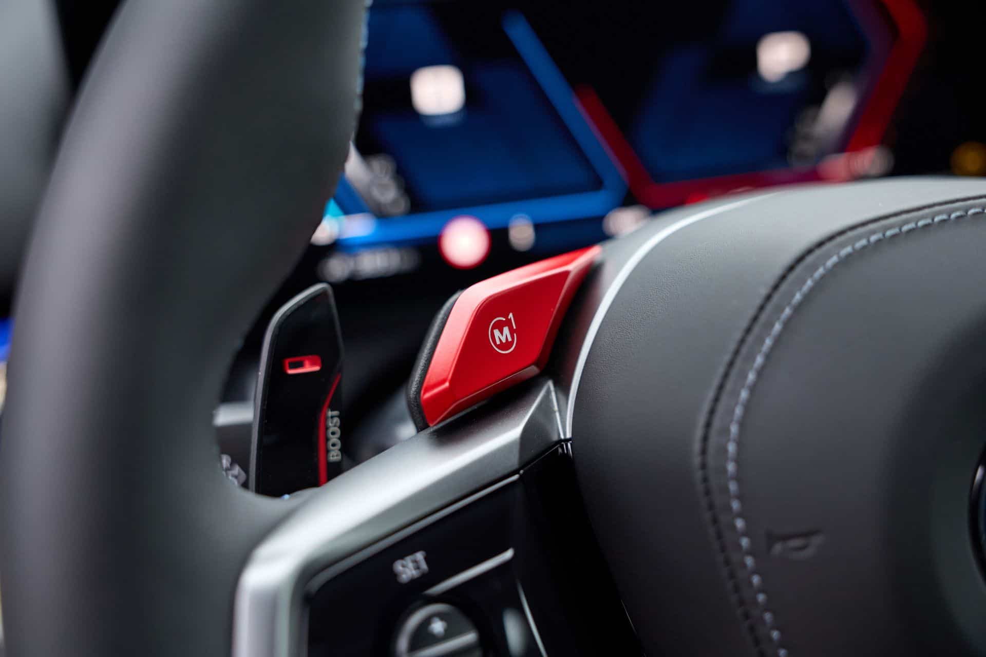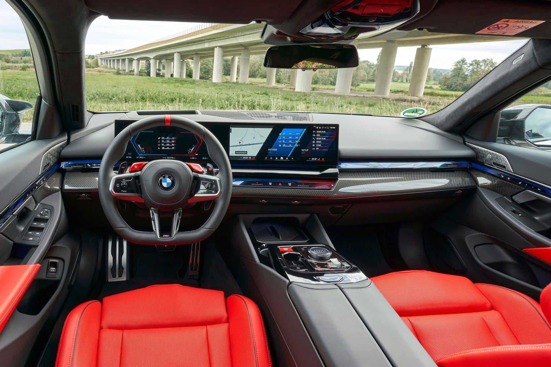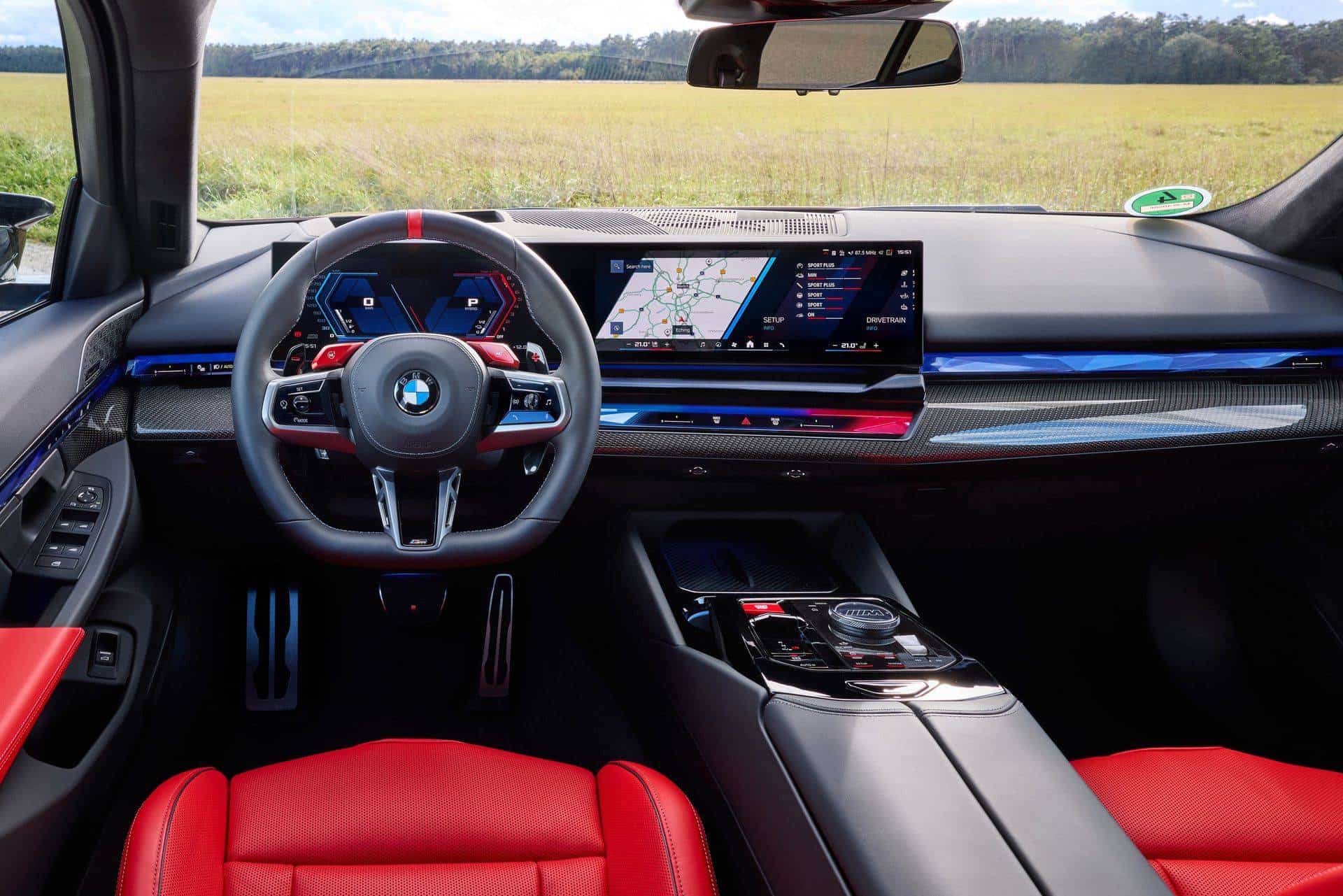 Customers willing to go all out can combine one of the many Individual paint jobs with a striking color for the upholstery. In the adjacent images, you can see how the M5 Touring’s interior looks with Merino Red/Black leather. Alternatively, you can opt for Kyalami Orange/Black. Other choices include plain Black (also featured here) and Silverstone/Black.