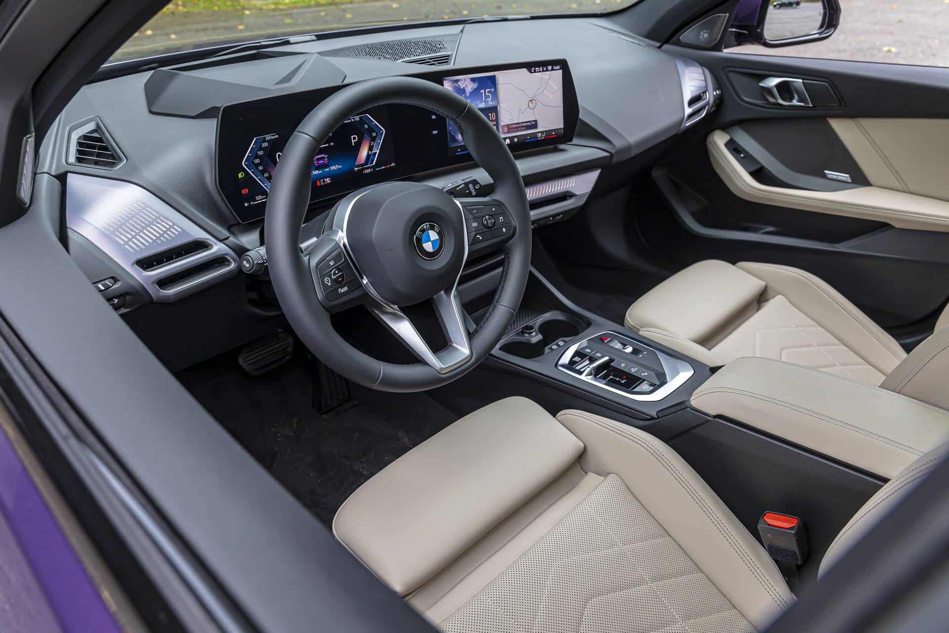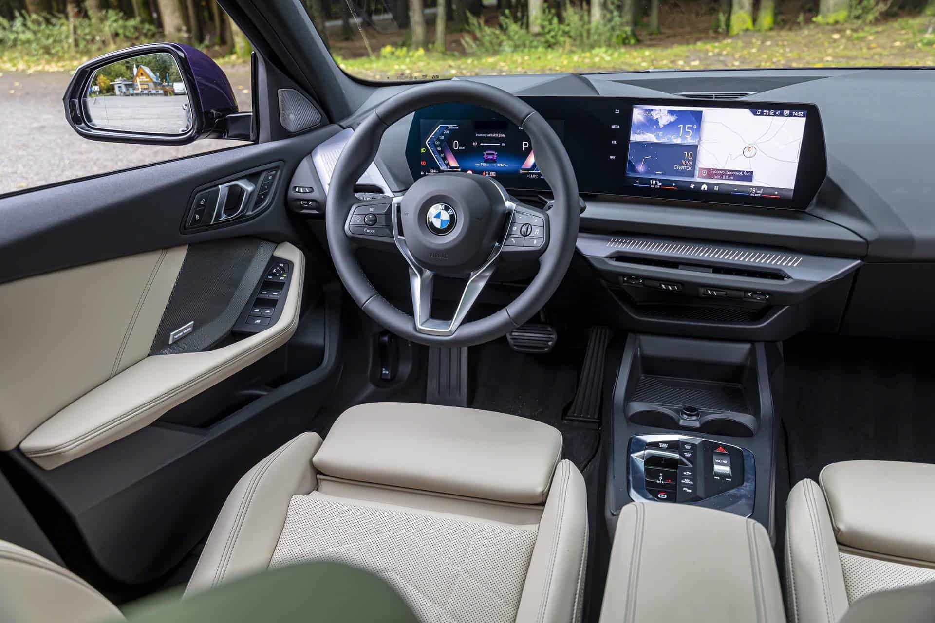 A leather-free interior comes as standard in the 2025 1 Series, which gets standard seats wrapped in Arktur fabric. The optional sports seats are covered in Econeer fabric upholstery. The interior of this particular 120 offers comes with the Veganza material in Oyster. This vegan leather alternative offers a modern, eco-conscious choice for buyers.