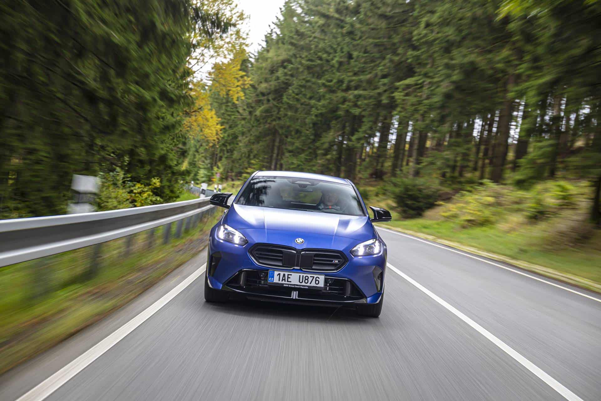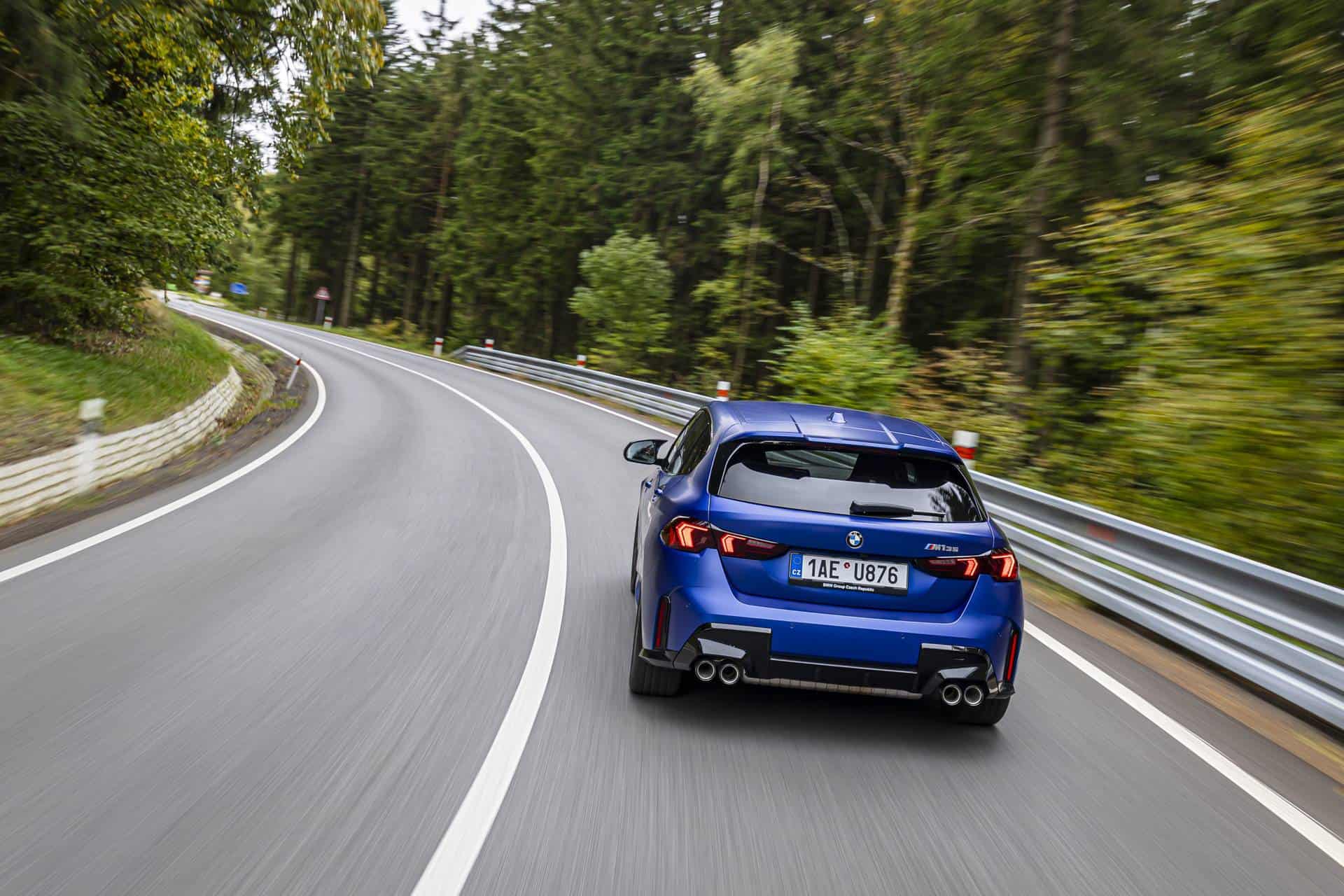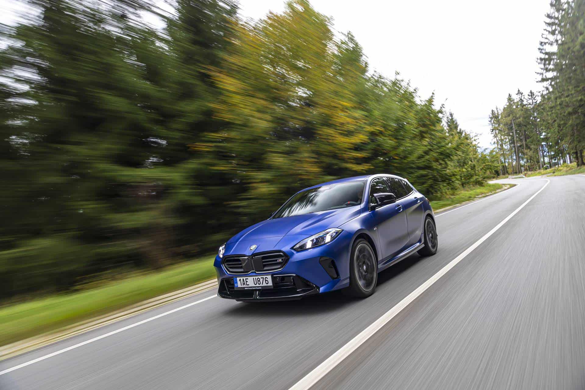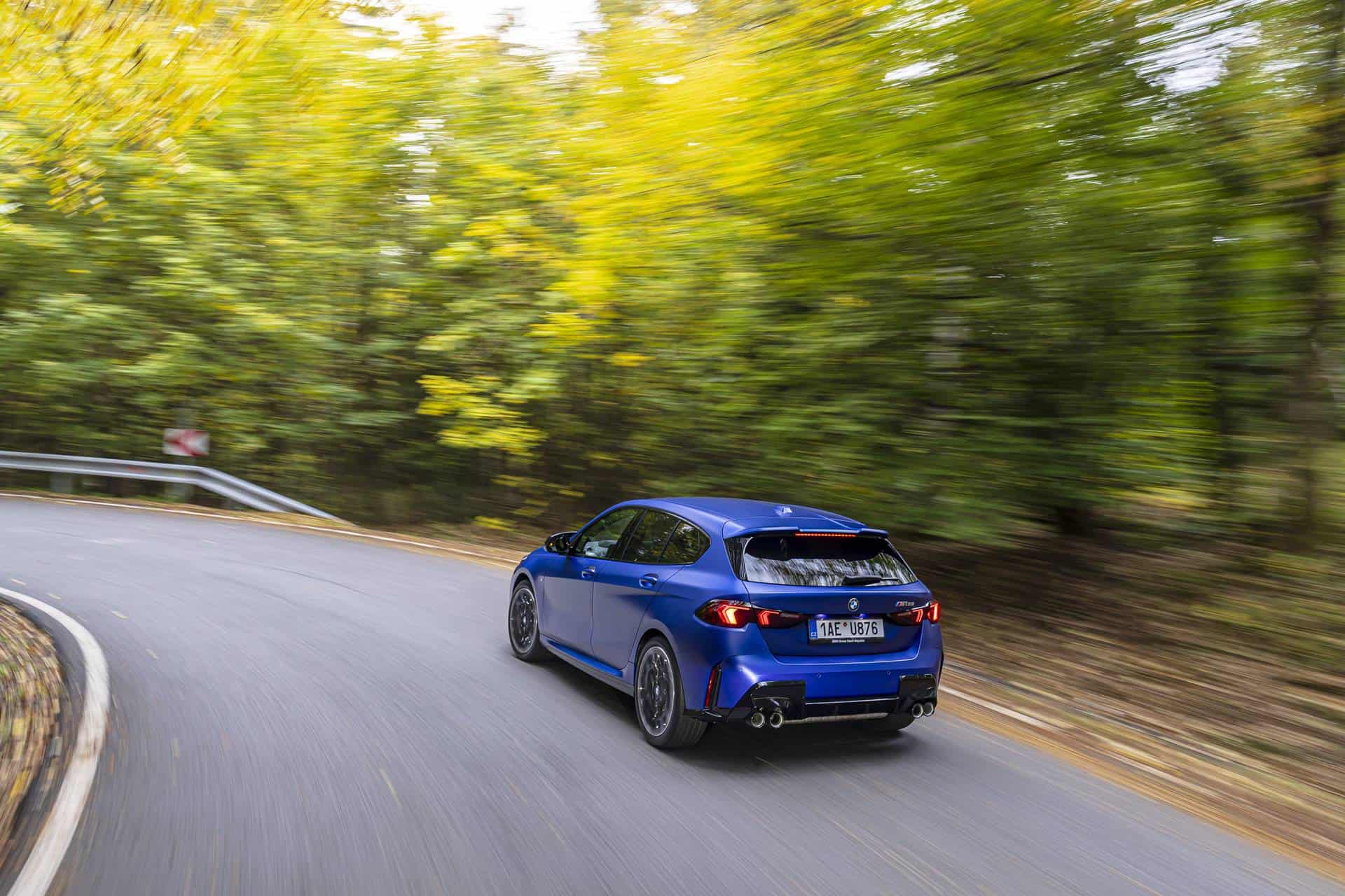 For starters, we’re dealing with the king of the hill – the M135. The hot hatch gets an Individual matte paint (Frozen Portimao Blue) and optional 19-inch wheels with M compound brakes. The blue accents inside the headlights are reserved for the adaptive lights with a matrix high beam. You’re not paying extra for the quad exhaust since it’s standard on BMW’s compact M Performance cars.
