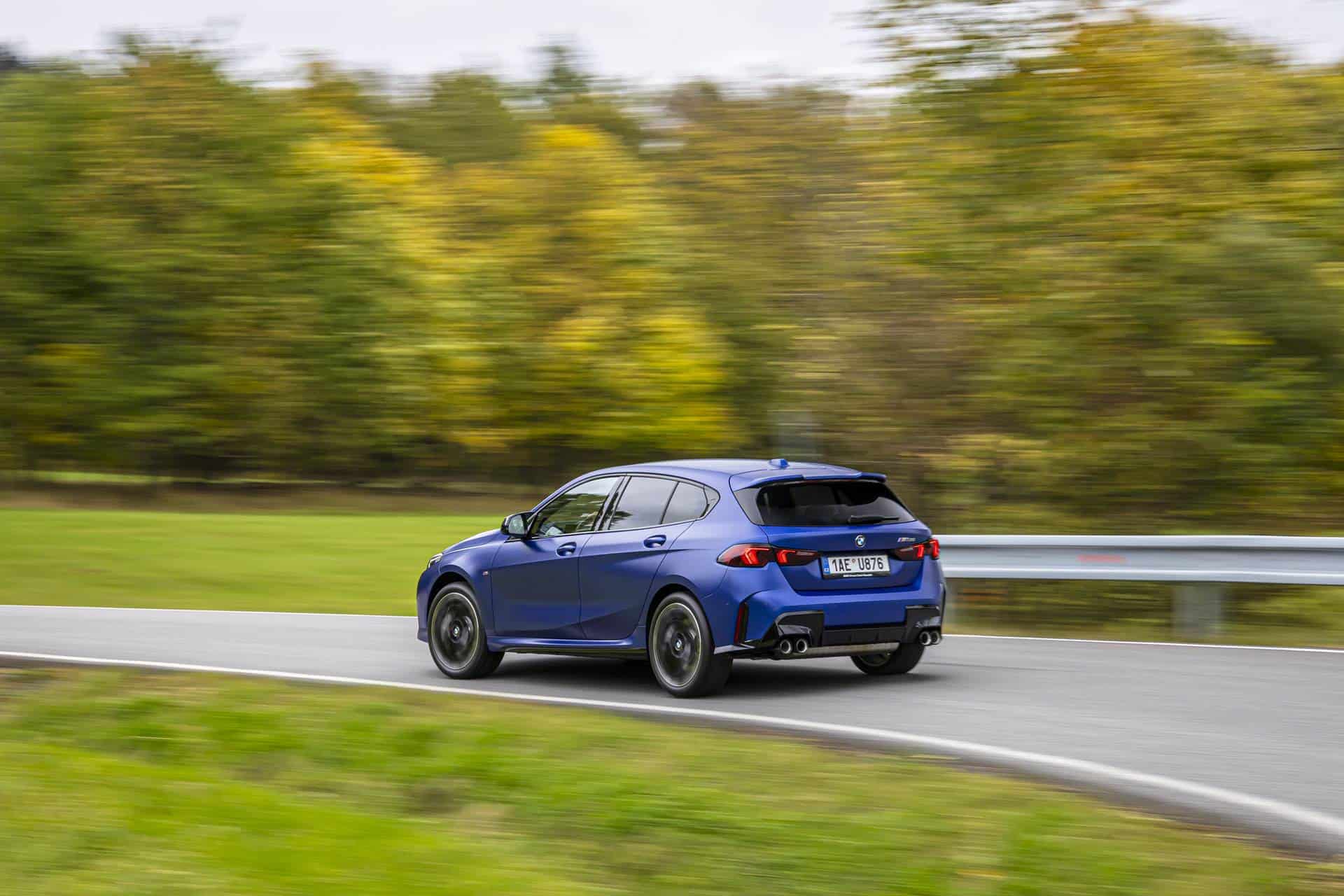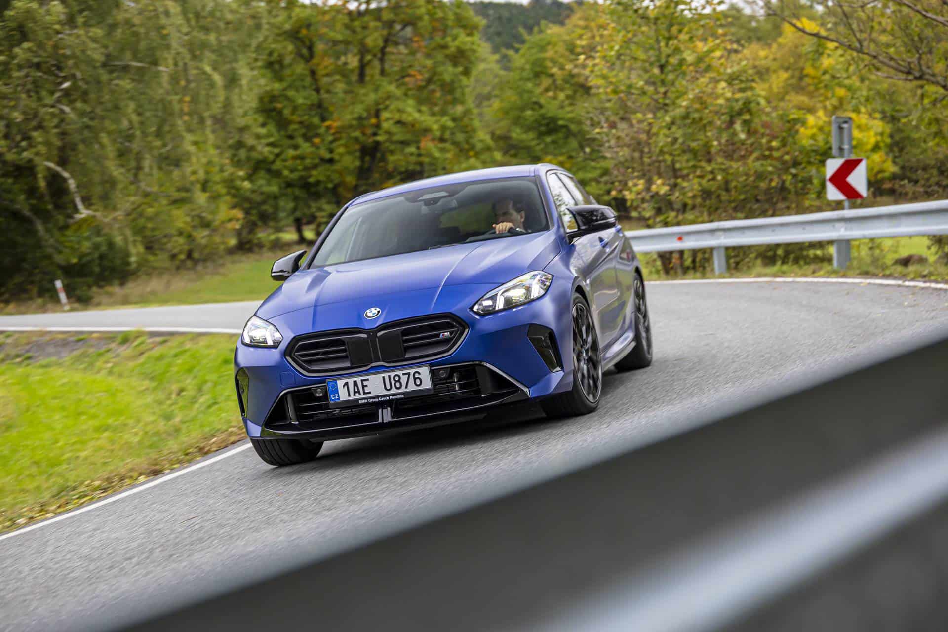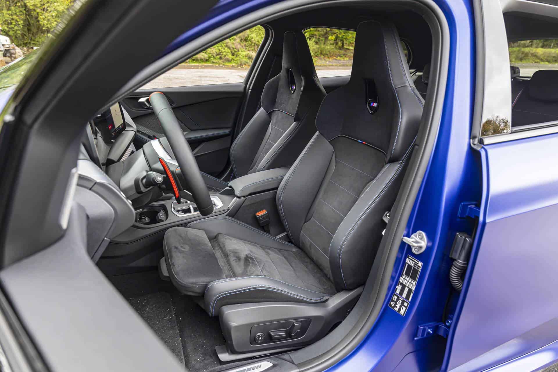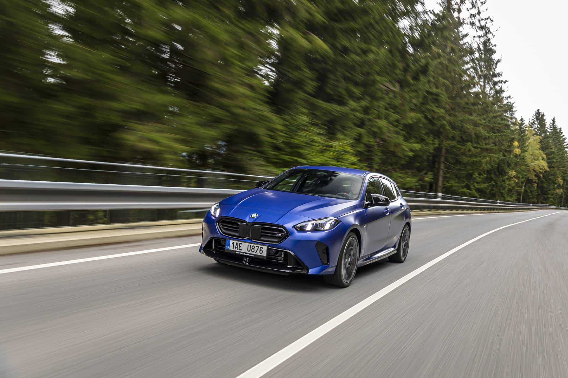 For starters, we’re dealing with the king of the hill – the M135. The hot hatch gets an Individual matte paint (Frozen Portimao Blue) and optional 19-inch wheels with M compound brakes. The blue accents inside the headlights are reserved for the adaptive lights with a matrix high beam. You’re not paying extra for the quad exhaust since it’s standard on BMW’s compact M Performance cars.