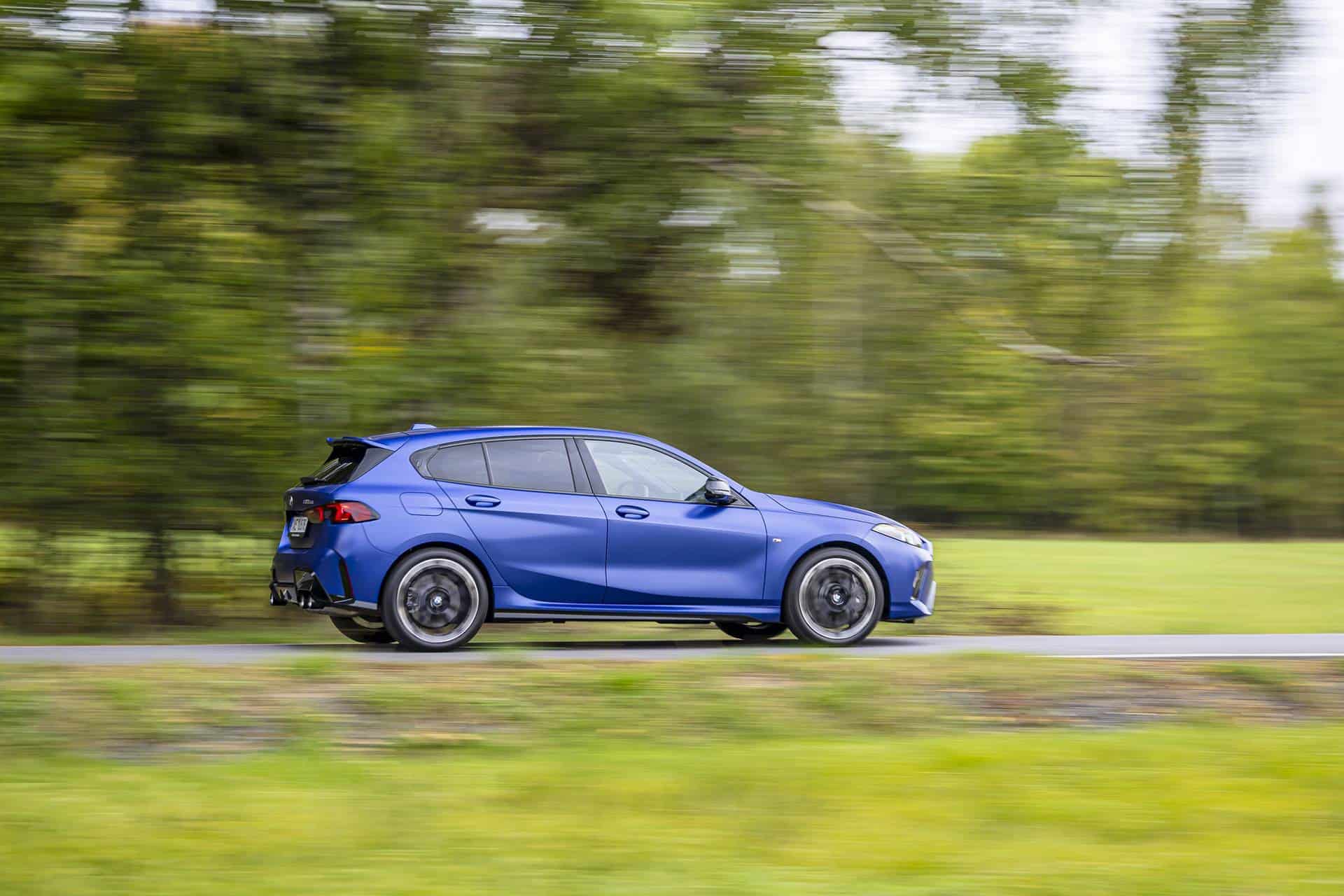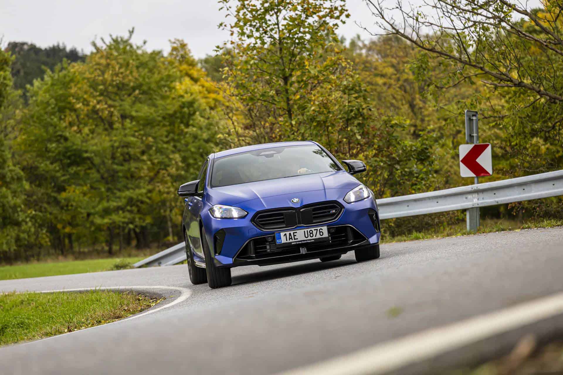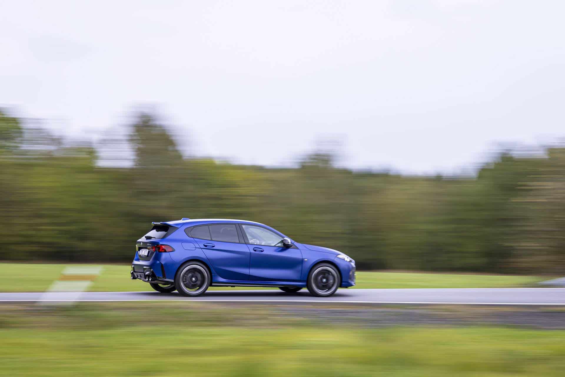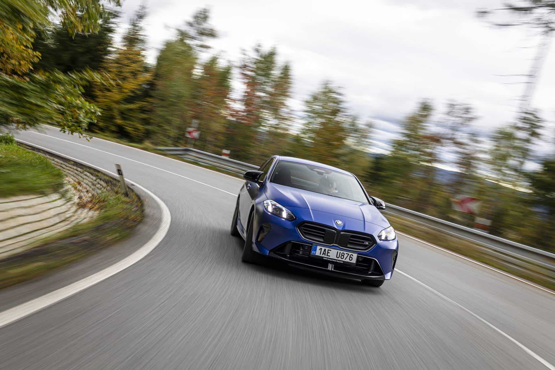 For starters, we’re dealing with the king of the hill – the M135. The hot hatch gets an Individual matte paint (Frozen Portimao Blue) and optional 19-inch wheels with M compound brakes. The blue accents inside the headlights are reserved for the adaptive lights with a matrix high beam. You’re not paying extra for the quad exhaust since it’s standard on BMW’s compact M Performance cars.