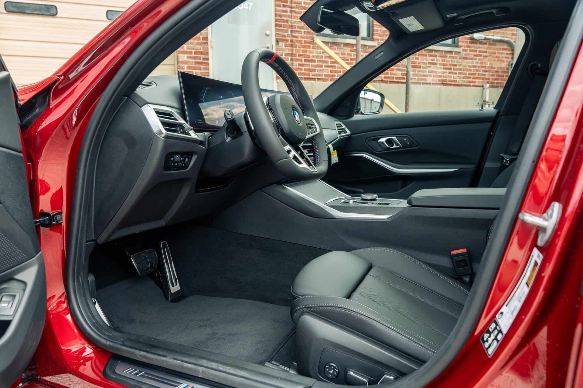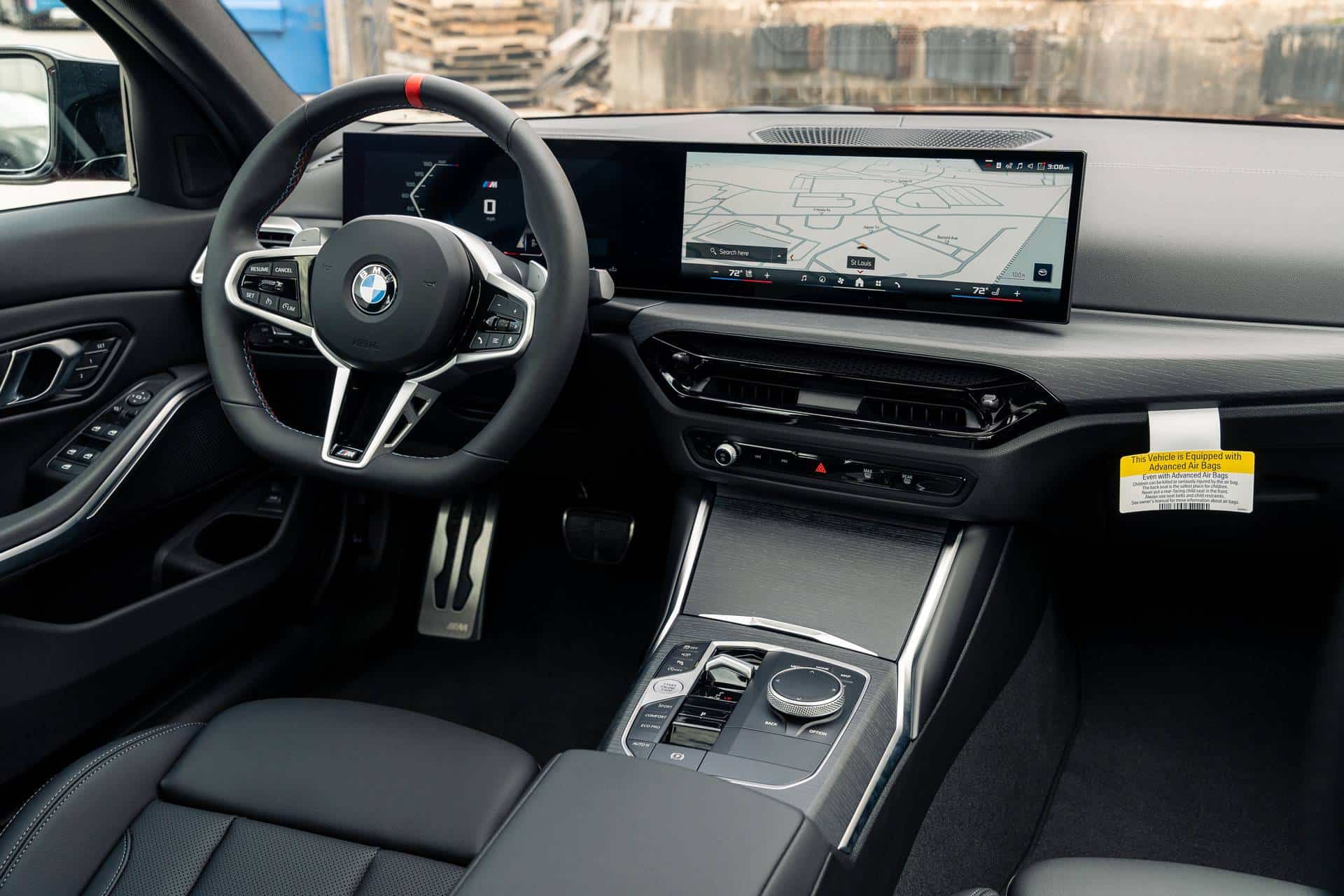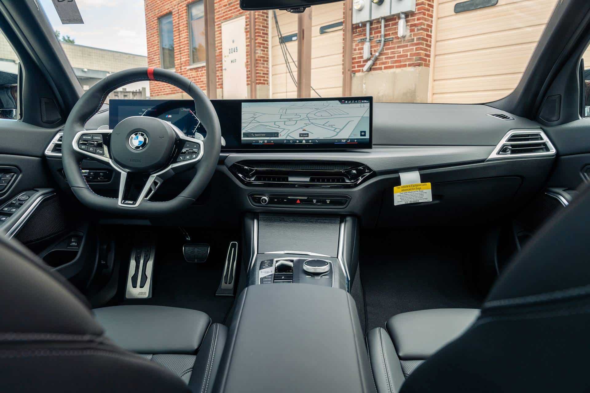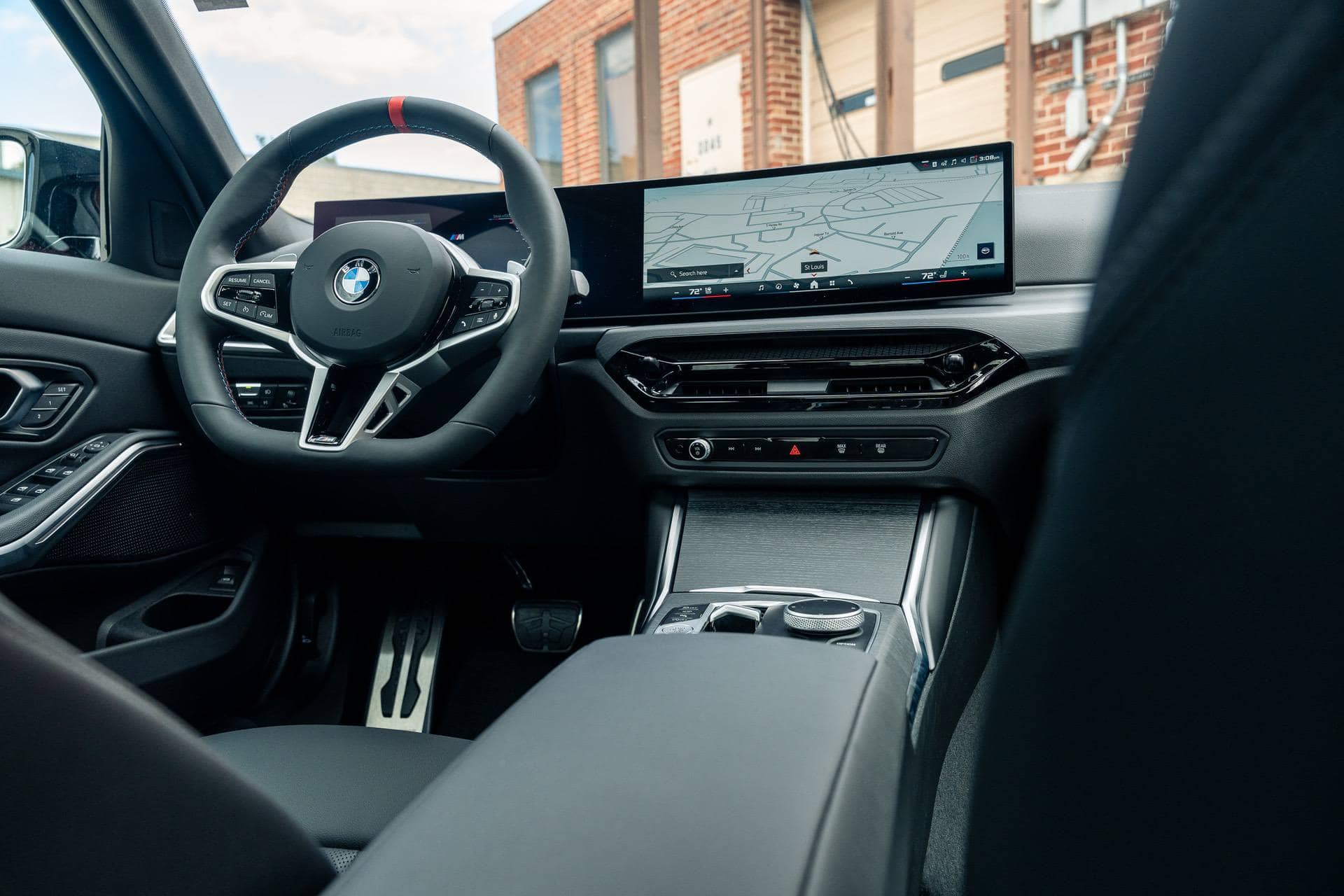 Since the M Performance version gets the M Sport Package as standard, there’s a flat-bottomed steering wheel. It has a red 12 o’clock mark, which is black on the lesser 2025 330i M Sport. This M340i keeps things simple in terms of upholstery by sticking to a black perforated Sensatec. If you still want real leather instead of this synthetic finish, there are plenty of Vernasca leather options for an extra $1,500. That Ash Grey trim on the dashboard can be swapped out for carbon fiber if you can part with another $300.