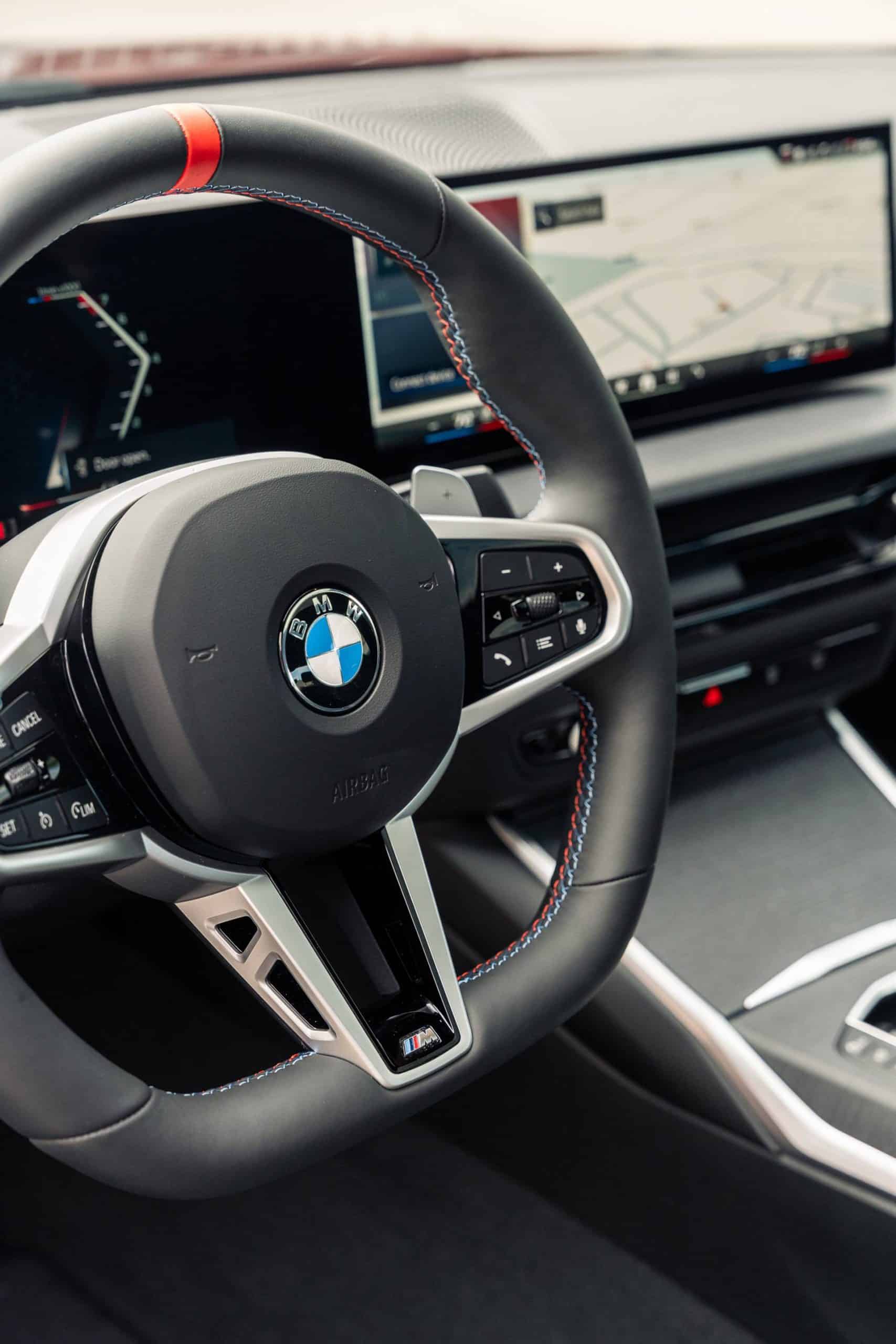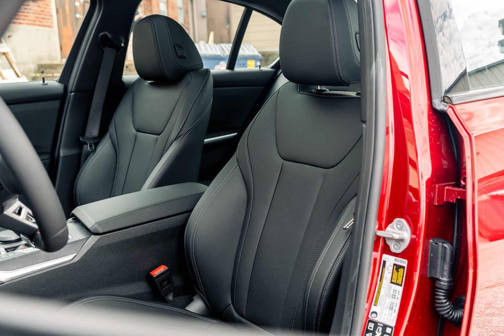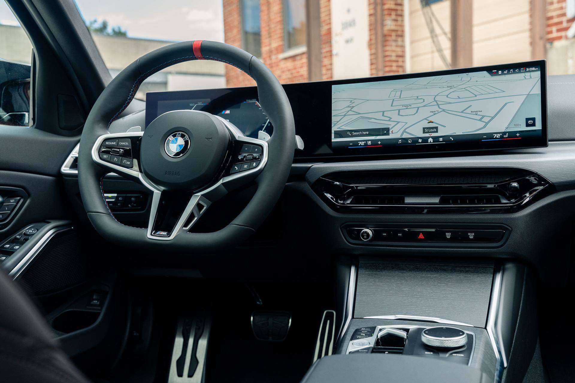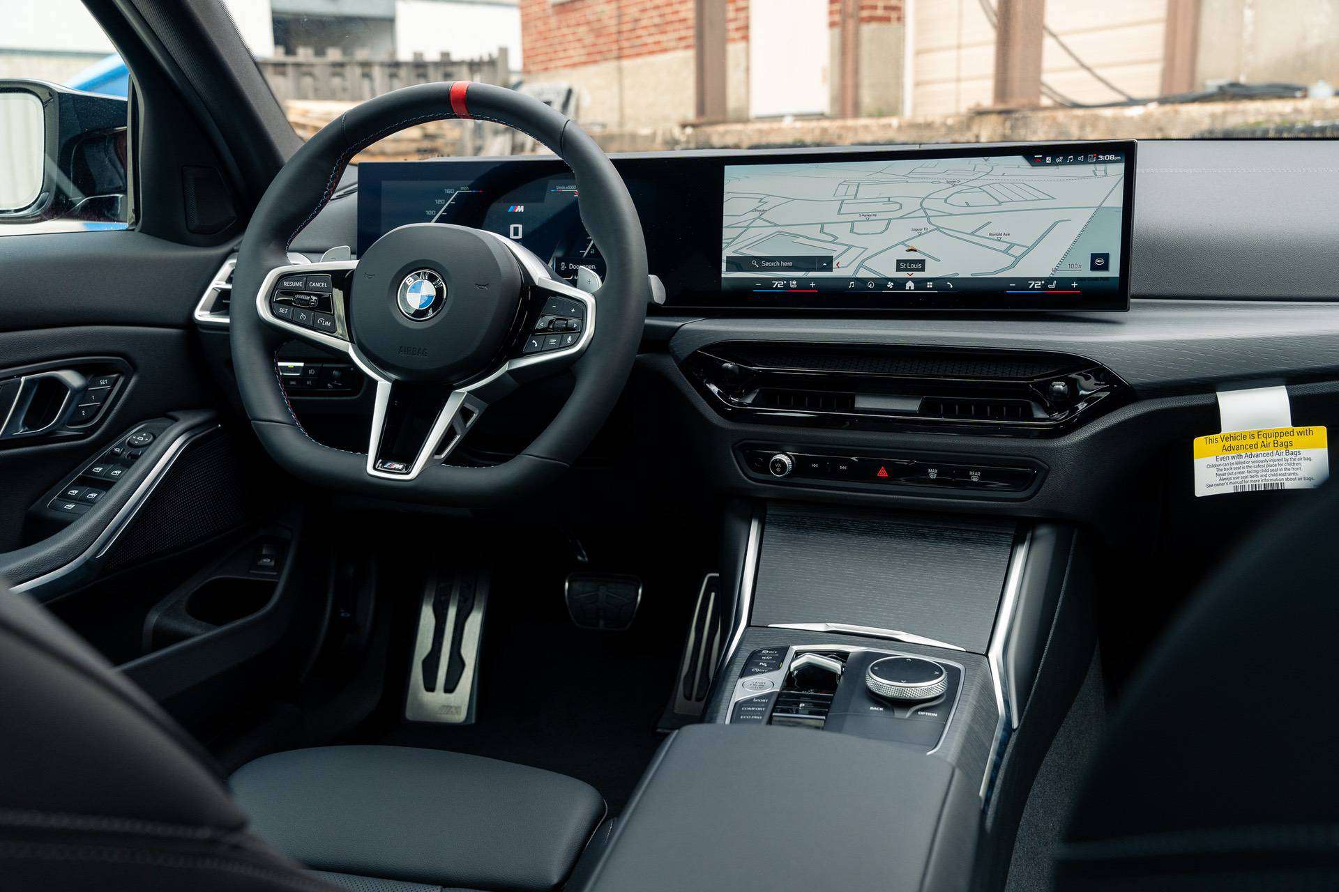 Since the M Performance version gets the M Sport Package as standard, there’s a flat-bottomed steering wheel. It has a red 12 o’clock mark, which is black on the lesser 2025 330i M Sport. This M340i keeps things simple in terms of upholstery by sticking to a black perforated Sensatec. If you still want real leather instead of this synthetic finish, there are plenty of Vernasca leather options for an extra $1,500. That Ash Grey trim on the dashboard can be swapped out for carbon fiber if you can part with another $300.