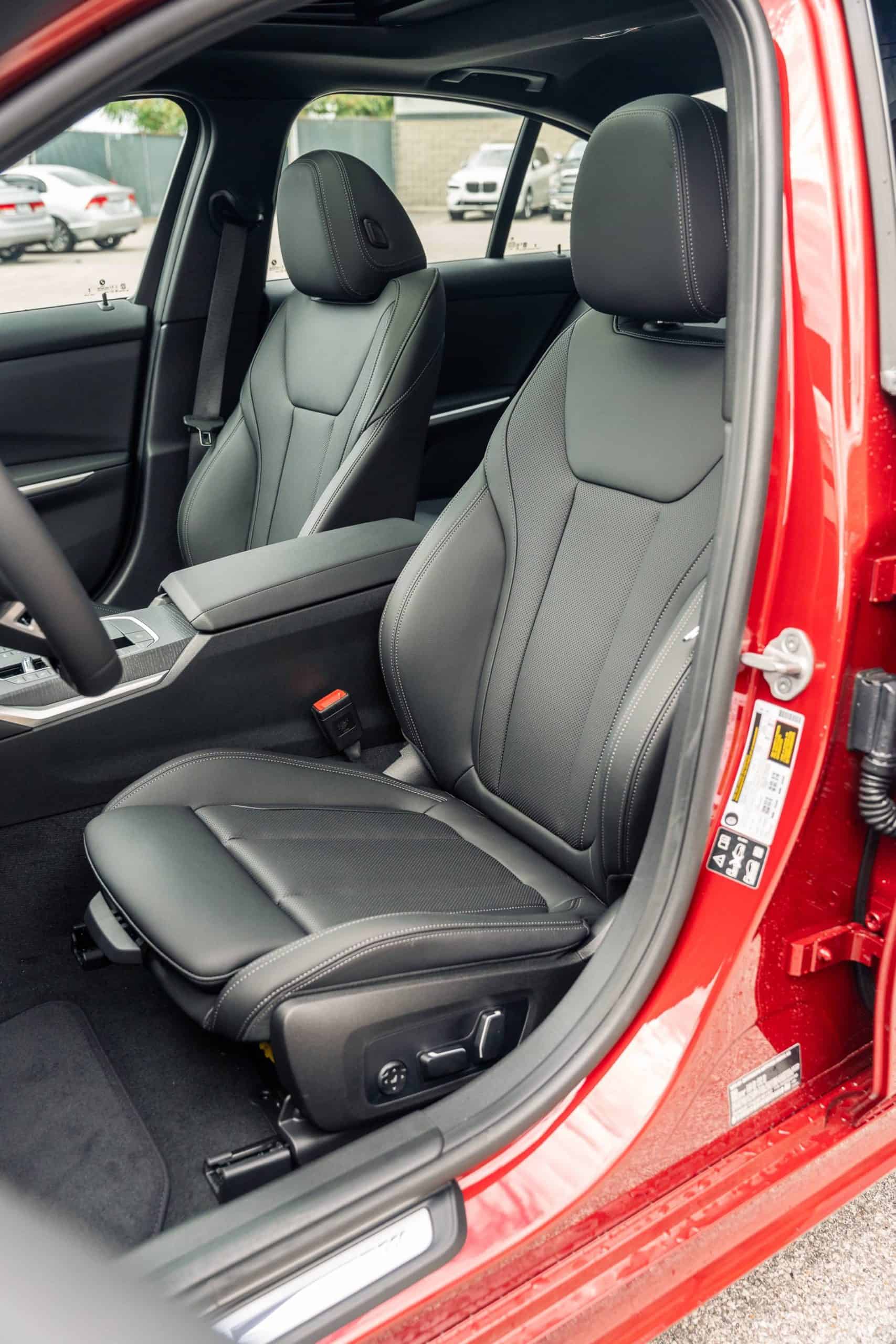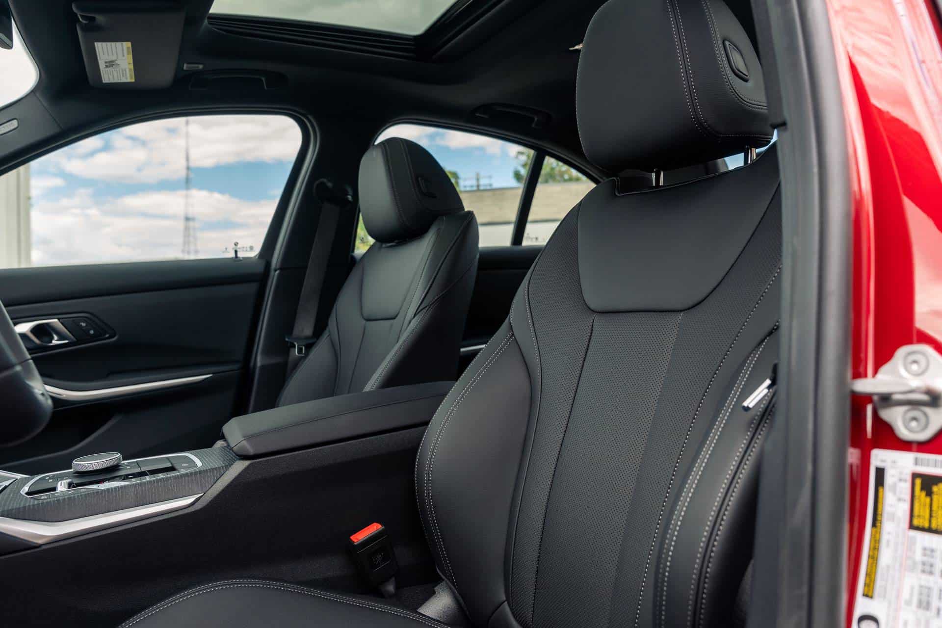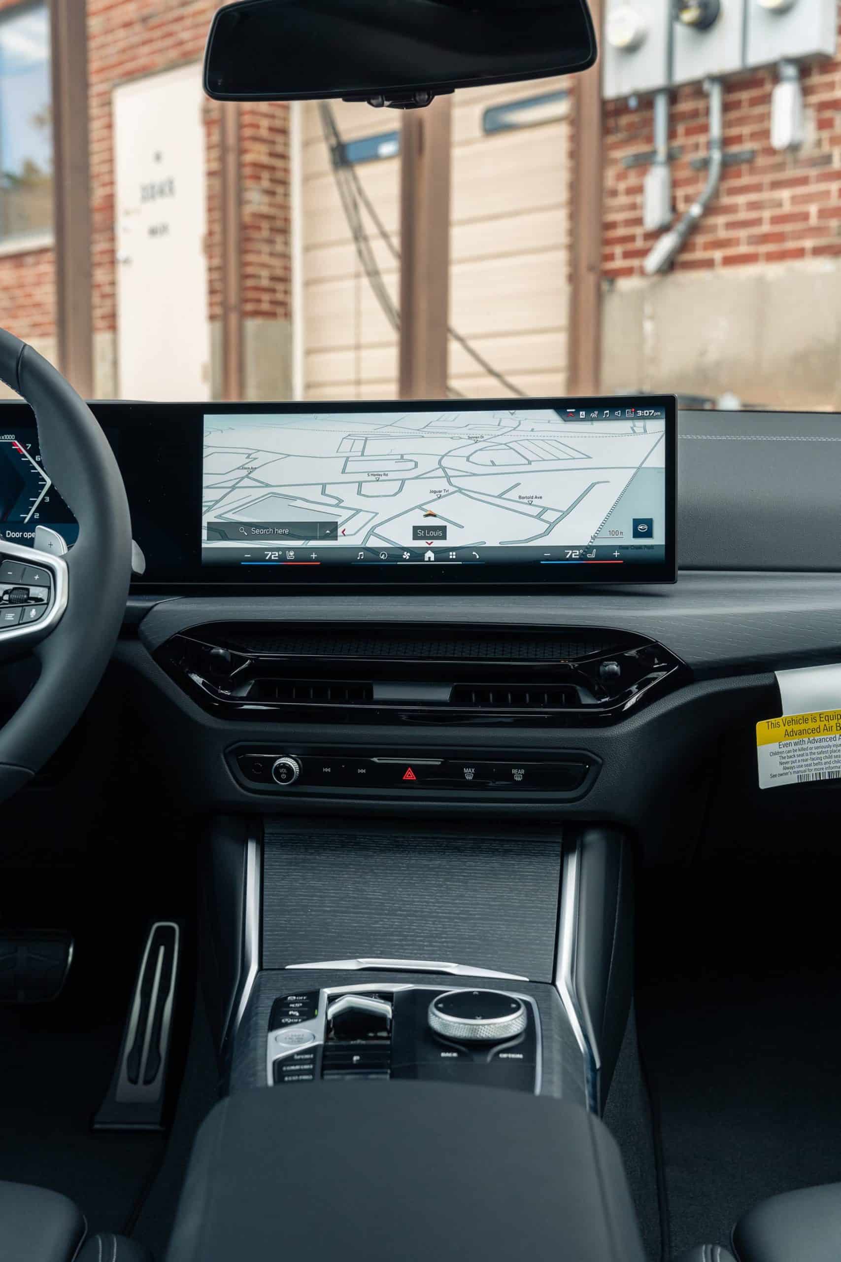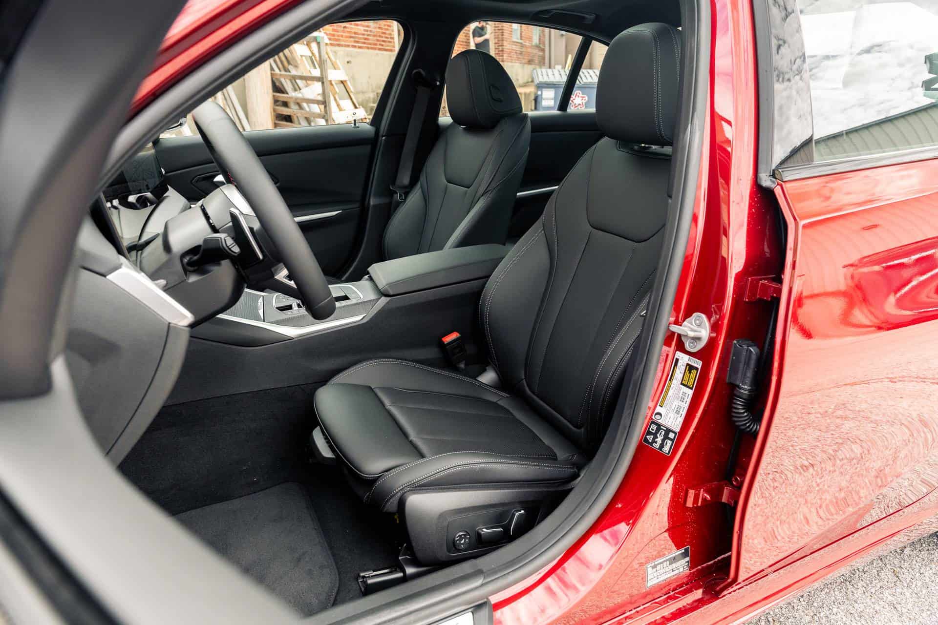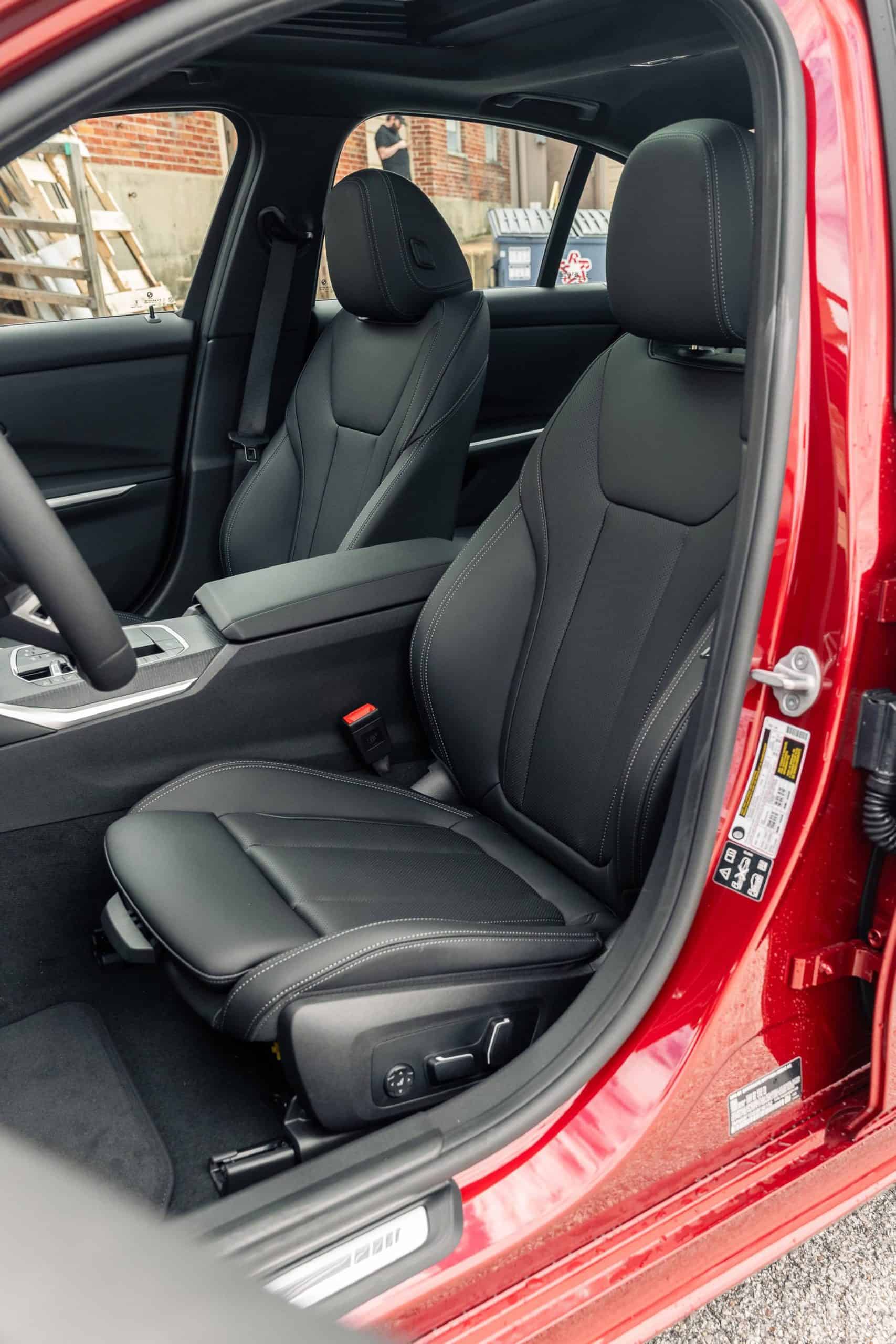 Since the M Performance version gets the M Sport Package as standard, there’s a flat-bottomed steering wheel. It has a red 12 o’clock mark, which is black on the lesser 2025 330i M Sport. This M340i keeps things simple in terms of upholstery by sticking to a black perforated Sensatec. If you still want real leather instead of this synthetic finish, there are plenty of Vernasca leather options for an extra $1,500. That Ash Grey trim on the dashboard can be swapped out for carbon fiber if you can part with another $300.