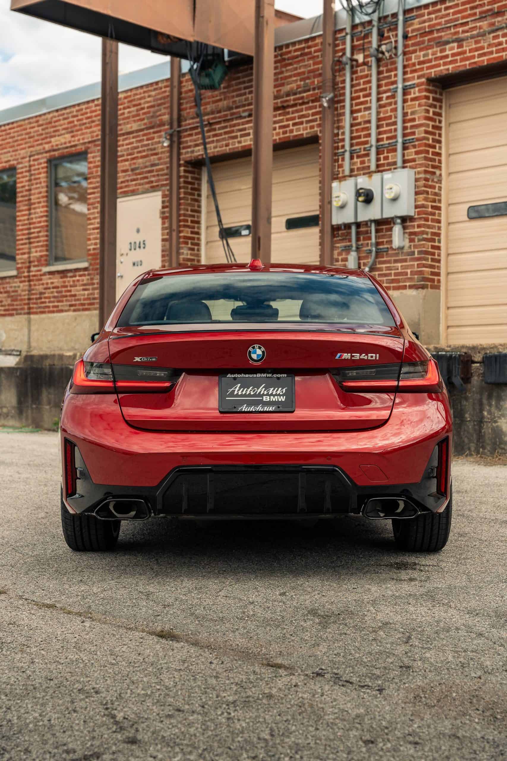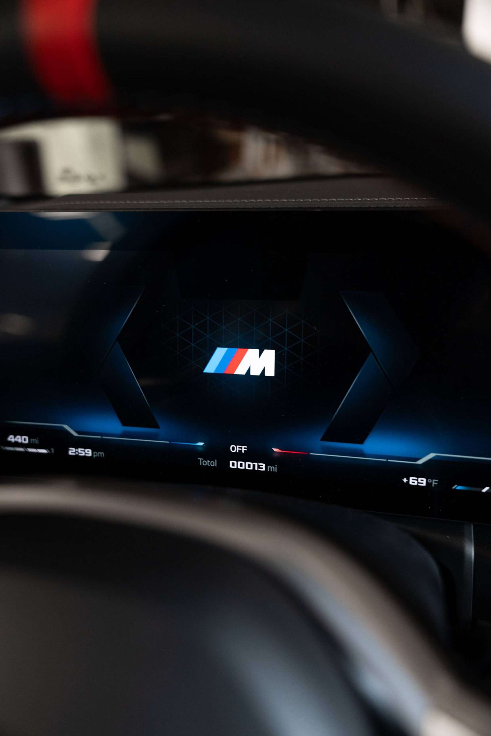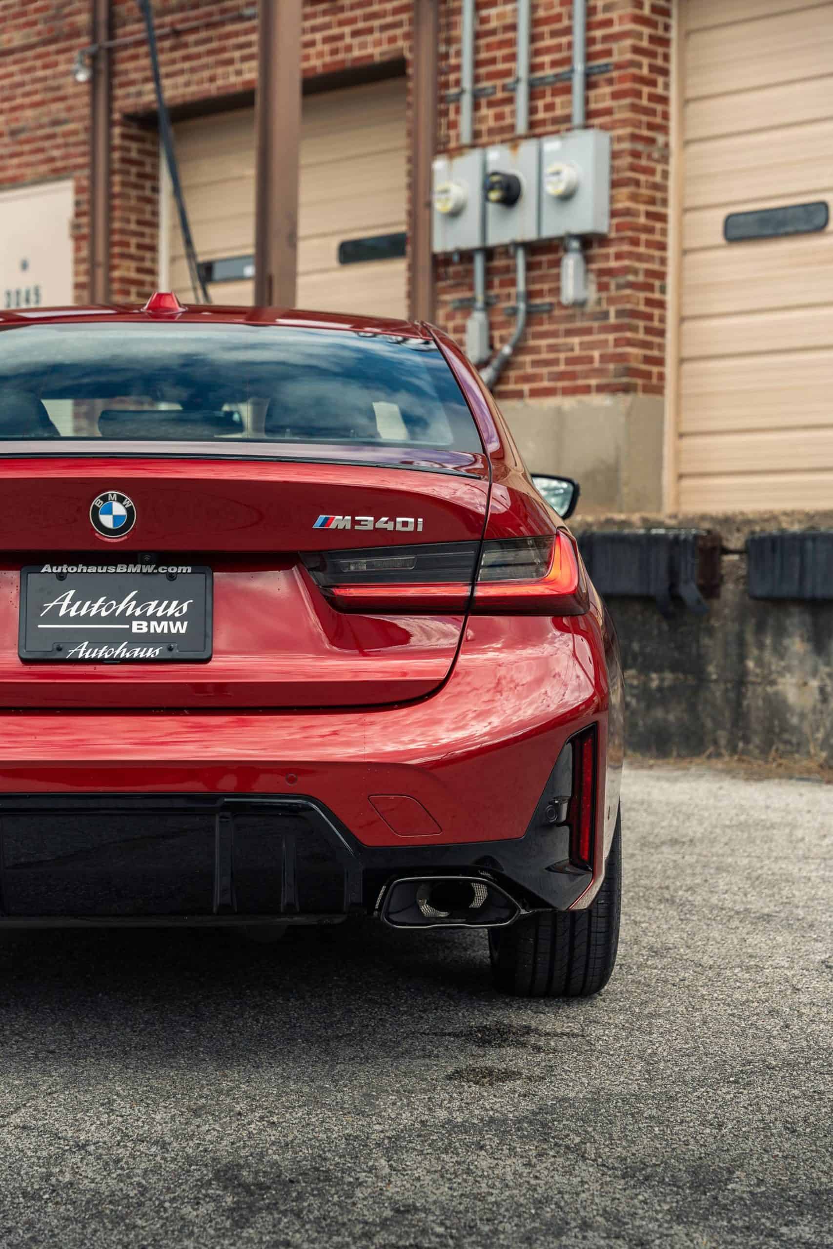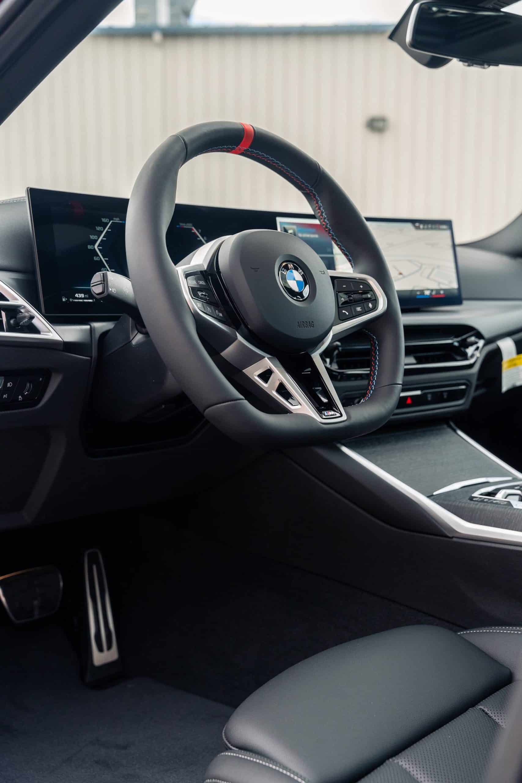 Since the M Performance version gets the M Sport Package as standard, there’s a flat-bottomed steering wheel. It has a red 12 o’clock mark, which is black on the lesser 2025 330i M Sport. This M340i keeps things simple in terms of upholstery by sticking to a black perforated Sensatec. If you still want real leather instead of this synthetic finish, there are plenty of Vernasca leather options for an extra $1,500. That Ash Grey trim on the dashboard can be swapped out for carbon fiber if you can part with another $300.
