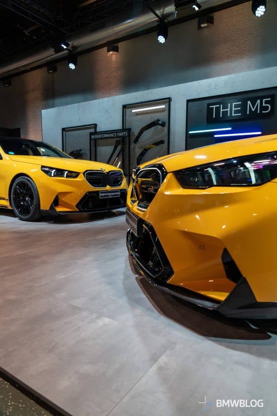 BMW M5 Product Manager Daniela Schmid takes us on an exclusive tour of the M Performance Parts tailored to the latest Ms. The dynamic duo is finished in Speed Yellow and has all sorts of carbon fiber parts. The subtle body kit on an otherwise not-so-subtle M5 brings a front spoiler lip and beefier side skirts. The split diffuser also gets the carbon treatment, much like the quad tips equipped with milled titanium end rings and embossed M5 logo.