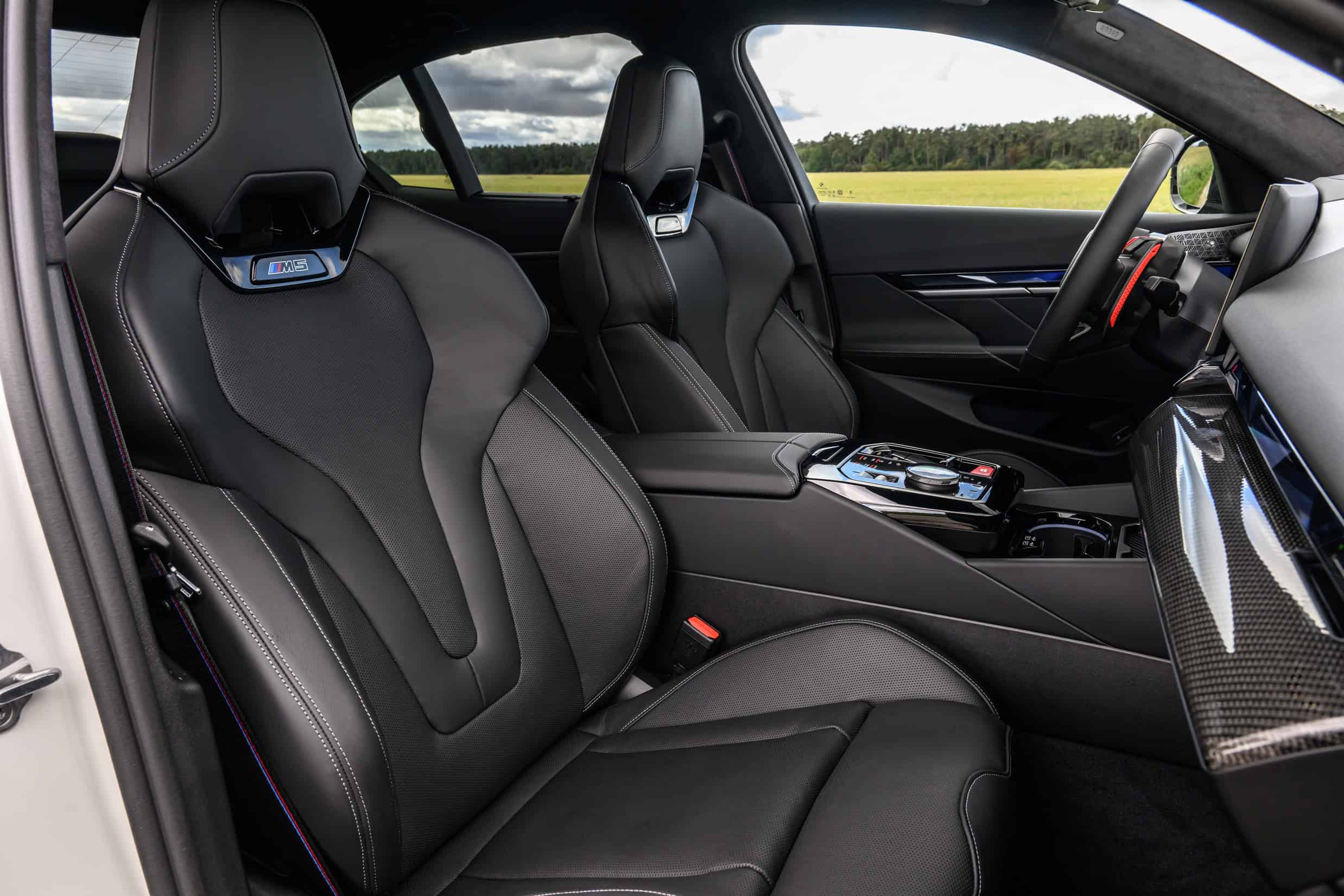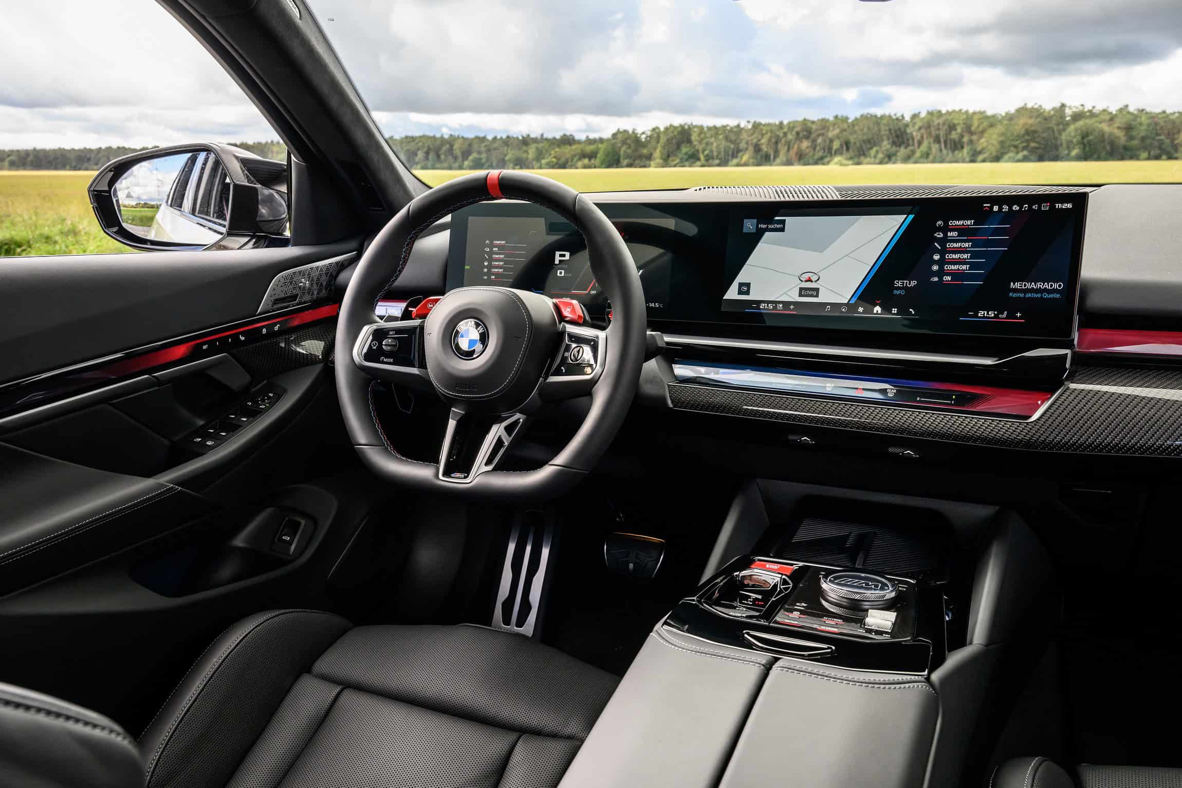 Much like the exterior, the cabin is restrained since it skips the shouty Kyalami Orange or Merino Red. Instead, this 2025 BMW M5 has black leather upholstery and a carbon fiber trim. There aren’t optional carbon fiber bucket seats at launch. However, BMW is likely planning them for later in the G90’s life cycle. An M Hybrid button below the M-branded iDrive controller is a subtle reminder the new M5 is electrified.