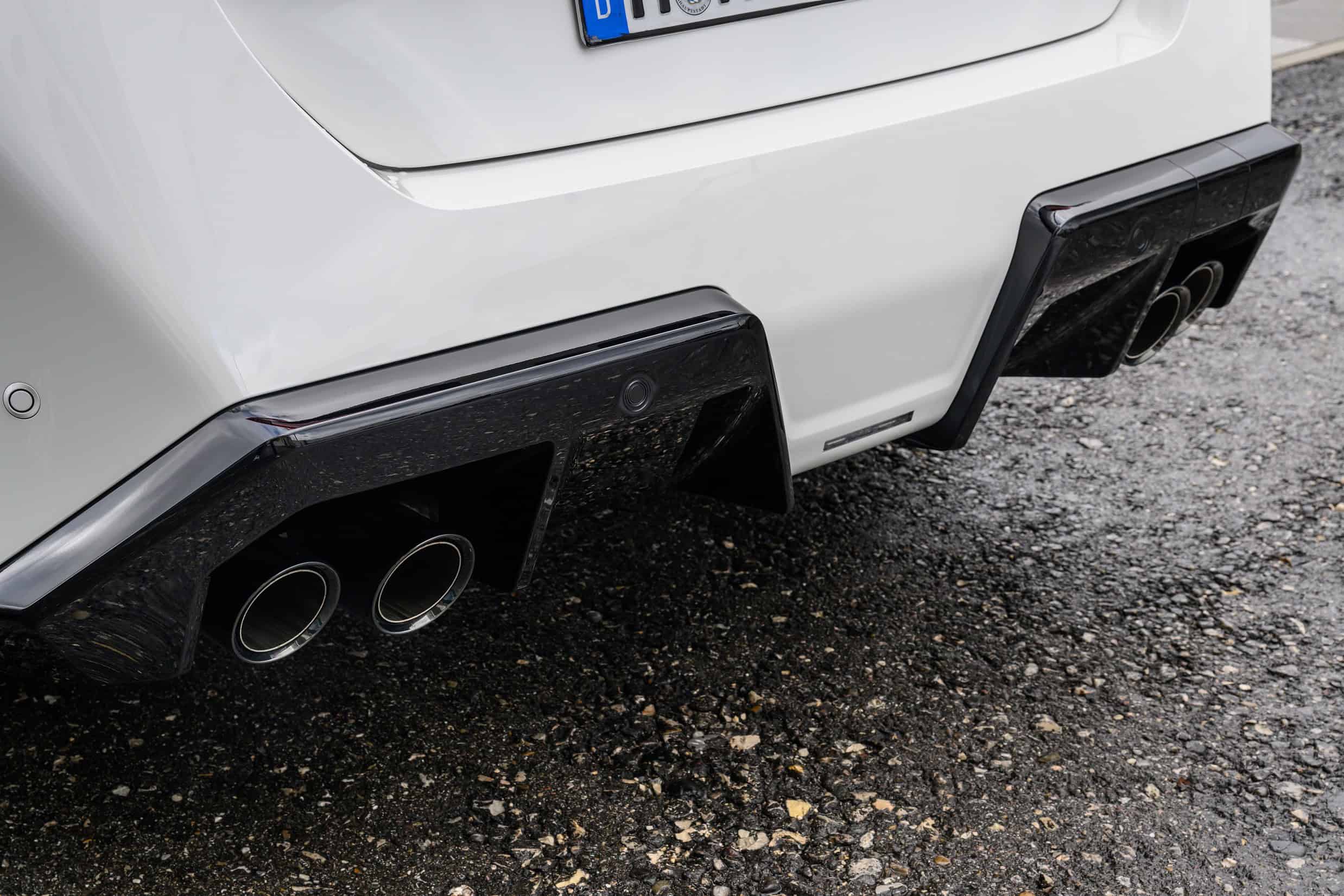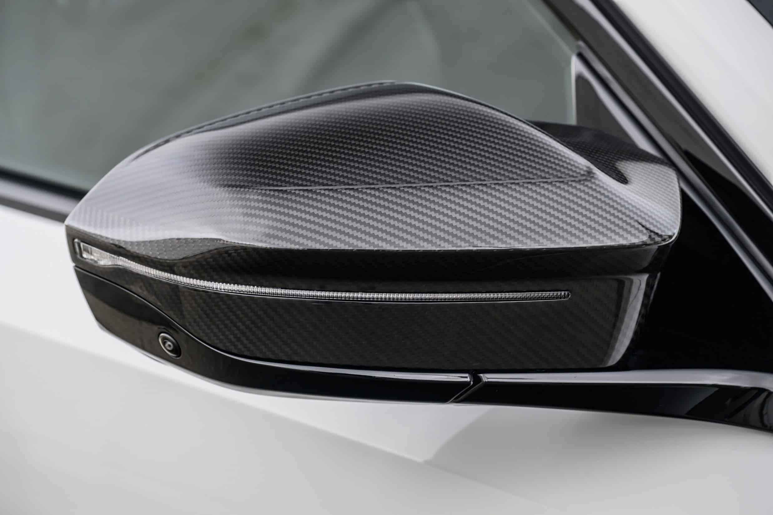 Although this G90 build retains the standard Alpine White hue, it still has a few options added. BMW is charging extra for the carbon fiber roof and side mirror caps. These items are part of the M Carbon exterior package, which also includes the trunk lid spoiler. Not that it’s going to make a big difference but the roof shaves off 66 pounds (30 kilograms) compared to the standard panoramic glass sunroof.