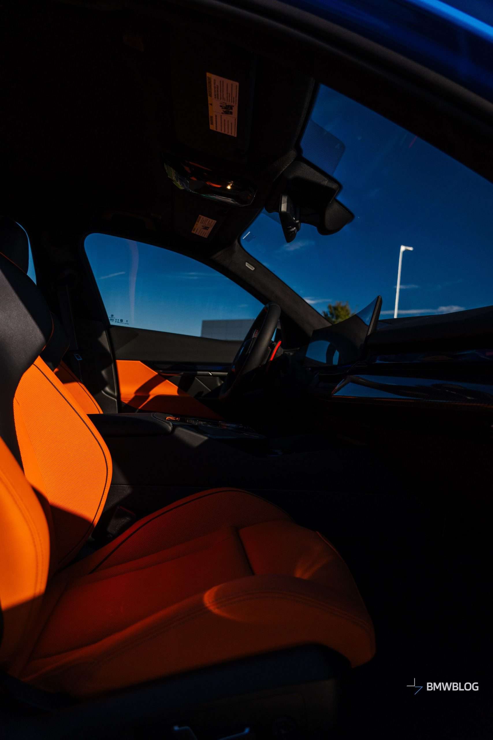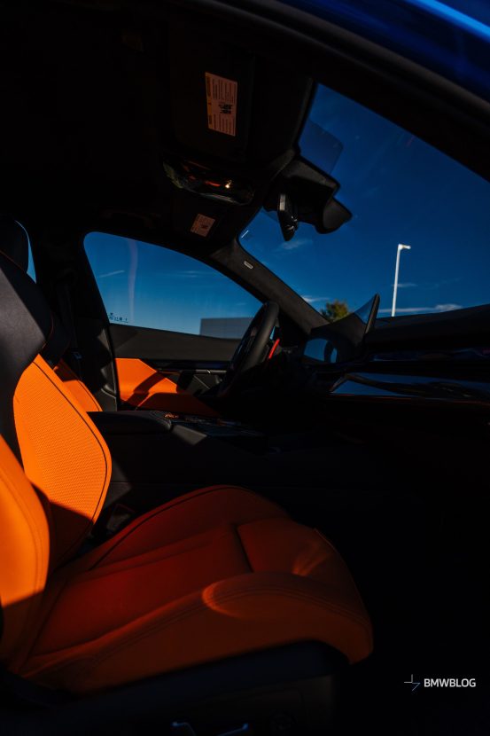 The Santorini Blue exterior is combined with a Kyalami Orange/Black cabin. If that’s too much, a Red/Black interior is available, along with more subdued Silverstone/Black and Black themes. Regardless of choice, all have an Extended Merino leather upholstery. Carbon bucket seats are a no-show, at least for the time being.