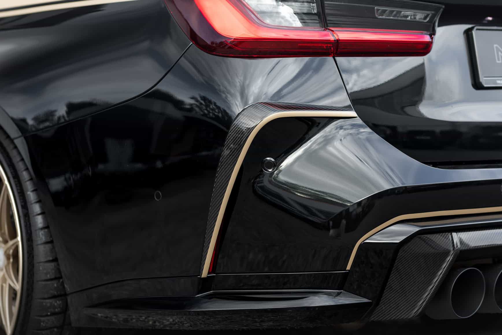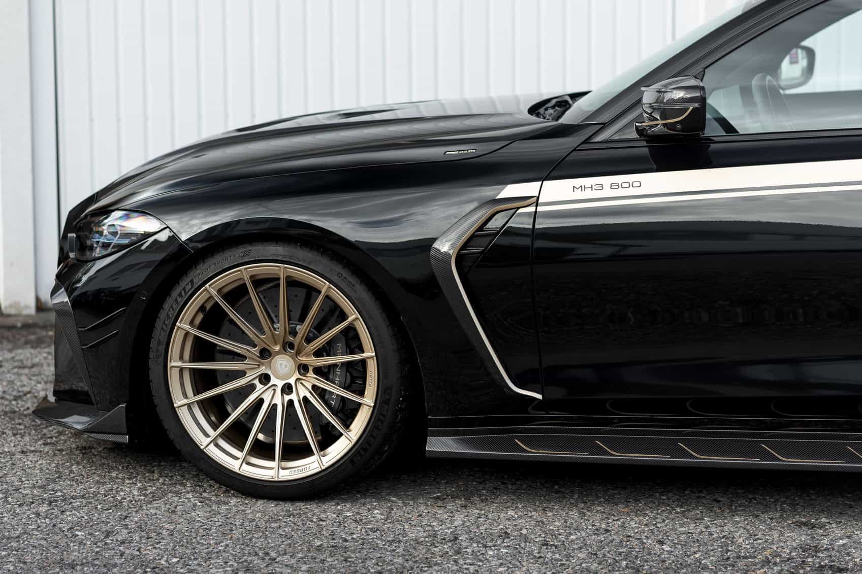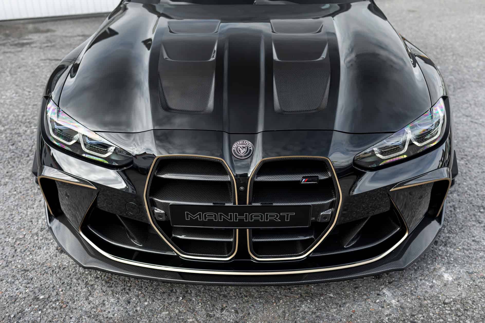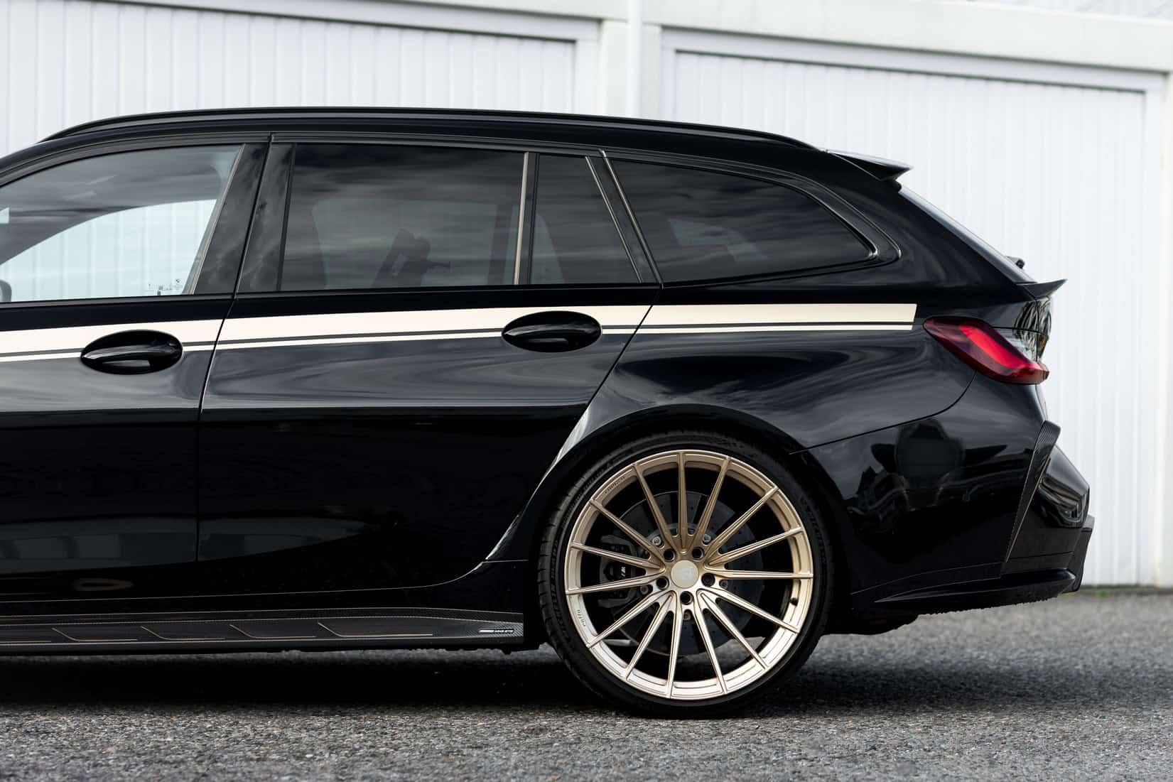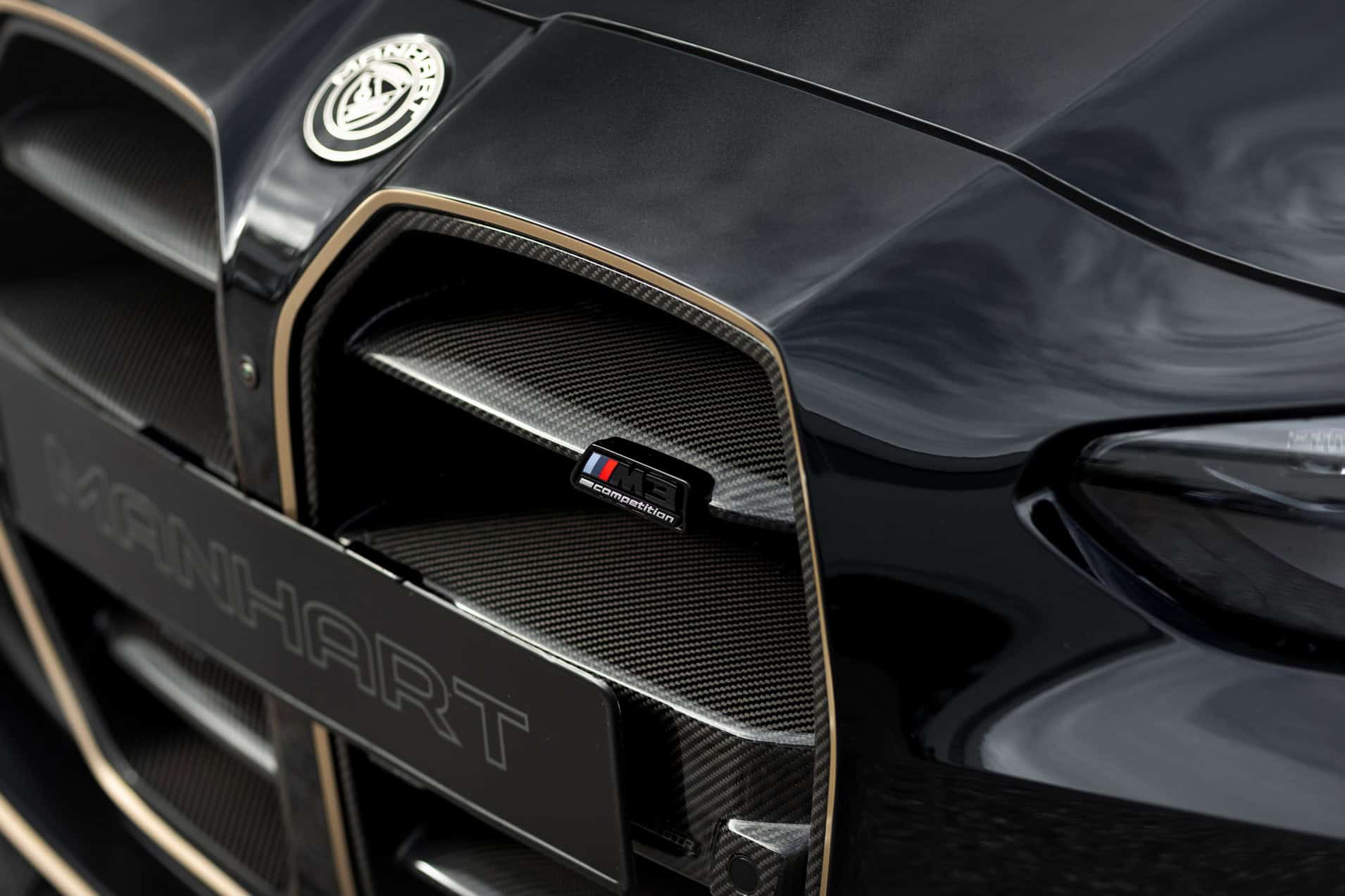 In typical Manhart fashion, the M3 Touring gets a not-so-subtle body kit. It includes a new radiator grille, front and rear spoilers, and extended side skirts – all from carbon fiber. The lightweight material was also used for the side gills. The tuner’s signature champagne accents adorn the muscular body and the aftermarket wheels.