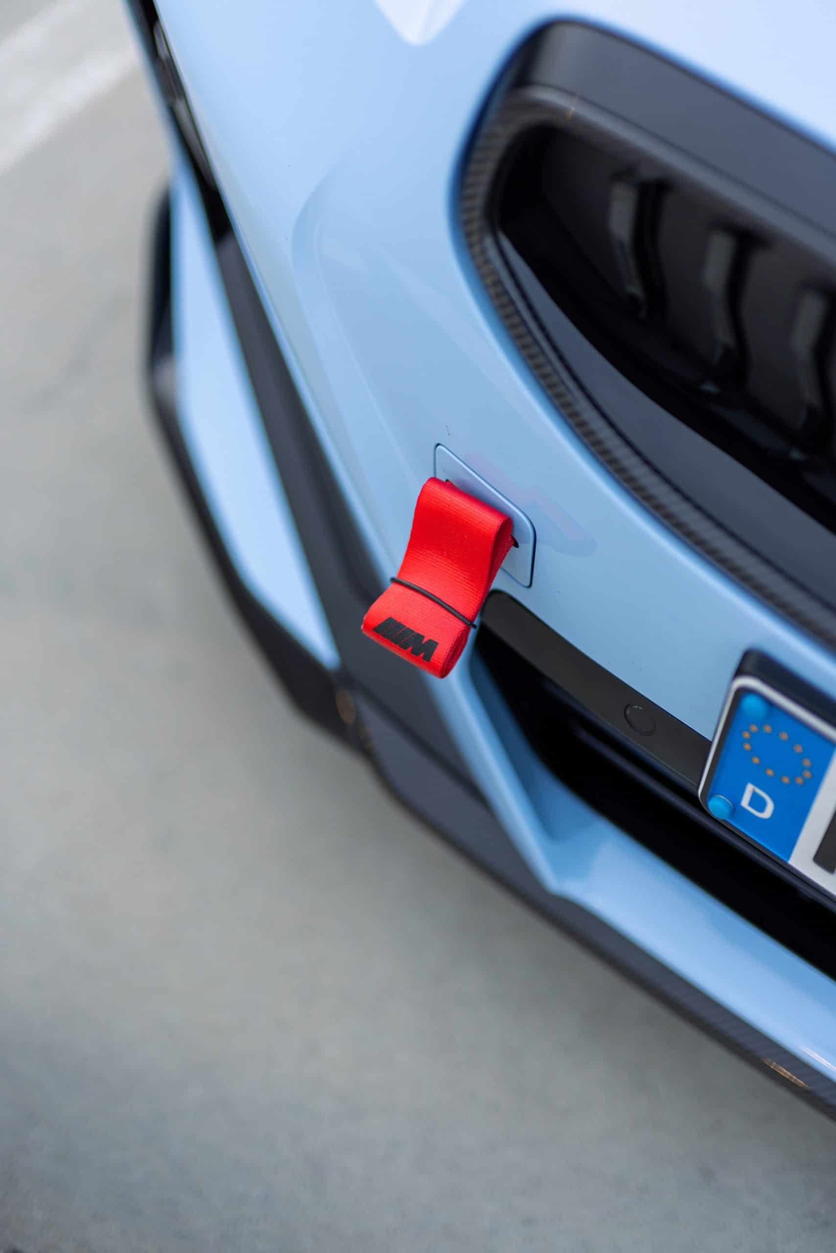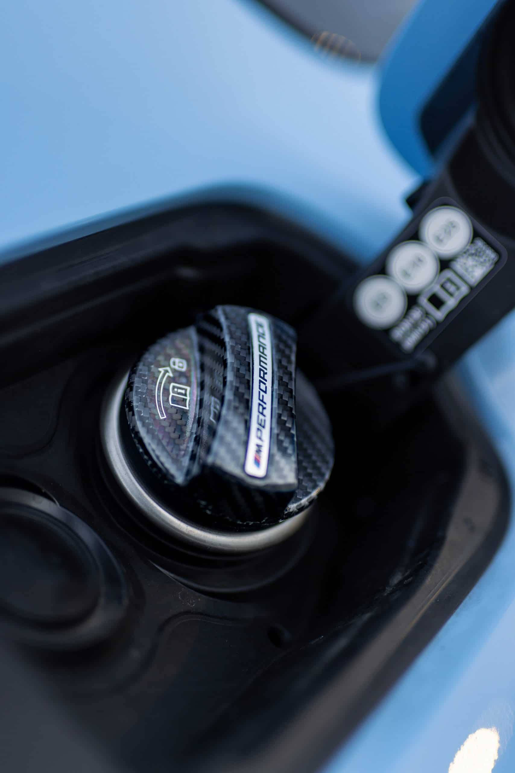 The more we look at the car, the more upgrades we can spot. The kidney grille has a carbon fiber contour, while the red tow strap is hard to miss. The M240i’s profile features a large decal in Frozen Black, a matte finish also adorning the hood. Those 19-inch wheels are also from the M Performance Parts catalog, and so is the carbon fiber fuel filler cap.