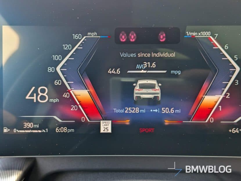 Inside, the new X2 offers 51.7 cubic feet of cargo space with the rear seats folded down. While this is less than the more spacious BMW X1, it’s still practical for a vehicle in this category. The 40/20/40 split-folding rear seats are especially useful for carrying a mix of passengers and cargo, a feature some competitors lack. The 2025 X2 is noticeably larger than its predecessor though. It’s 7.1 inches longer, an inch wider, and 2.5 inches taller than the 2023 model. This increase in size provides slightly more cargo space than before, improving versatility without sacrificing its sporty coupe-like profile.