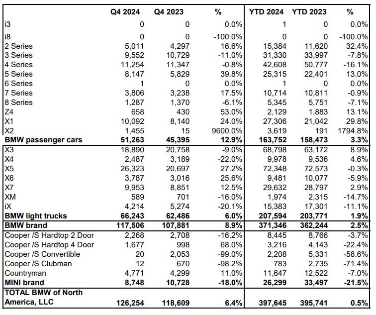 The entry-level crossover had a great 2024 as well, with shipments of the X1 jumping by 29.8%. The arrival of a new X3 (G45) boosted demand by 8.9%. Even the aging X4 still had a solid year, posing 4.6% higher sales. The fullsize X7 SUV enjoyed 2.9% higher sales. Ahead of its upcoming Life Cycle Impulse, the iX fell by 11.1%. The X5 was nearly flat year over year. Its swoopy sibling, the X6, decreased by 5.9%.