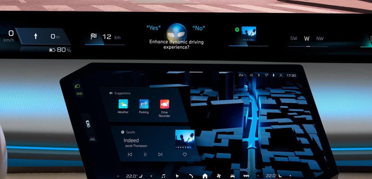 “Easy to understand, and easy to reach,” Christian says when talking about the icons we see displayed on the large screen. Look there, and you’ll notice the map, phone, and music widgets make a return. Apparently, these are the three most in-demand functions by drivers. Bauer and Horatiu move onto the panoramic display and quickly cover the driver-side functions – locked in to ADAS features, speed, and range info – before jumping to the steering wheel – something we haven’t seen this fleshed out until now.