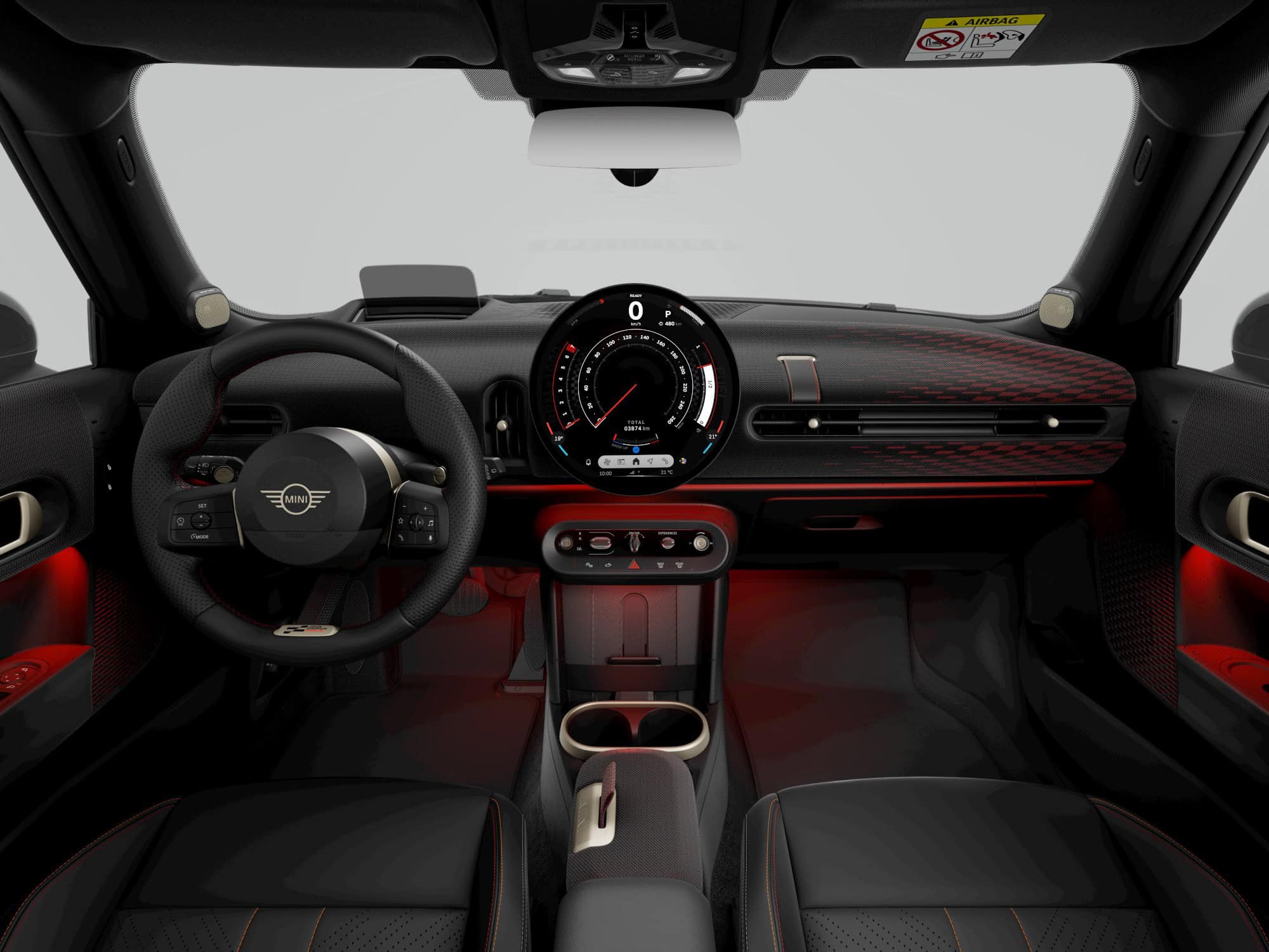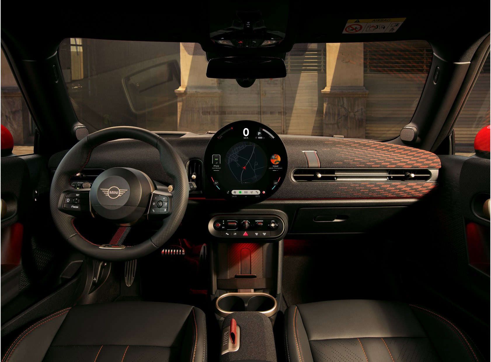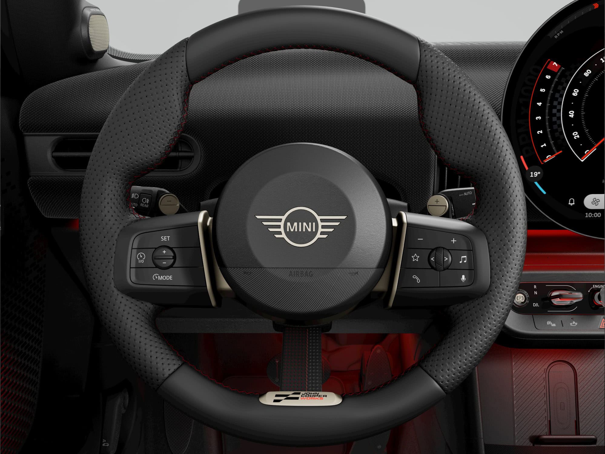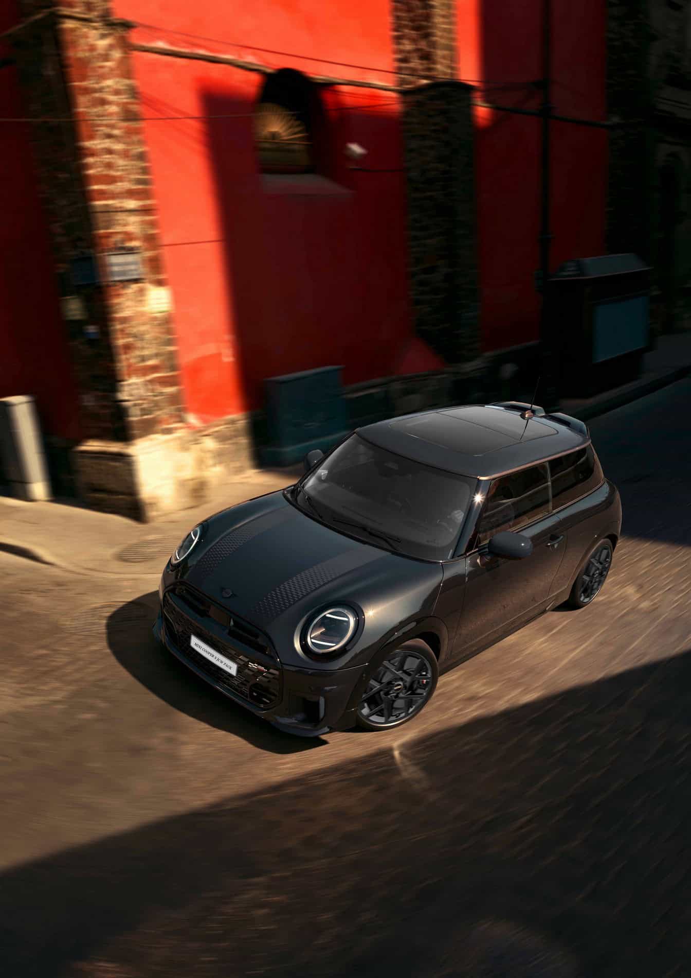 MINI intends to sell the feisty city car in either this Midnight Black paint or Legend Grey. Regardless of choice, the Cooper S with JCW Pack gets the side mirror caps and roof in black. Those 17-inch wheels also have a dark look, as does the vegan leather used inside the cabin. Despite the JCW branding, this is merely a cosmetic package since the car doesn’t have a more powerful engine.