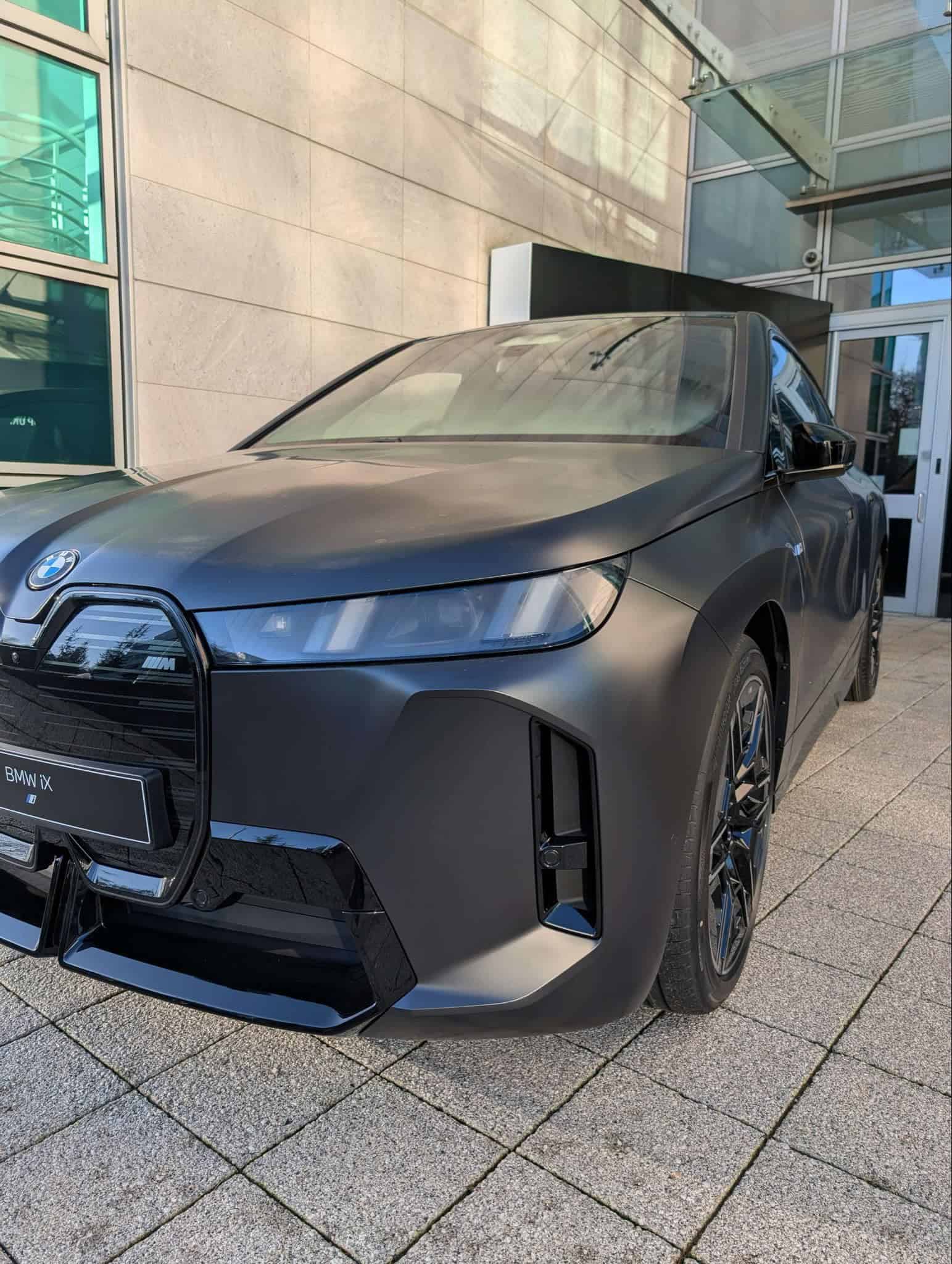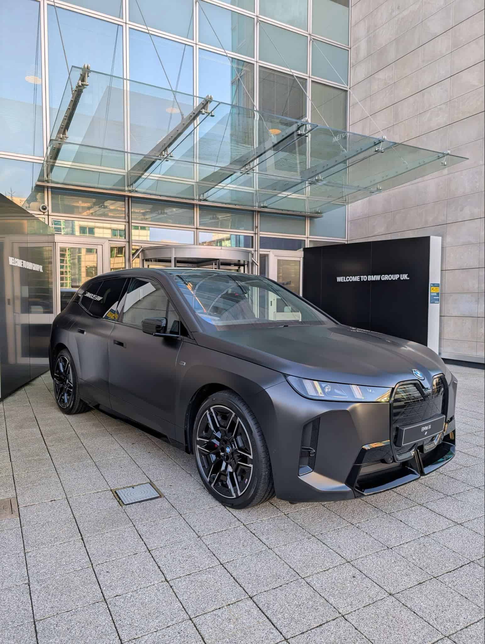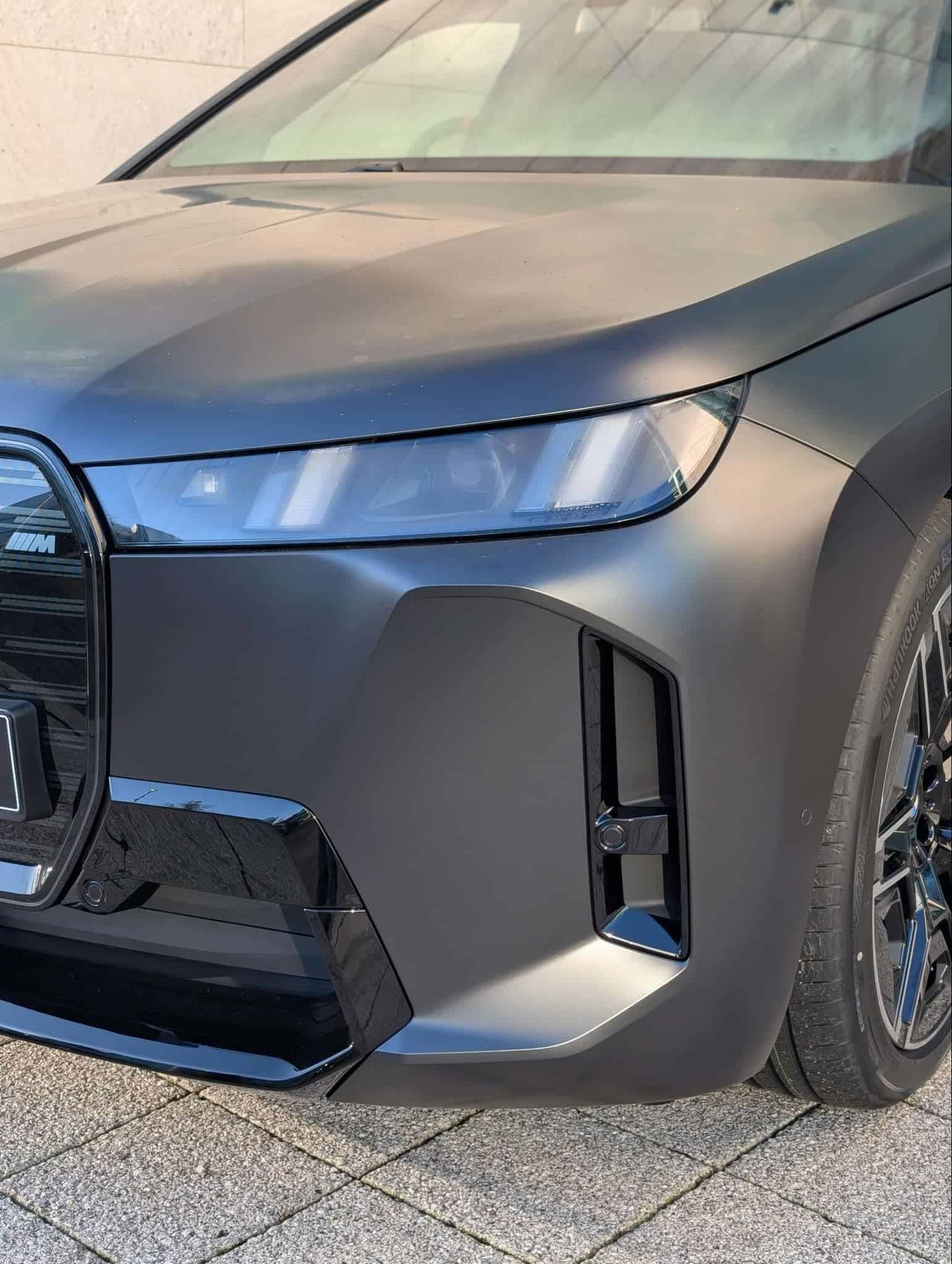 Mere days after its world premiere, the iX facelift is already proudly displayed in front of BMW UK’s headquarters. As you can easily tell, it’s no ordinary version of the polarizing SUV. In addition to being the hot M Performance model, it’s dressed to impress in Frozen Deep Grey. It’s a pricey matte finish from the Individual catalog. The heavily darkened Shadowline headlights are standard on the iX M70.