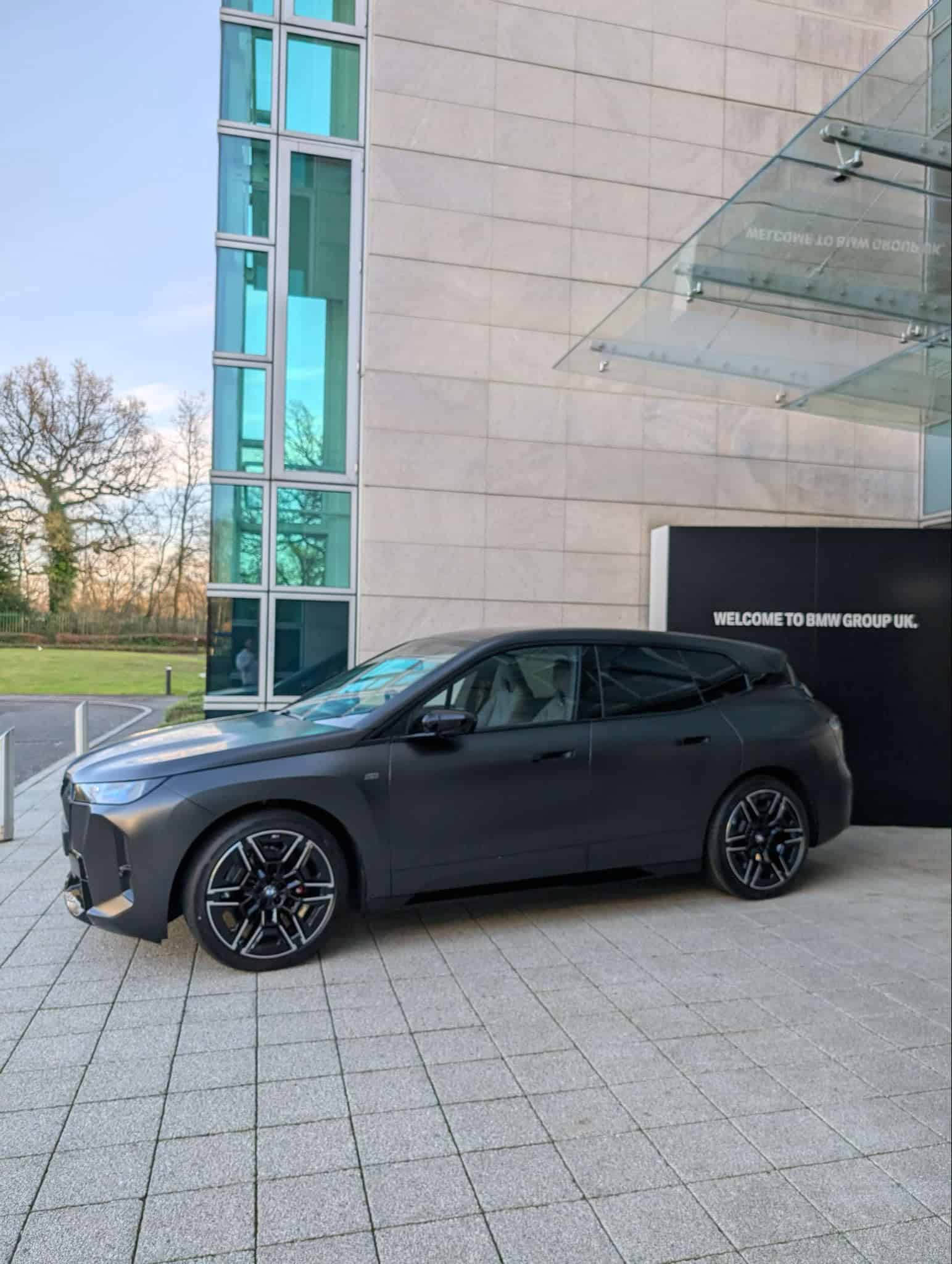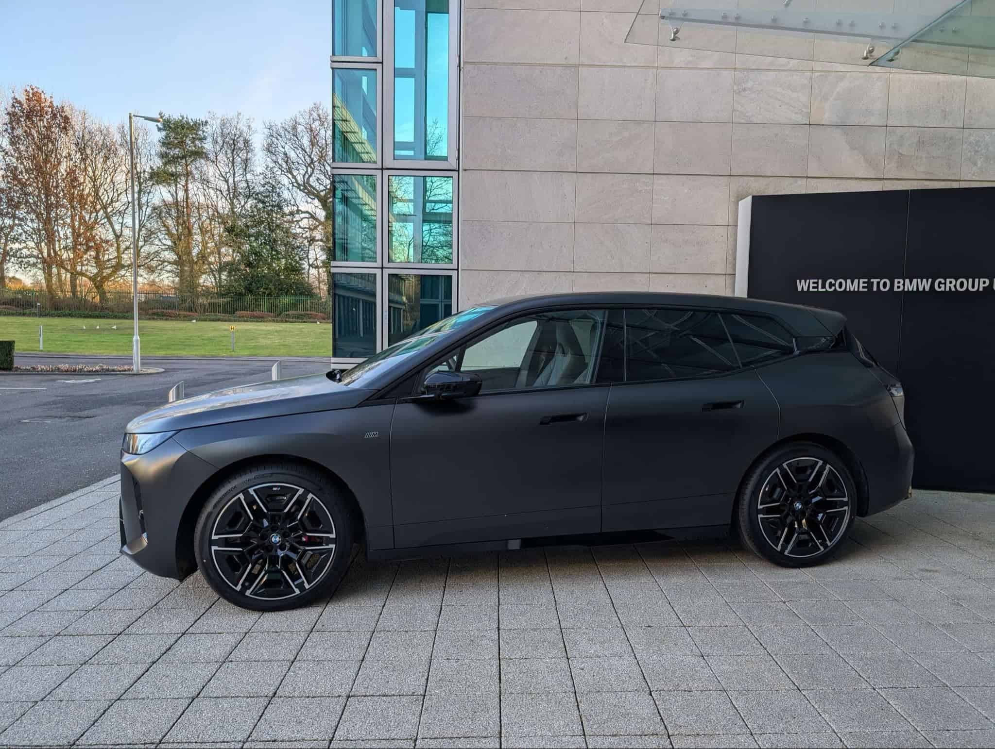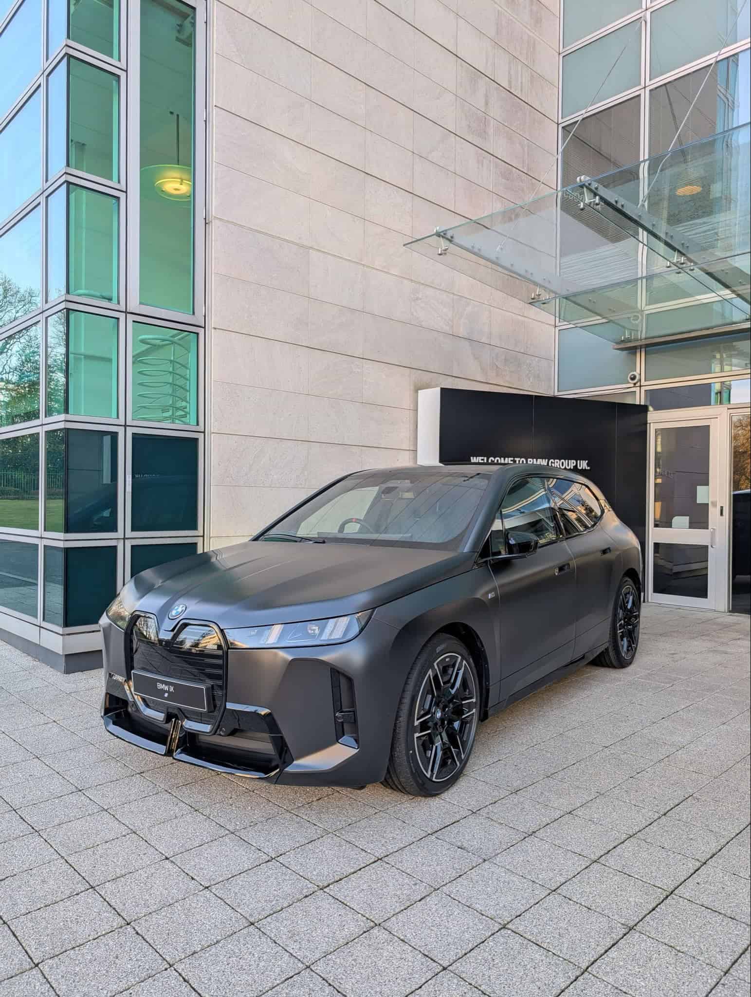 Mere days after its world premiere, the iX facelift is already proudly displayed in front of BMW UK’s headquarters. As you can easily tell, it’s no ordinary version of the polarizing SUV. In addition to being the hot M Performance model, it’s dressed to impress in Frozen Deep Grey. It’s a pricey matte finish from the Individual catalog. The heavily darkened Shadowline headlights are standard on the iX M70.