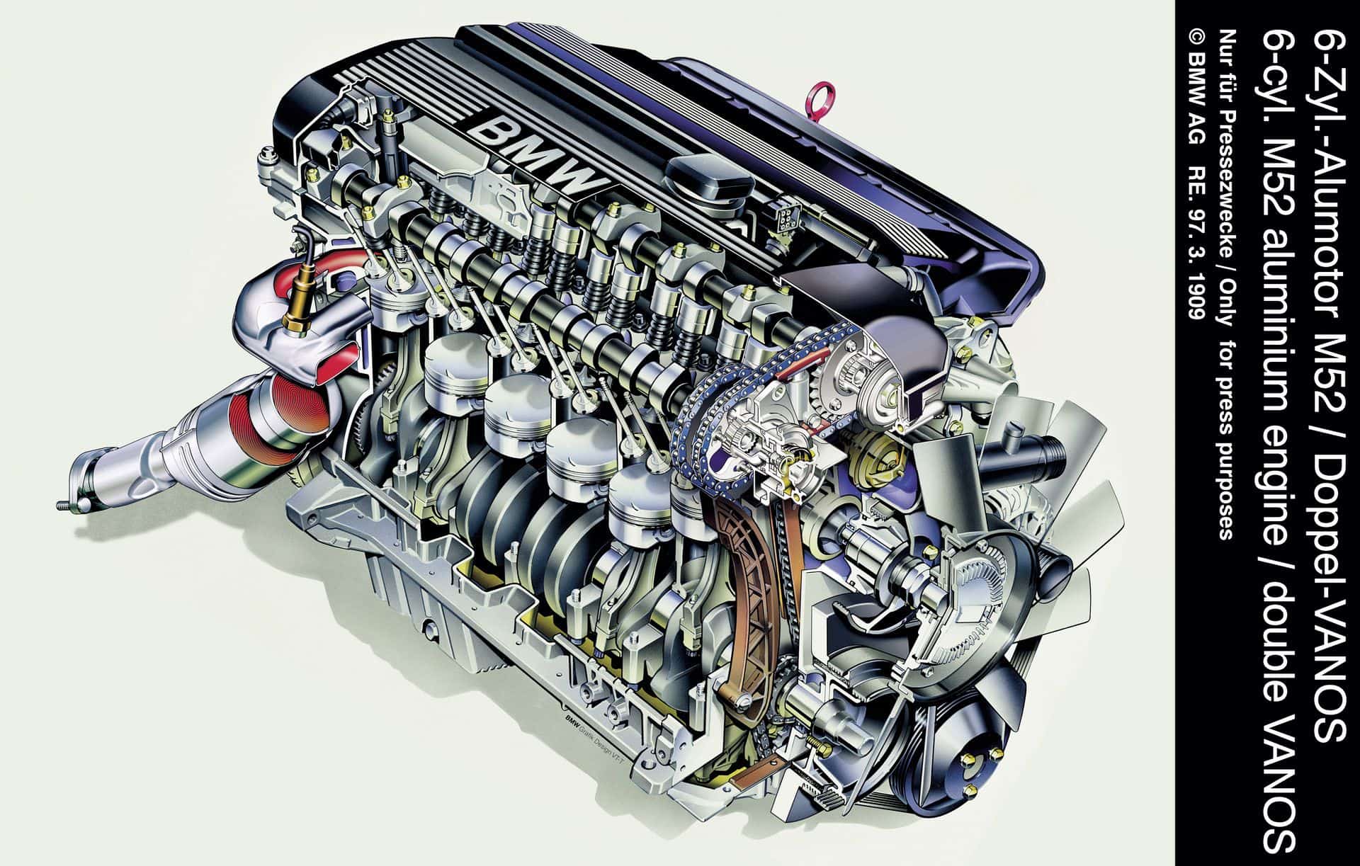 The ‘regular’ early M52s, DOHC as they were, and just like the M50, were single-VANOS. When the TÜ (technical update, think LCI-facelifts for engines) arrived, drivers enjoyed variable valve timing on not just the single-VANOS-style intake cam, but on the exhaust cam as well! Creatively, it was dubbed ‘double-VANOS’. Clever, huh? M52s commonly had revised throttle bodies, ASC/traction control, coolant drain passages, dual intake manifolds, and even steel lining in the cylinders for that optimal heat protection.