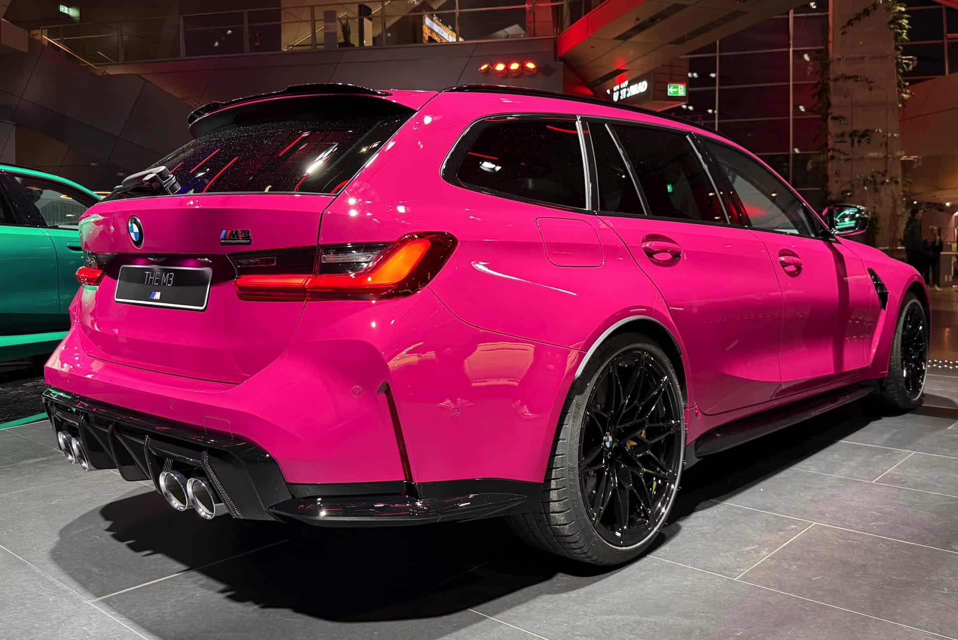 Although BMW M has finally introduced silver wheels for the M3 lineup, this G81 has the black 826 M set. As if the pink paint job wasn’t enough, the optional carbon-ceramic brakes include gold calipers. The M Carbon Exterior Package is also included, but a carbon roof is still unavailable. It’s the same story with the car’s bigger brother, the M5 Touring.