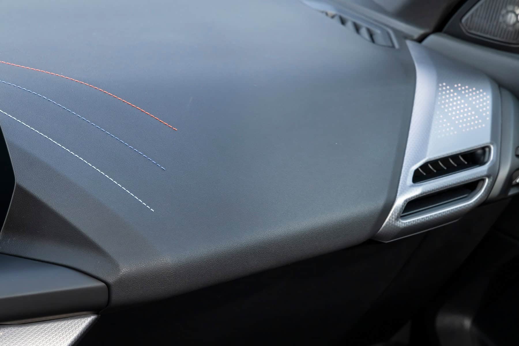 Stepping inside, one extra from the configurator becomes immediately apparent. BMW France built this four-door 2er press car with the perforated Veganza (vegan leather) in Oyster, marketing jargon for beige/cream. Beyond the seat upholstery and the center console, the door cards are also partially beige. The lighter theme is a breath of fresh air compared to most official images showing the compact Gran Coupe with predominantly dark interiors.