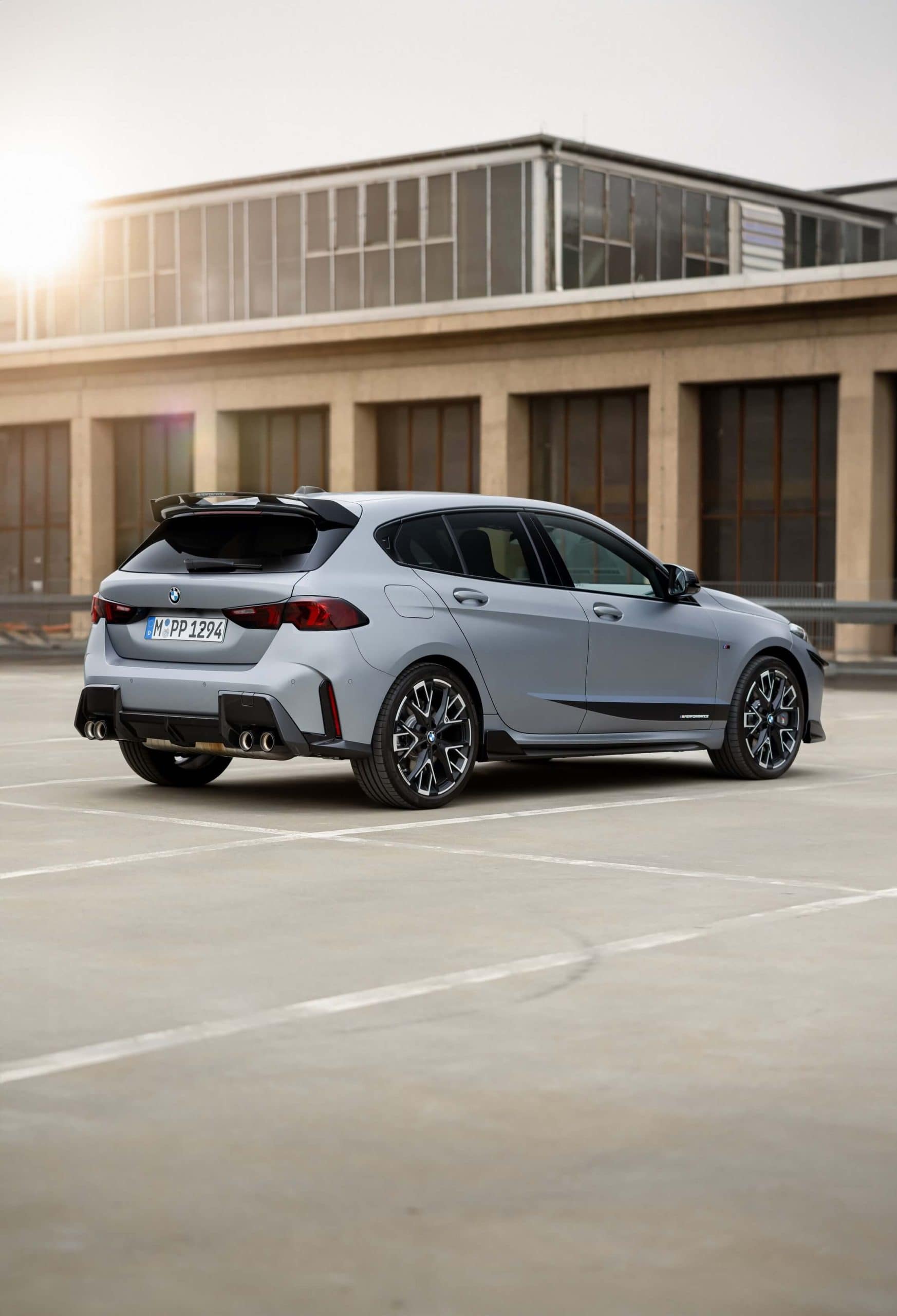 One standout change from the standard M135 is the chunky roof spoiler with “M Performance” white lettering. While the quad exhaust system is now standard on the flagship 1 Series, the stainless steel and carbon fiber finishers cost extra. BMW also shows off the optional 19-inch two-tone wheels with M Performance branding and even M-branded valve stem caps. We almost forgot the matte black decal running along the car’s sides.
