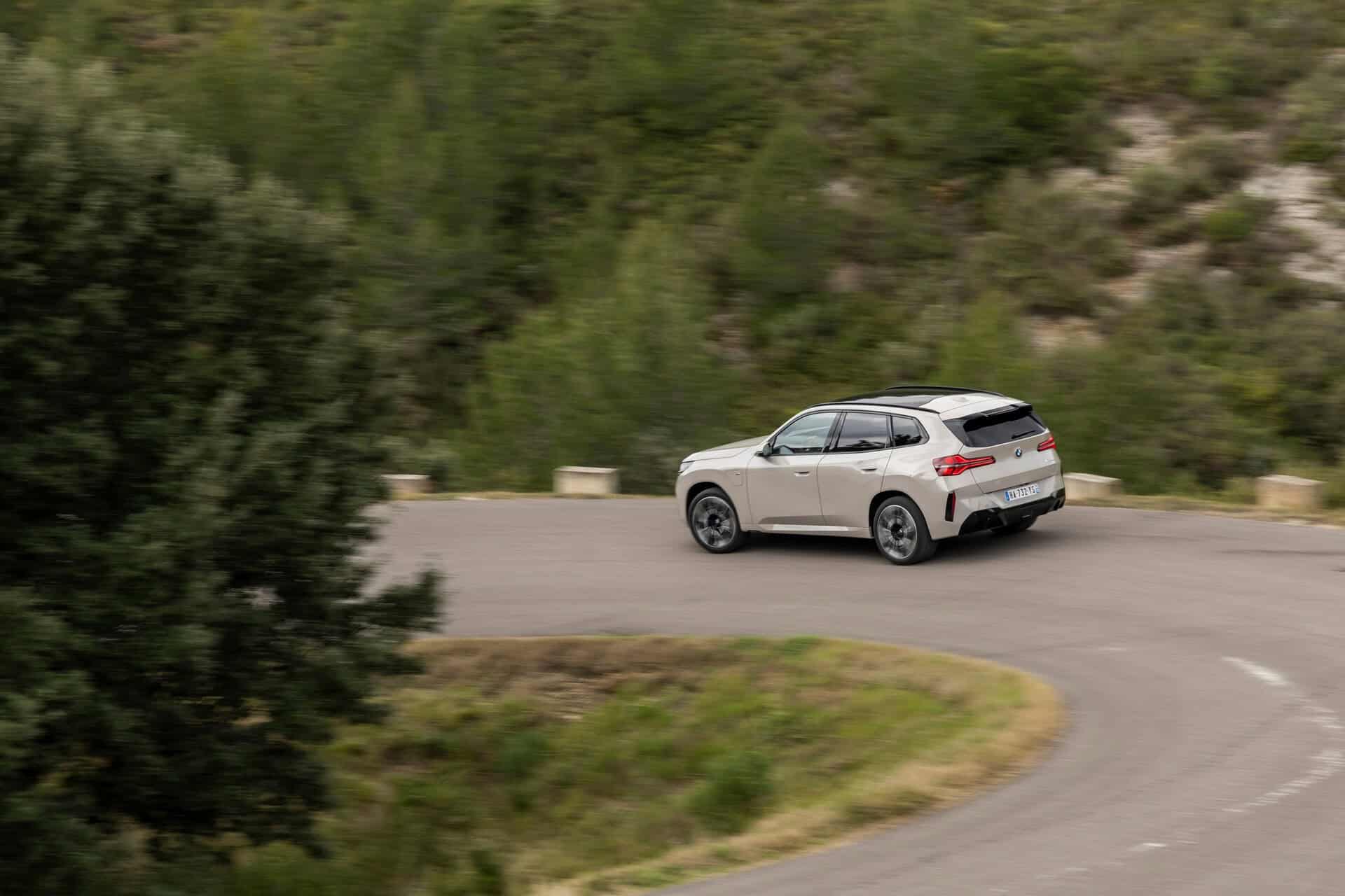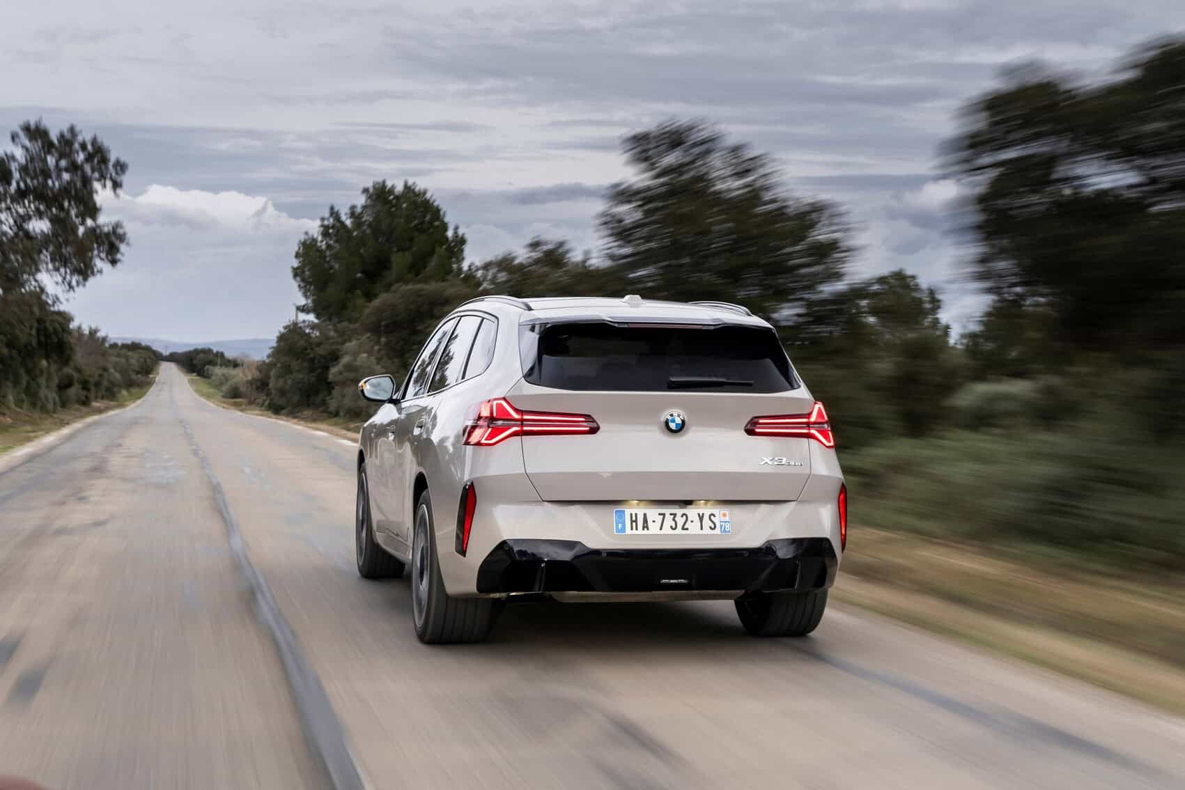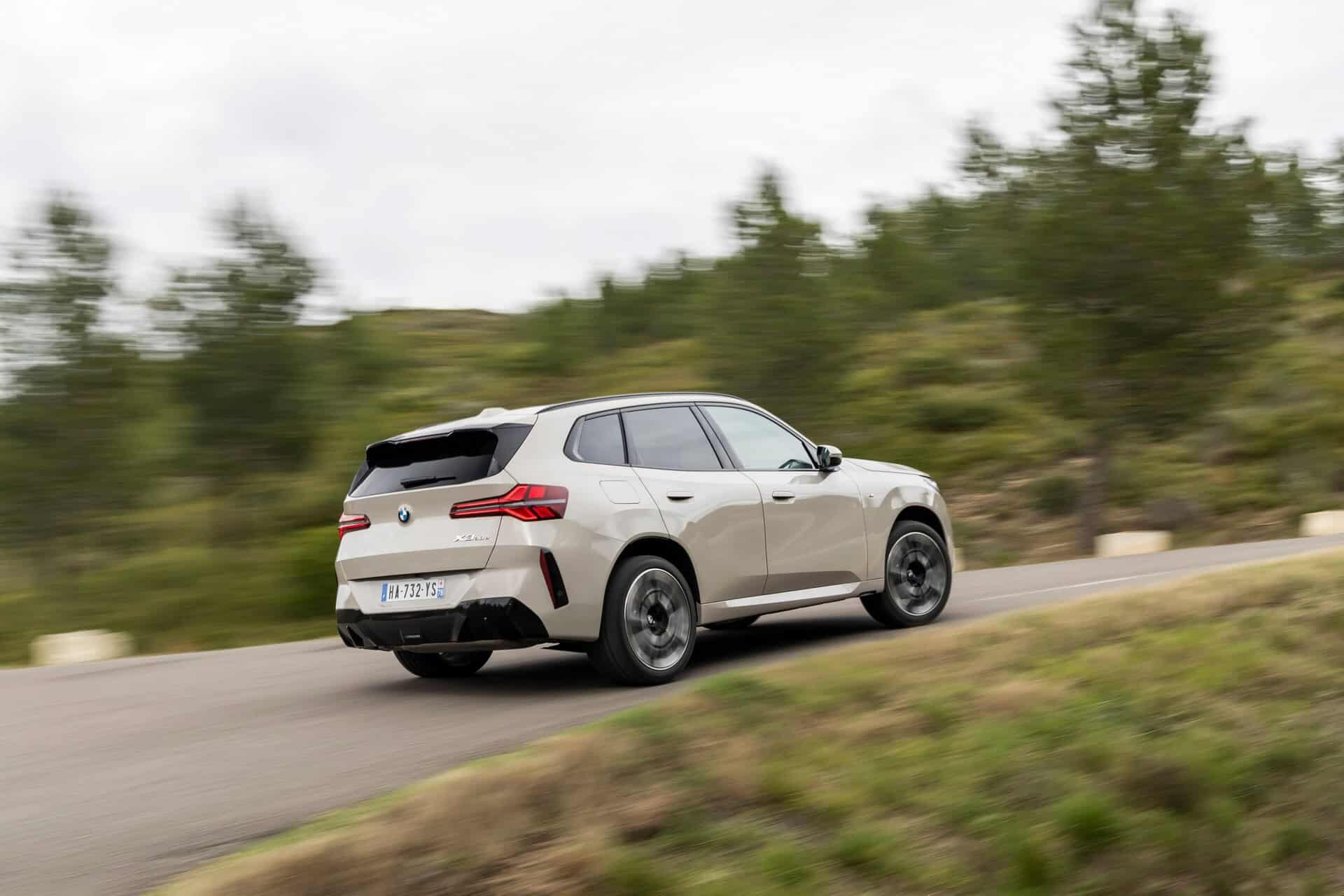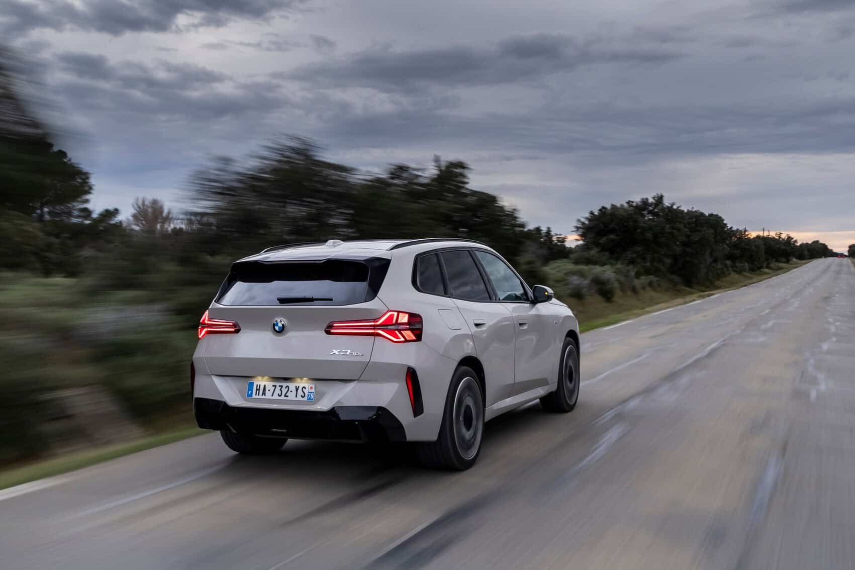 BMW France splurged on real leather, opting for Extended Merino Leather in Black/Atlas Grey M. Alternatively, there’s vegan upholstery and cloth seats, with or without Alcantara, in some areas. Going for the M Sport Package brings M badges on the flat-bottomed steering wheel and ahead of the wireless charging pad. This electrified X3 also has the optional sunroof and head-up display, among other extras.