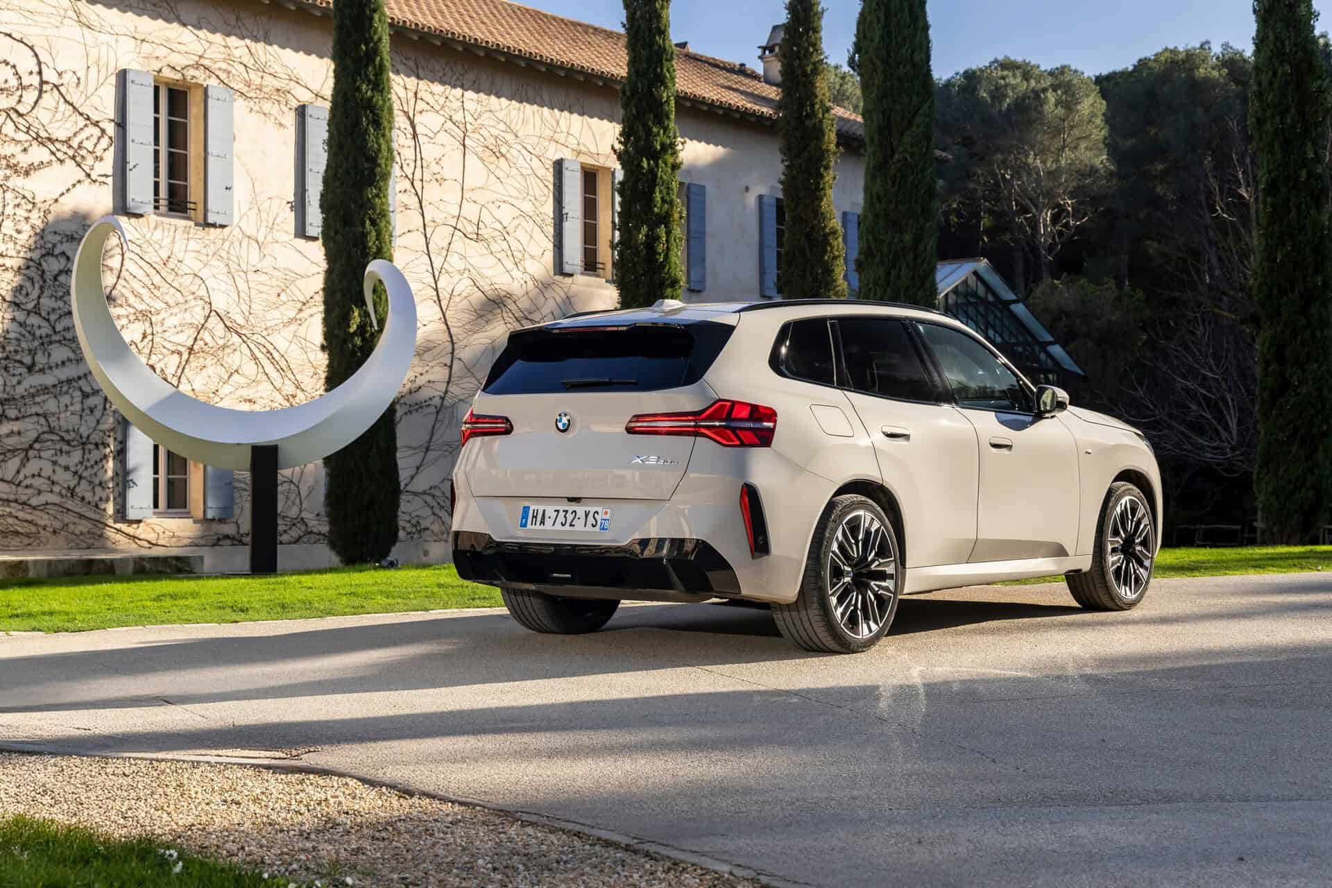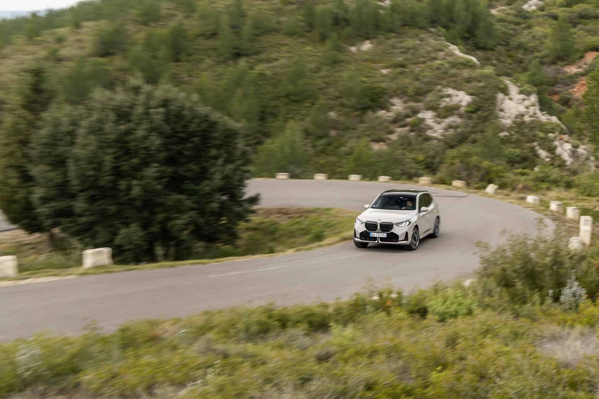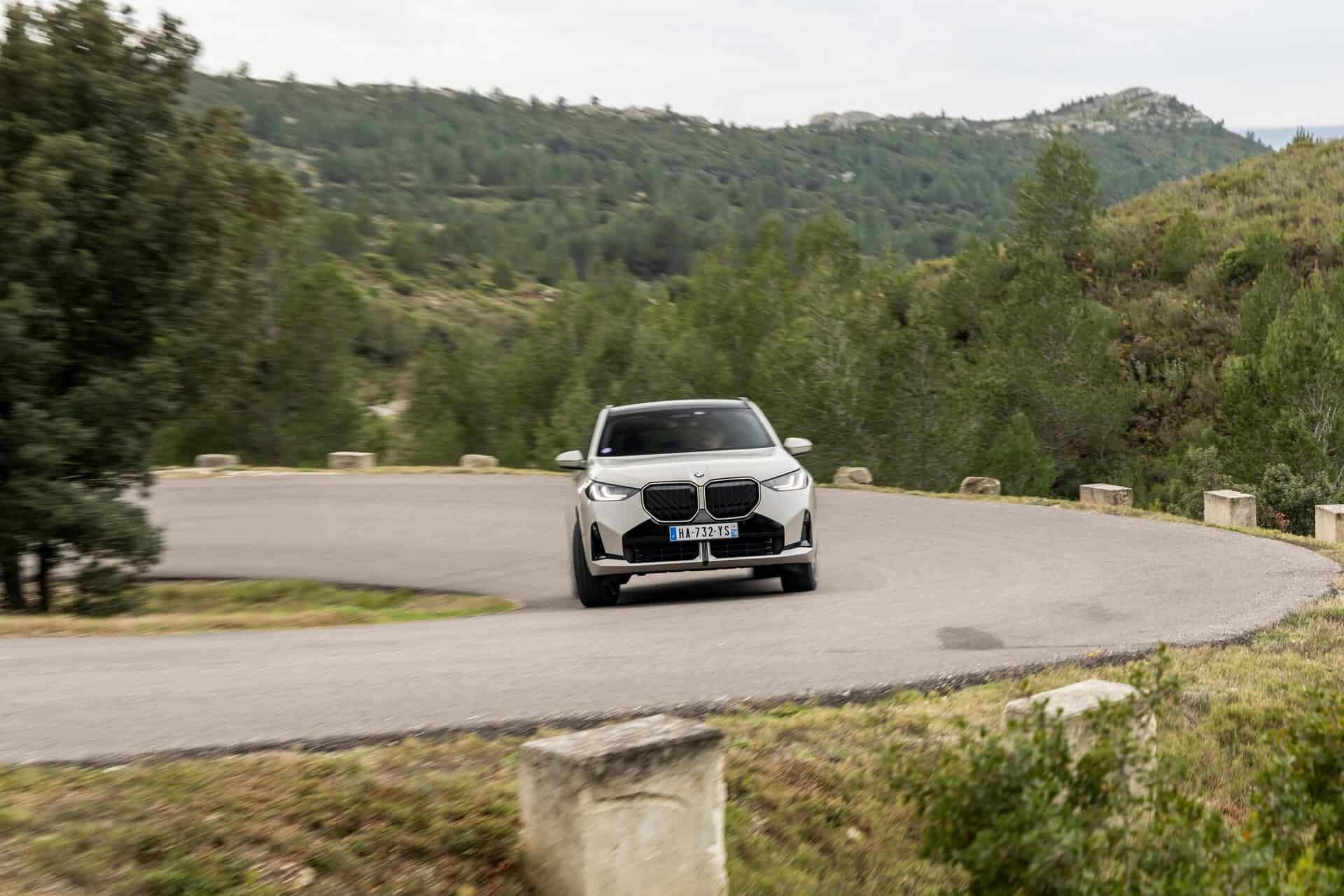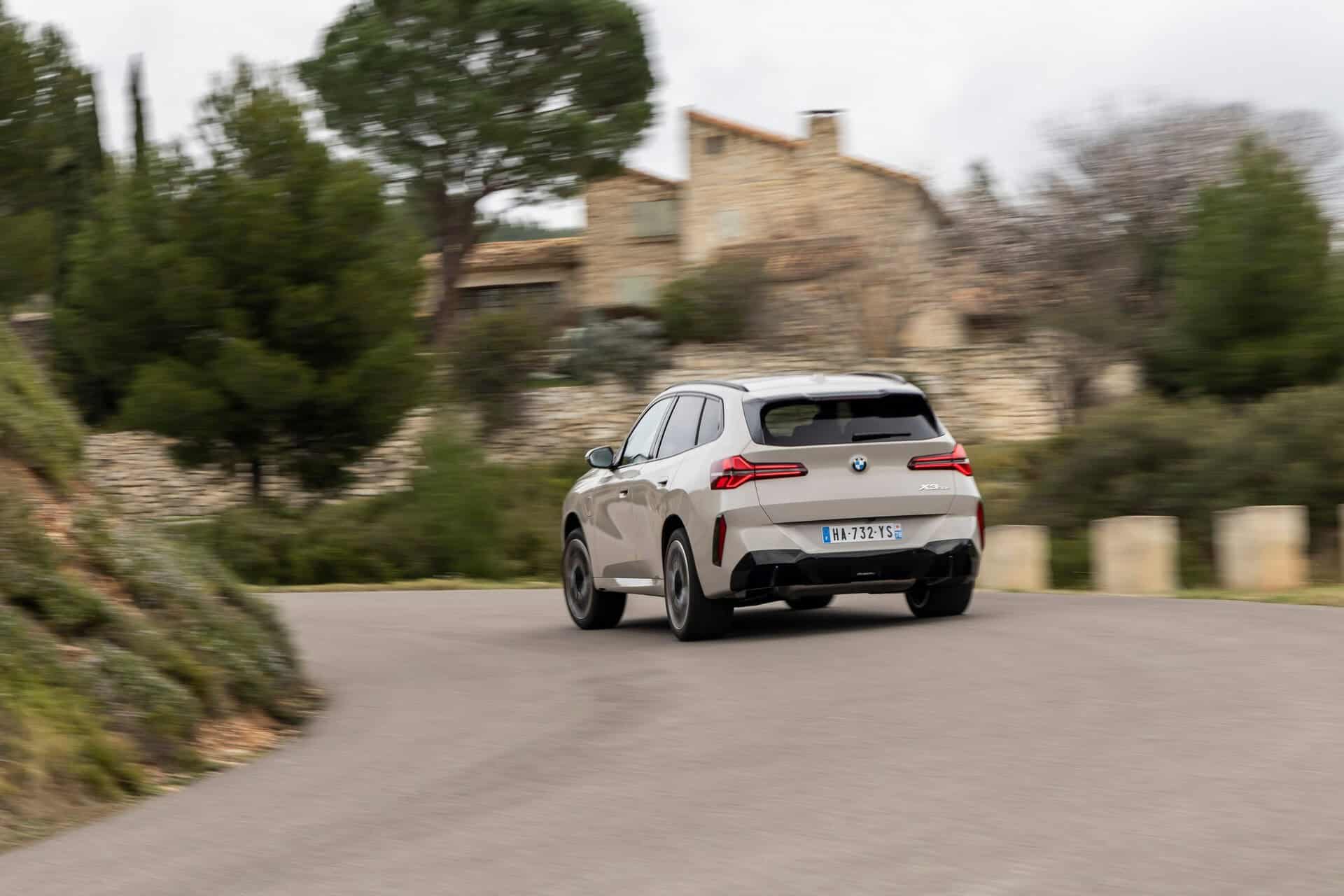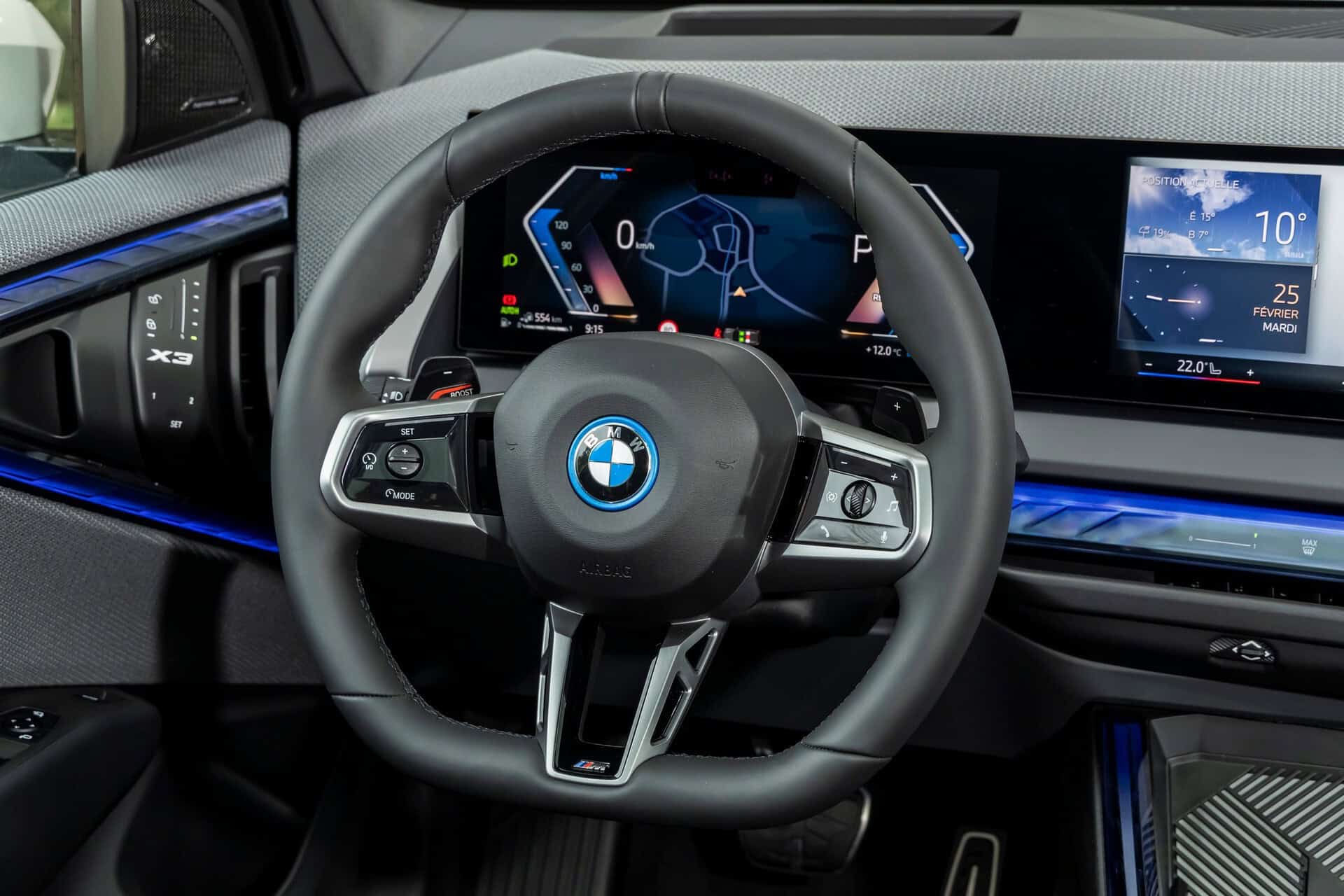 BMW France splurged on real leather, opting for Extended Merino Leather in Black/Atlas Grey M. Alternatively, there’s vegan upholstery and cloth seats, with or without Alcantara, in some areas. Going for the M Sport Package brings M badges on the flat-bottomed steering wheel and ahead of the wireless charging pad. This electrified X3 also has the optional sunroof and head-up display, among other extras.