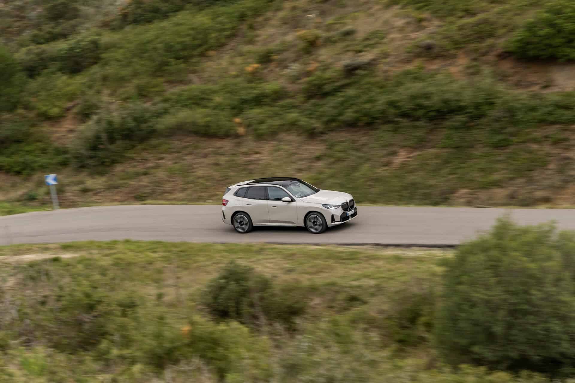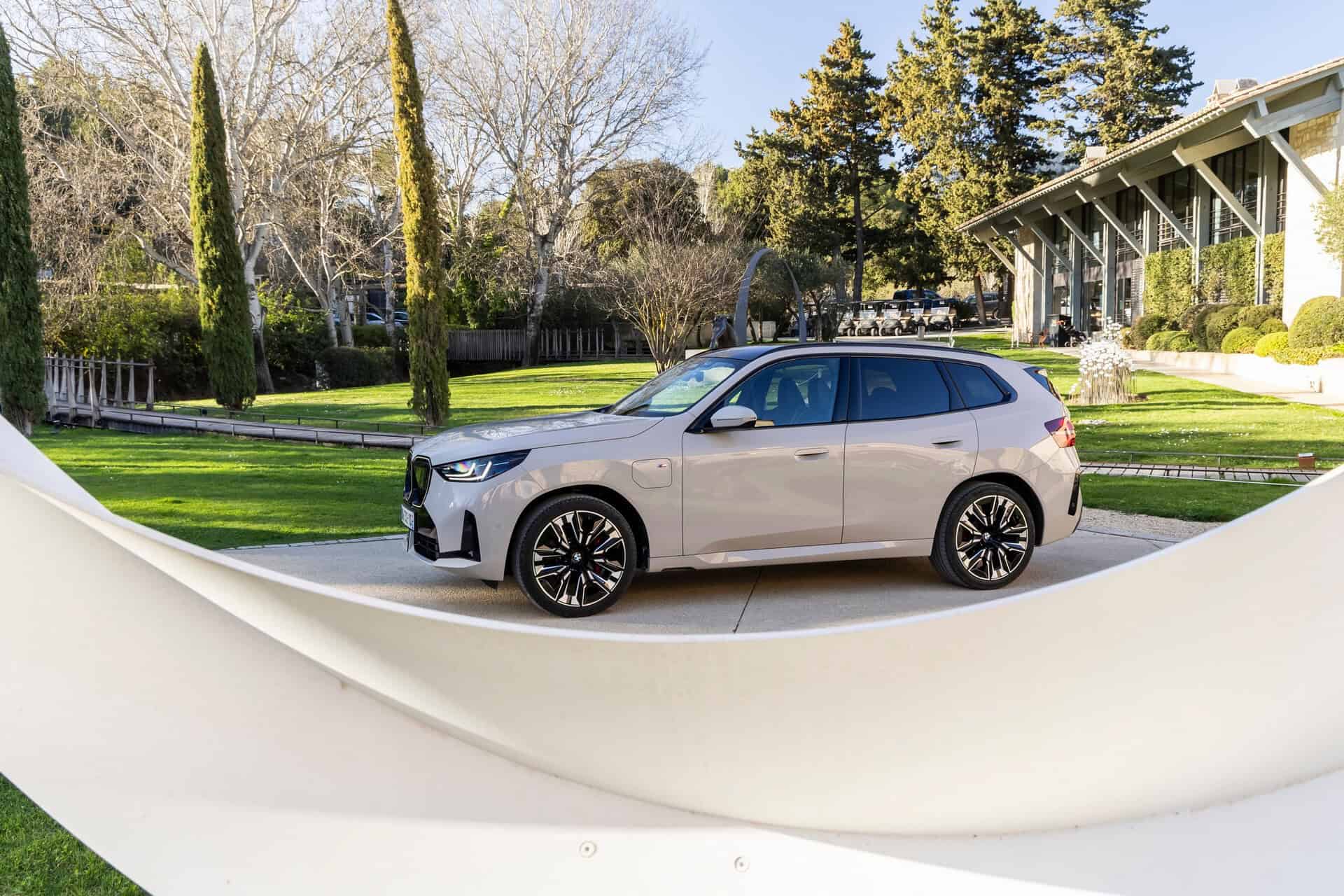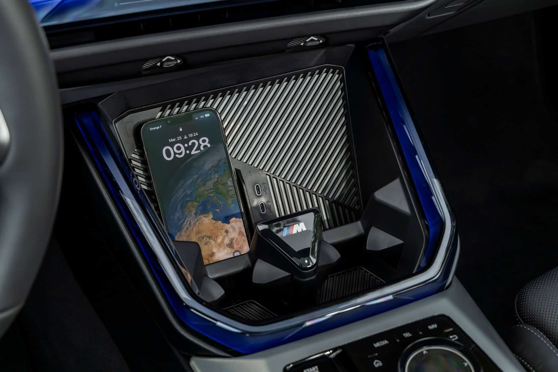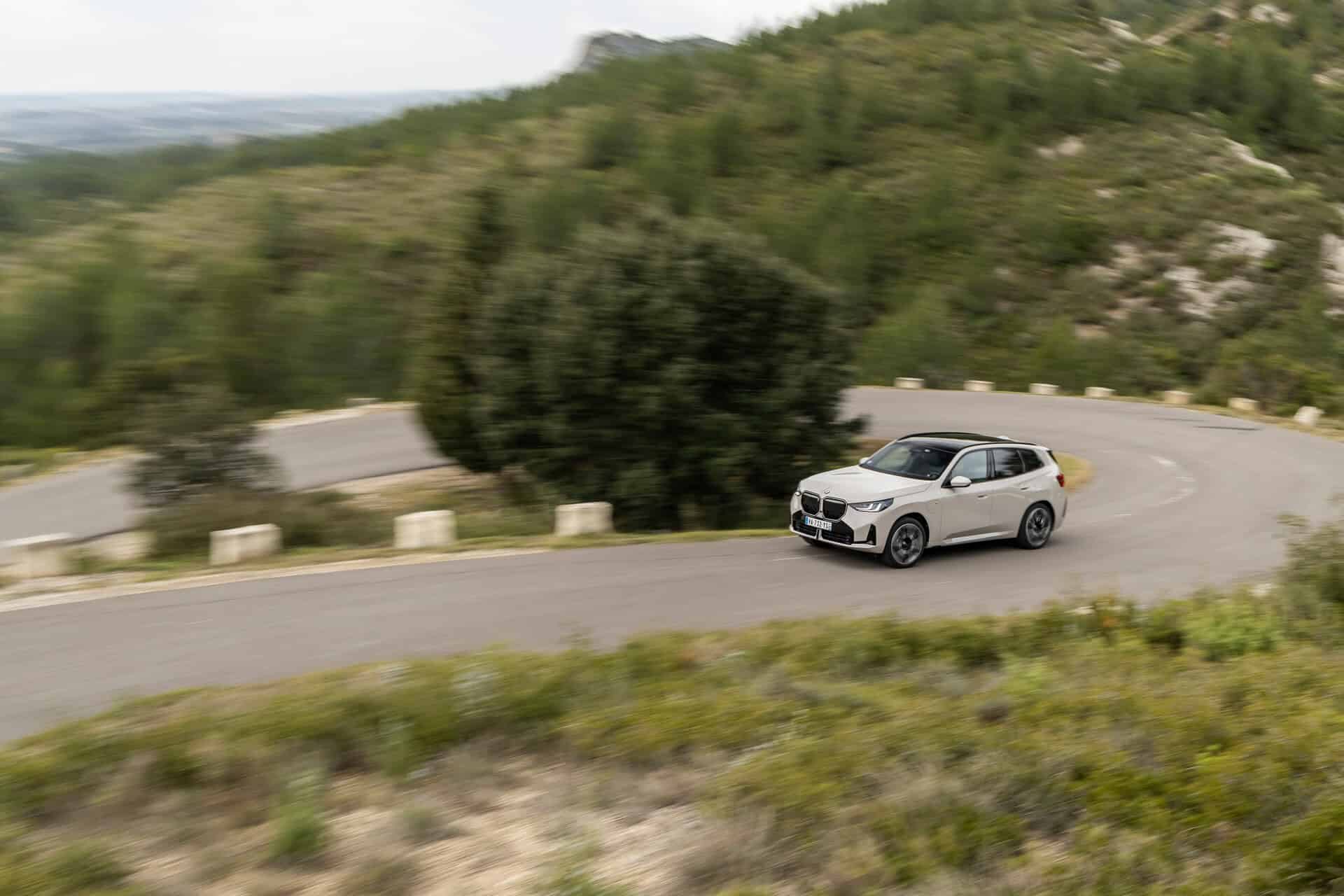 BMW France splurged on real leather, opting for Extended Merino Leather in Black/Atlas Grey M. Alternatively, there’s vegan upholstery and cloth seats, with or without Alcantara, in some areas. Going for the M Sport Package brings M badges on the flat-bottomed steering wheel and ahead of the wireless charging pad. This electrified X3 also has the optional sunroof and head-up display, among other extras.