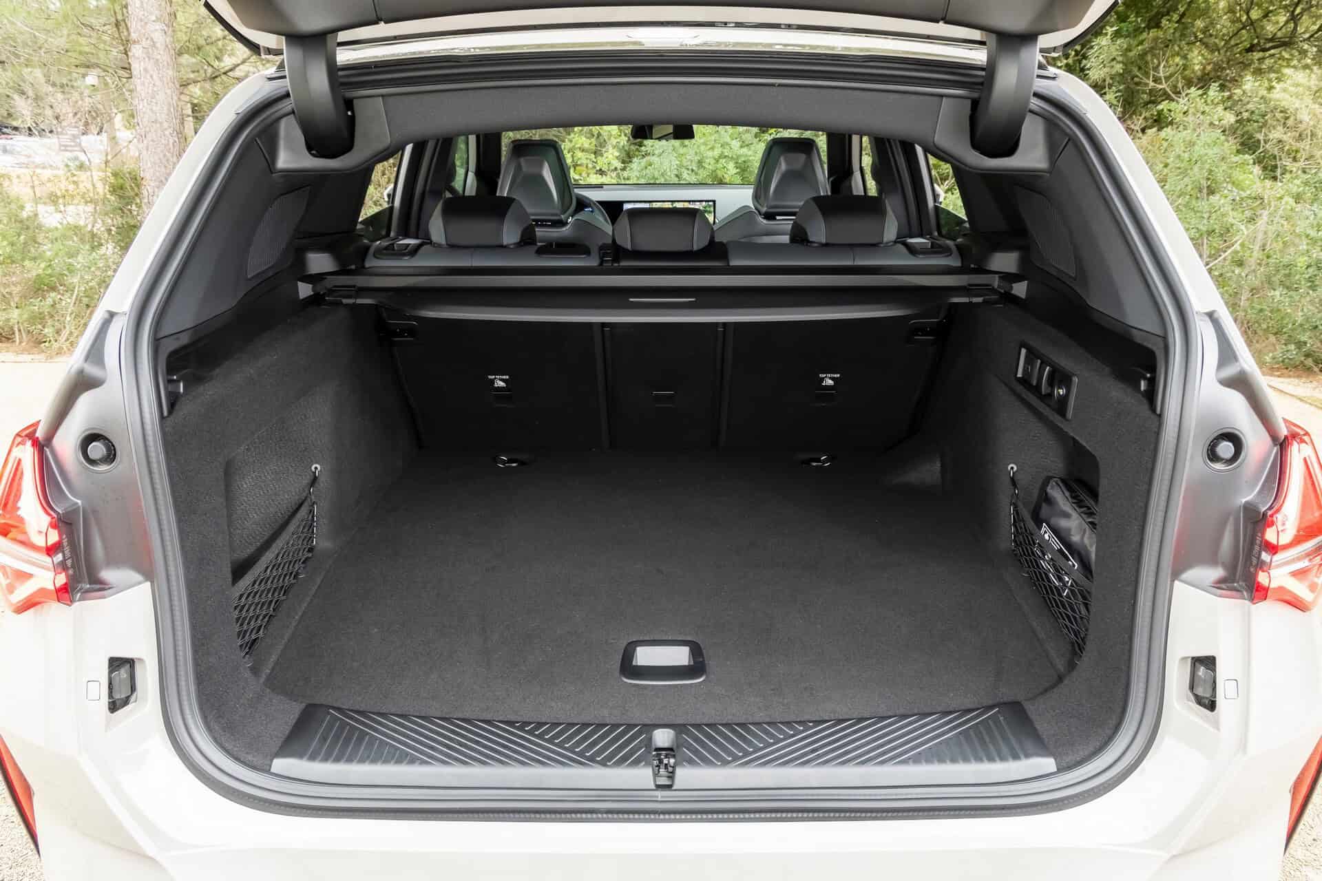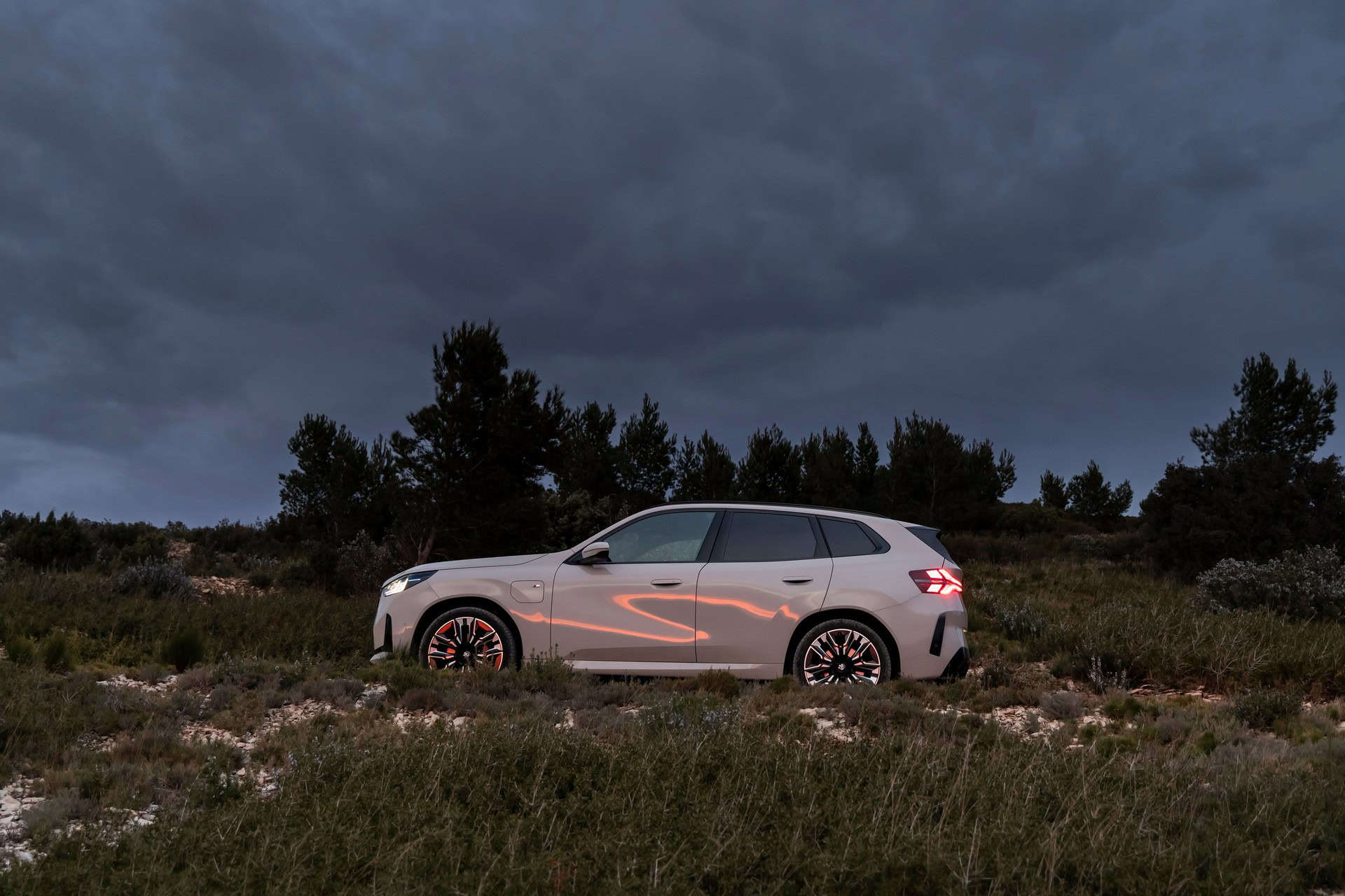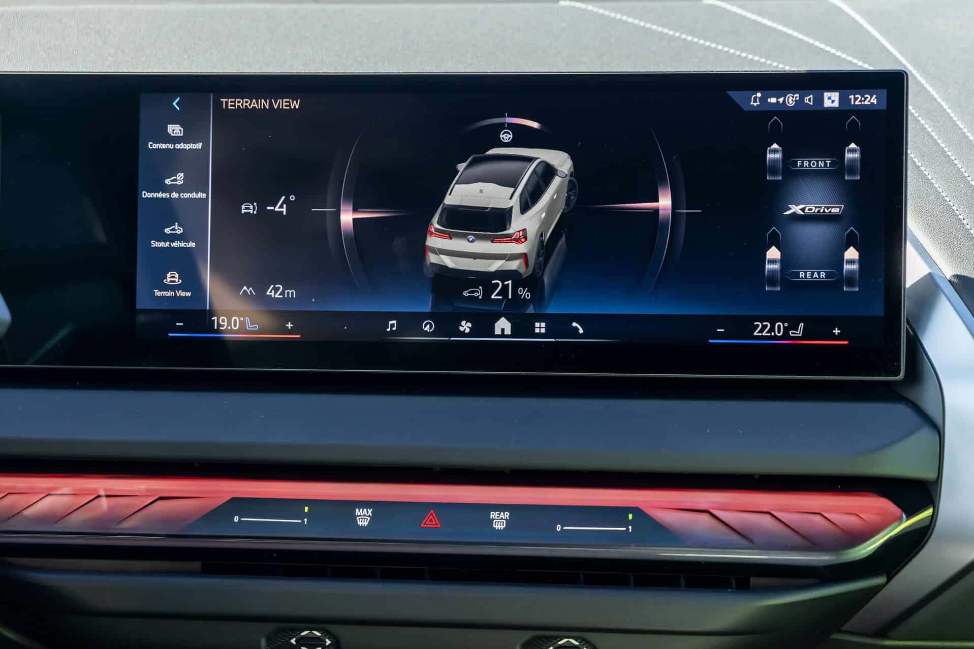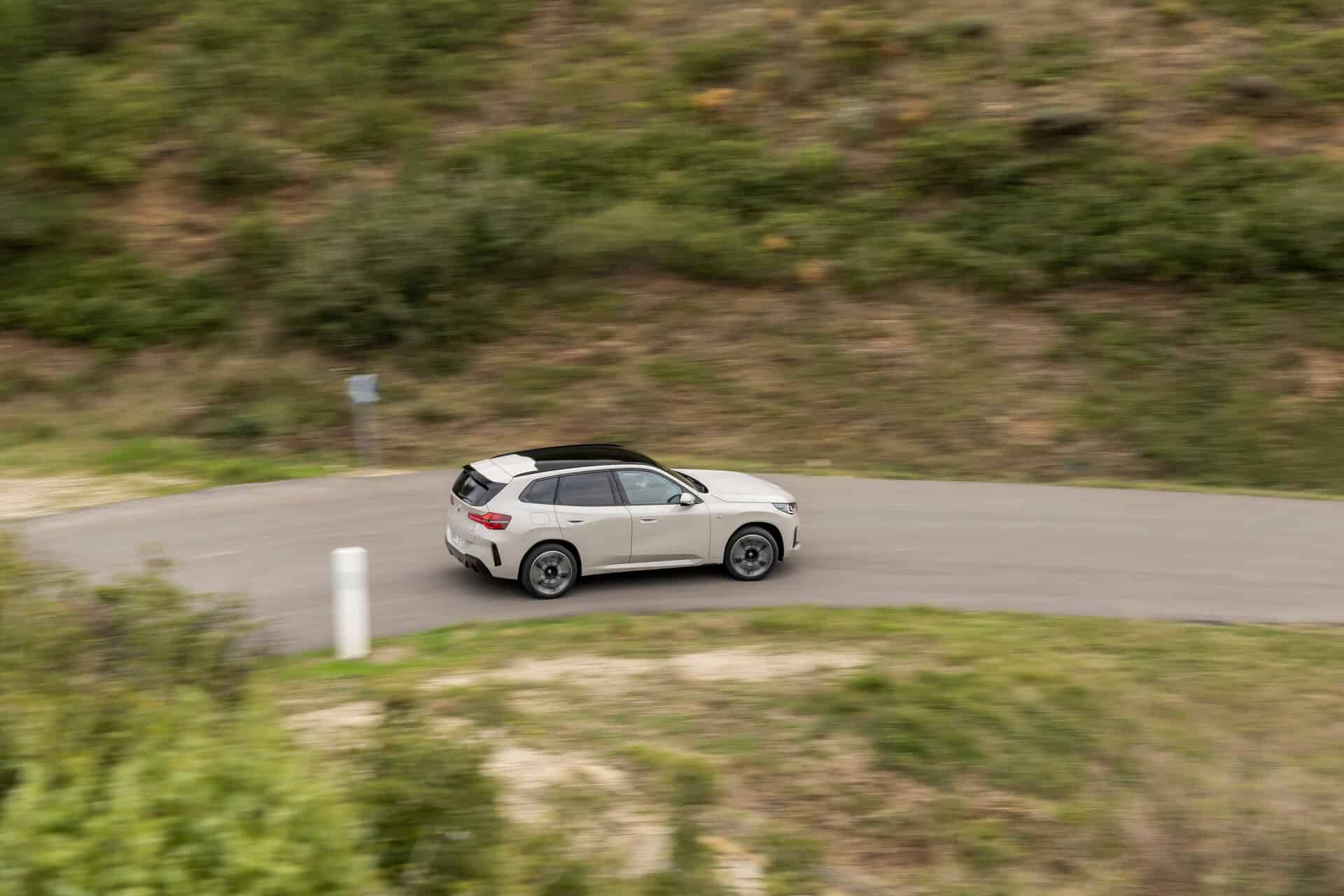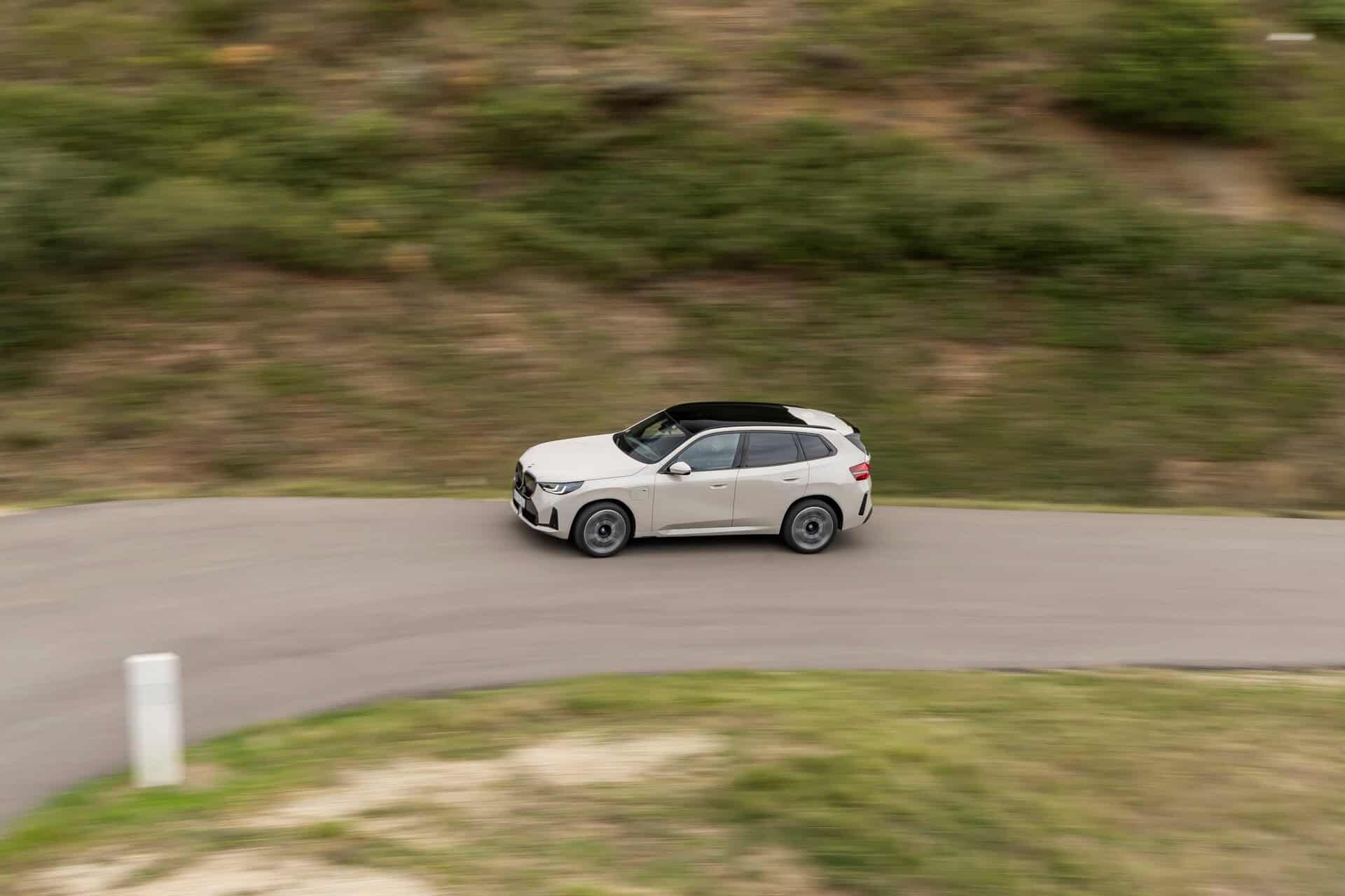 BMW France splurged on real leather, opting for Extended Merino Leather in Black/Atlas Grey M. Alternatively, there’s vegan upholstery and cloth seats, with or without Alcantara, in some areas. Going for the M Sport Package brings M badges on the flat-bottomed steering wheel and ahead of the wireless charging pad. This electrified X3 also has the optional sunroof and head-up display, among other extras.