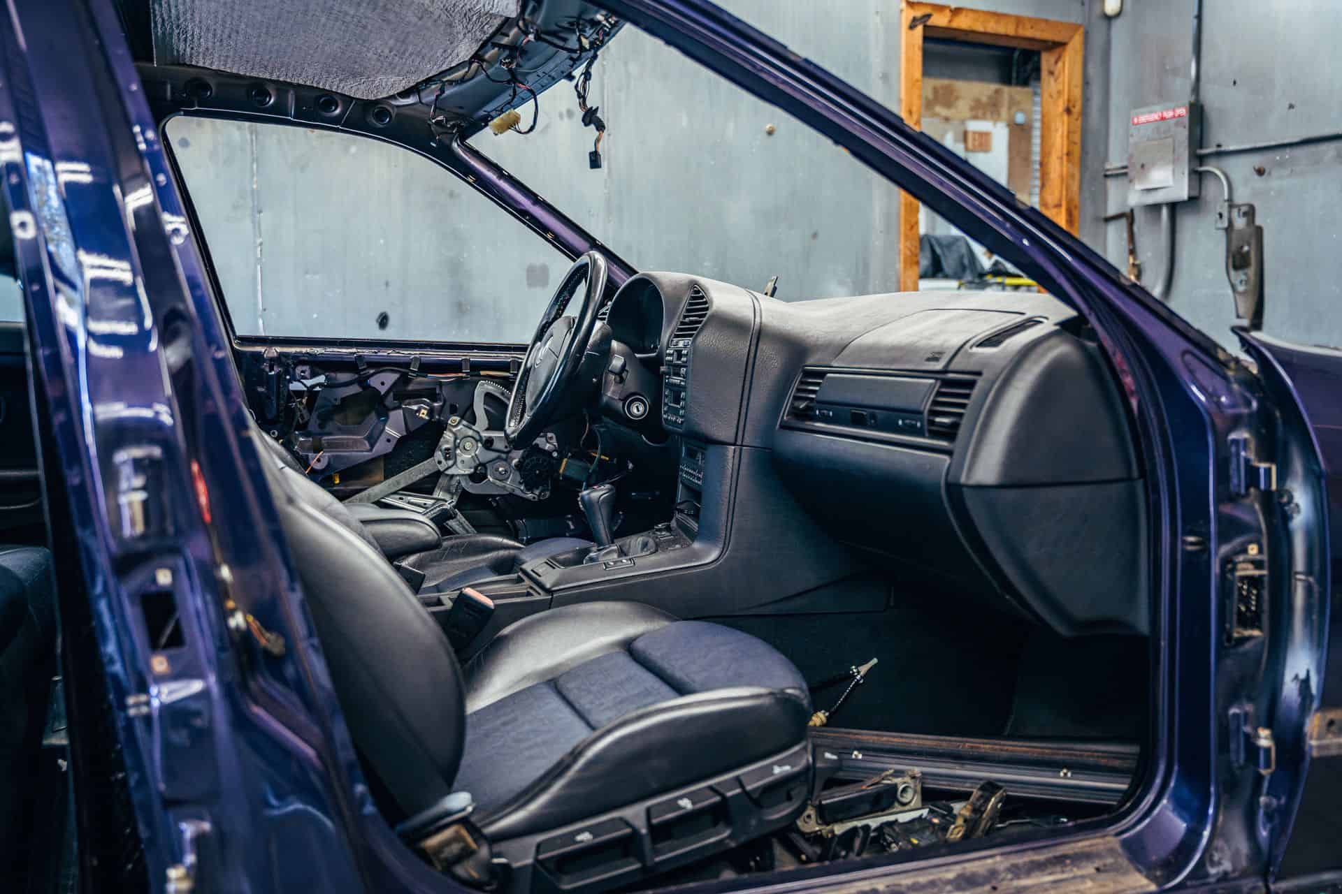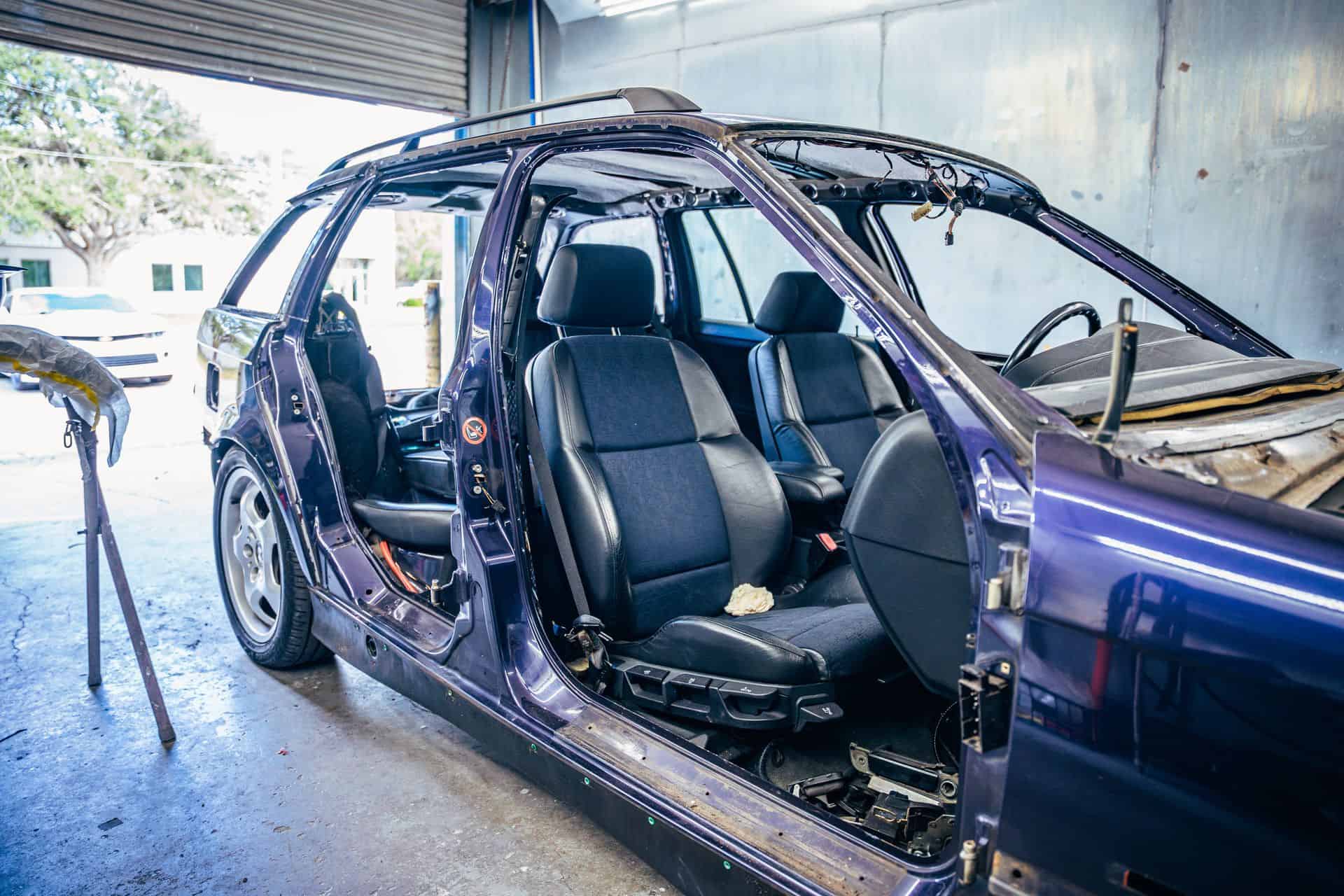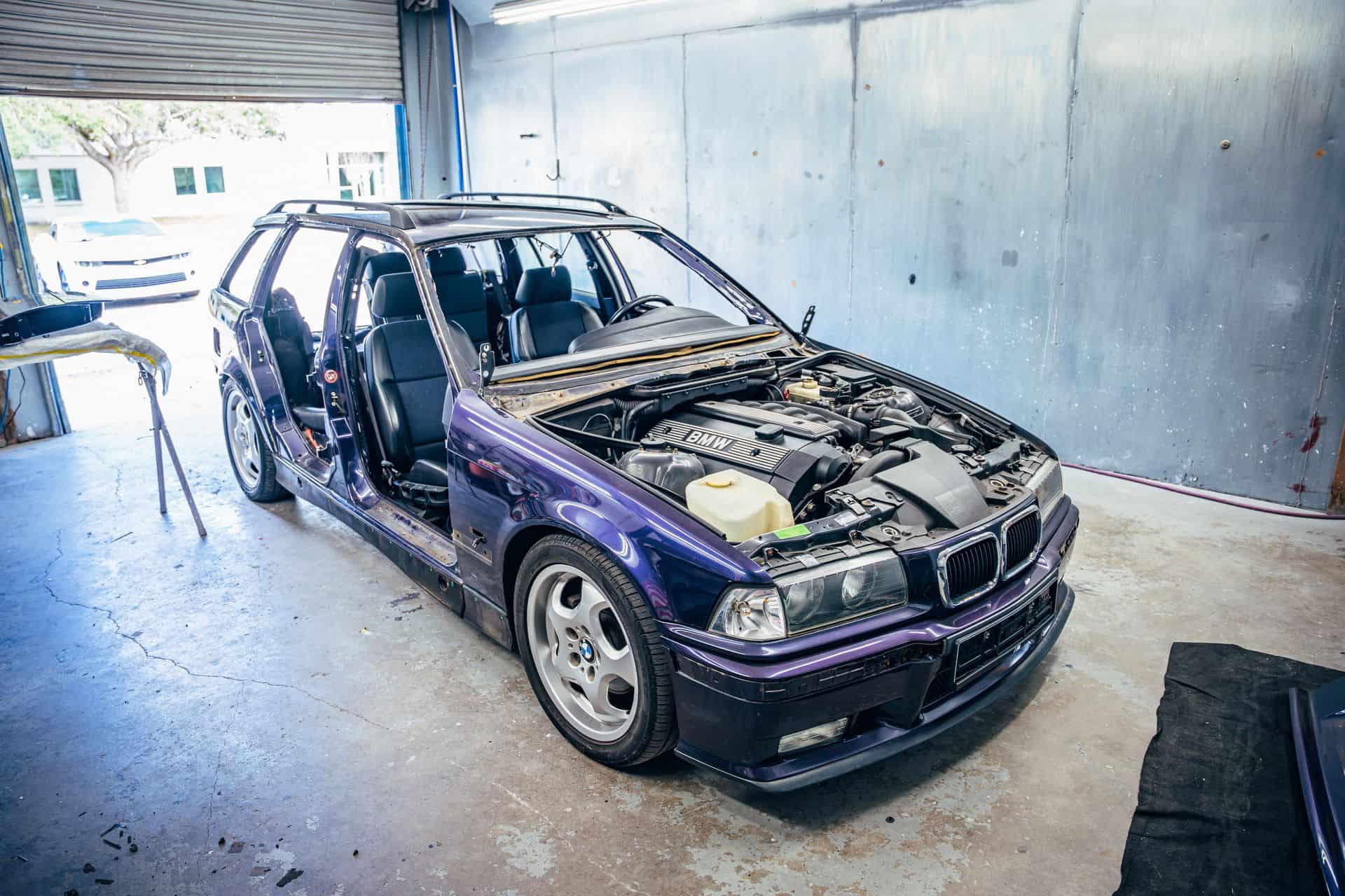 This 328i Touring—VIN EV09078—left the factory on November 30th, 1996. Initial delivery occurred on December 3rd, 1996, at Autohaus Buder-Hubatsch in WeiĂźwasser, Oberlausitz, Germany. It came from the factory in quintessential “enthusiast spec:” Techno Violet metallic paint with black leather/cloth upholstery, no sunroof, a manual transmission, and the M Sport Package. The original owner(s) used the car as intended. As a result, the vehicle has seen the full force of the elements, suffering heavy rust. But 25 years later, it has taken on a new life. It was shipped to its new owner in the US, Sean (President of Precision Sport Industries), in 2022. It sat for a little bit more time while its new steward collected parts to bring his restoration vision to life.