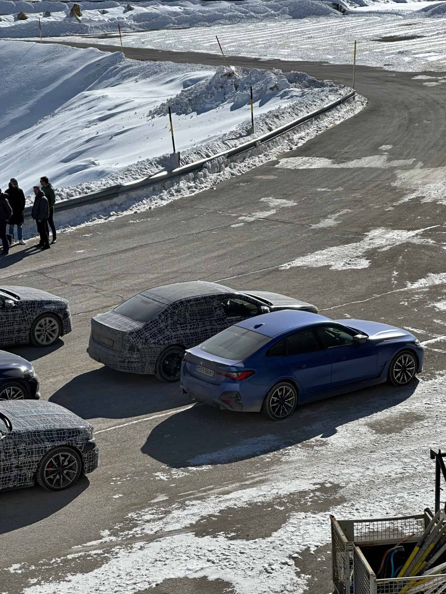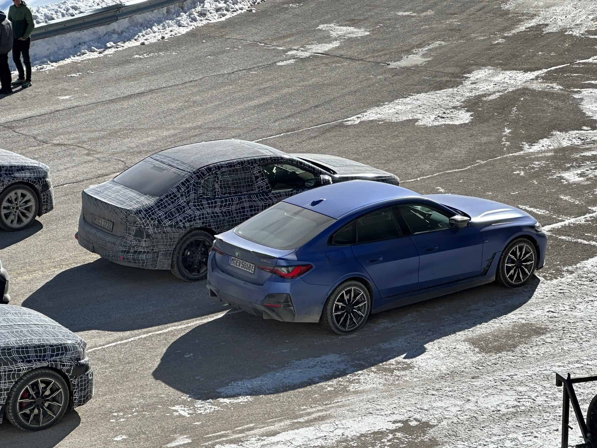 The two cars have different beltlines. It gently rises closer to the Hofmeister kink on the gas 3 Series, whereas the i3 has a flatter beltline. Conveniently, between the two cars is a current-generation 3 Series “G20.” Of the three, the electric prototype appears to be the smallest and seemingly has a slightly shorter front overhang. We also see another i3 prototype in front of them, joined by an i4 M50, finished in what appears to be Frozen Portimao Blue.