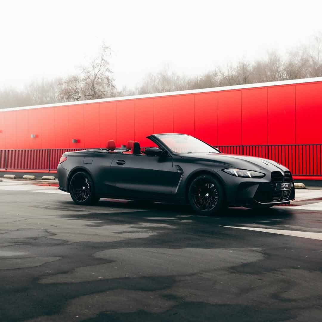 Whoever had the opportunity to configure this build didn’t skimp on options. The M4 Convertible is finished in Frozen Deep Grey Metallic, a matte finish from the Individual catalog. We personally would’ve opted for the new-for-2025 silver wheels, but I guess this black set complements the dark body. The carbon side mirror caps and front bucket seats are other telltale signs this isn’t an ordinary convertible.