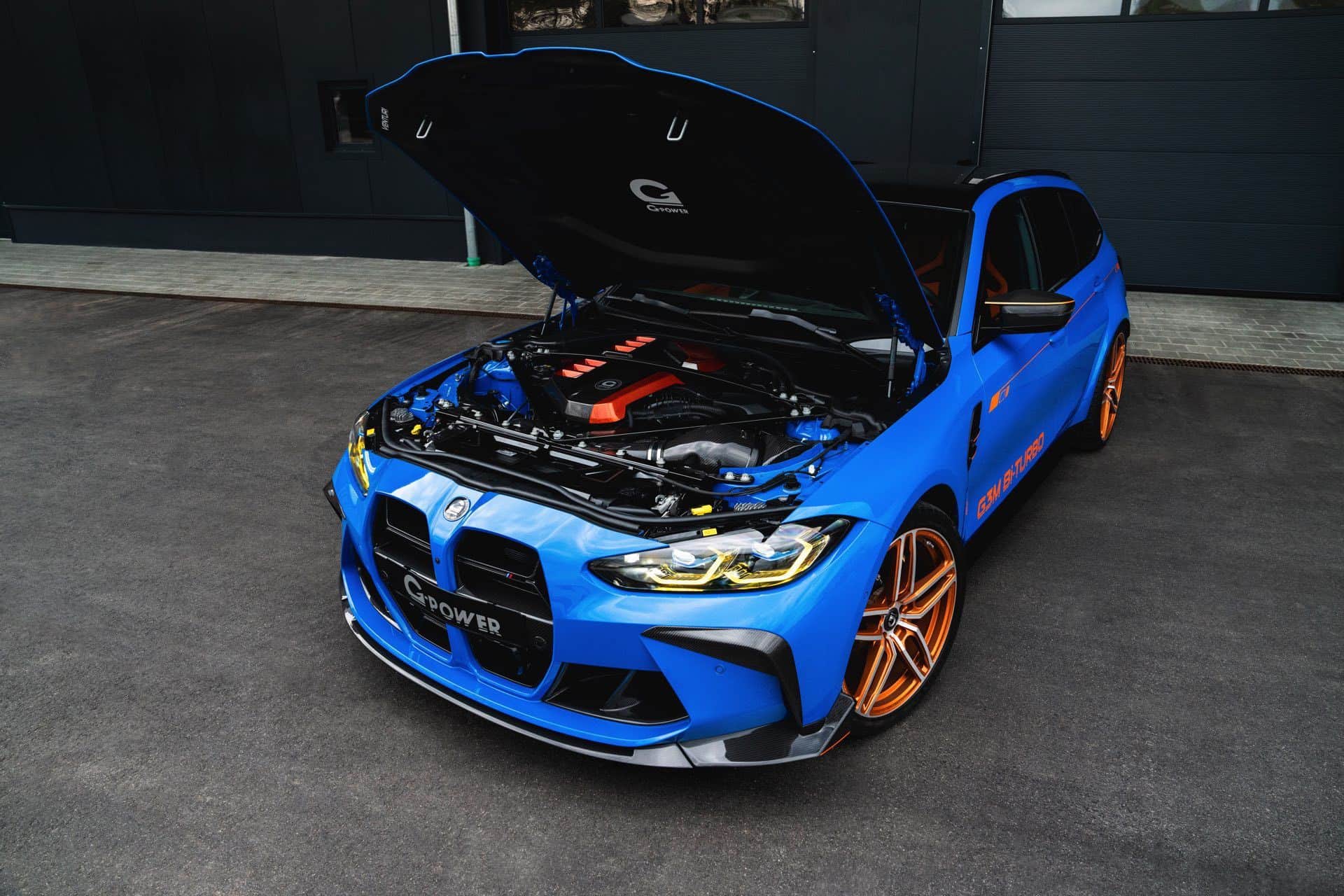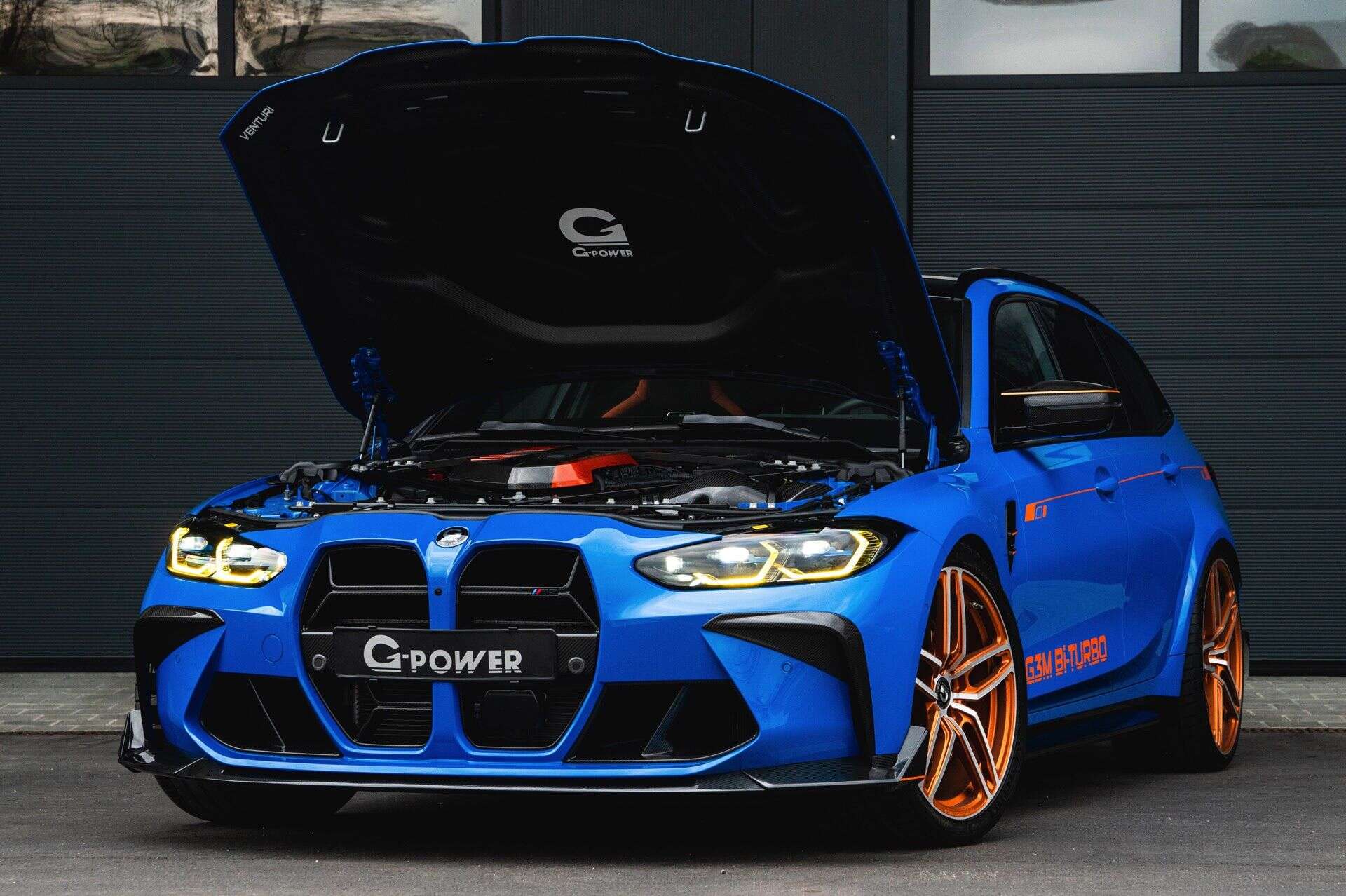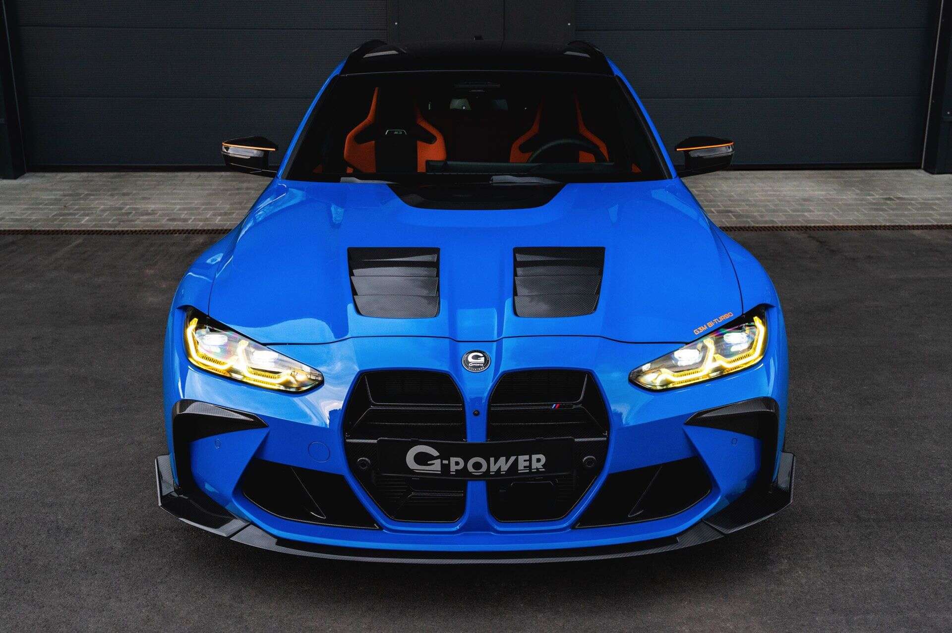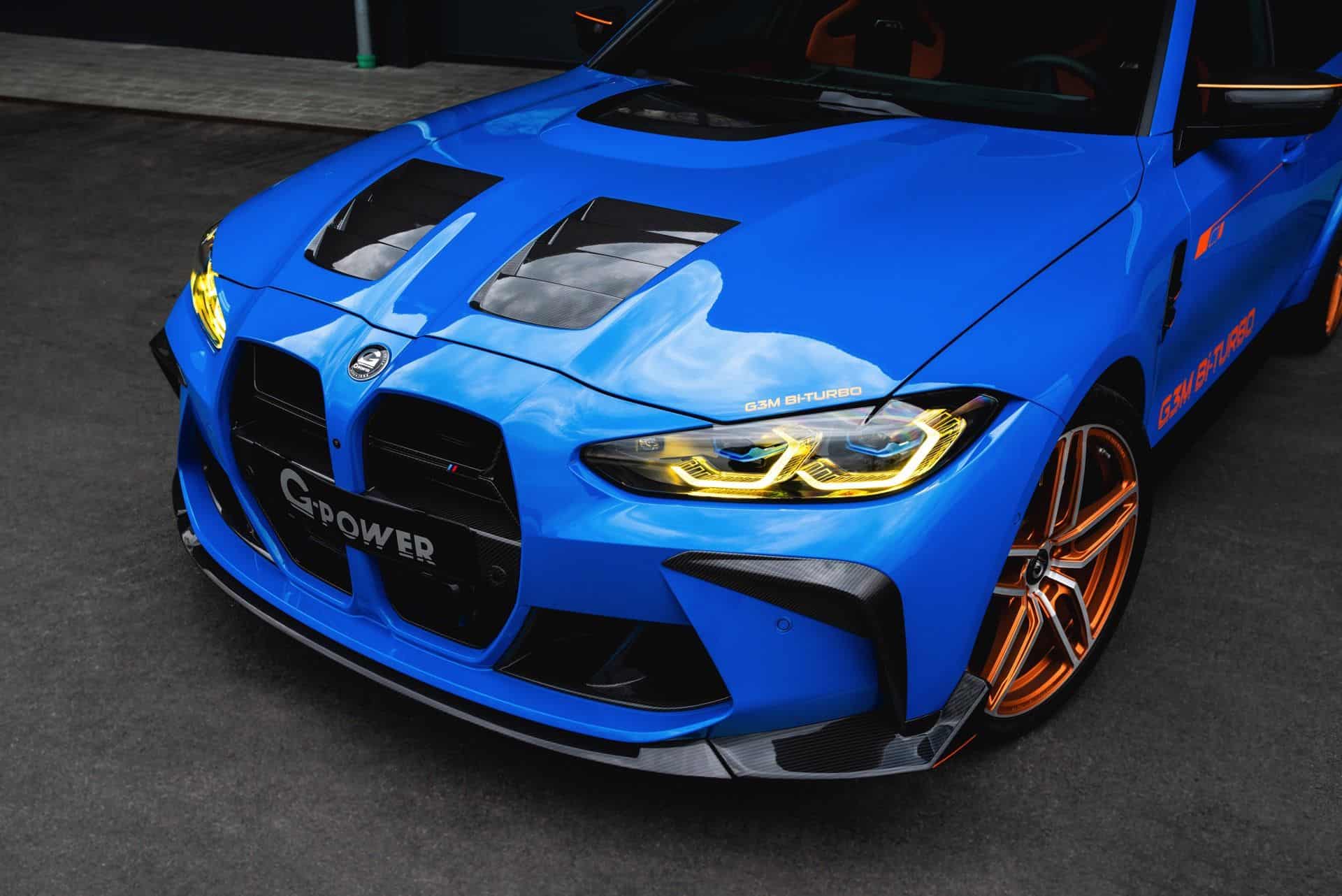 In terms of design, the G3M Bi-TURBO is visually striking, starting with the Voodoo Blue paint finish, contrasted by a host of carbon fiber components and G-POWER’s signature orange accents. Chief among these upgrades is the carbon fiber Venturi hood, offered in an RS specification that is partially painted to match the bodywork. It also has a functional role, thanks to the vents which improves cooling.