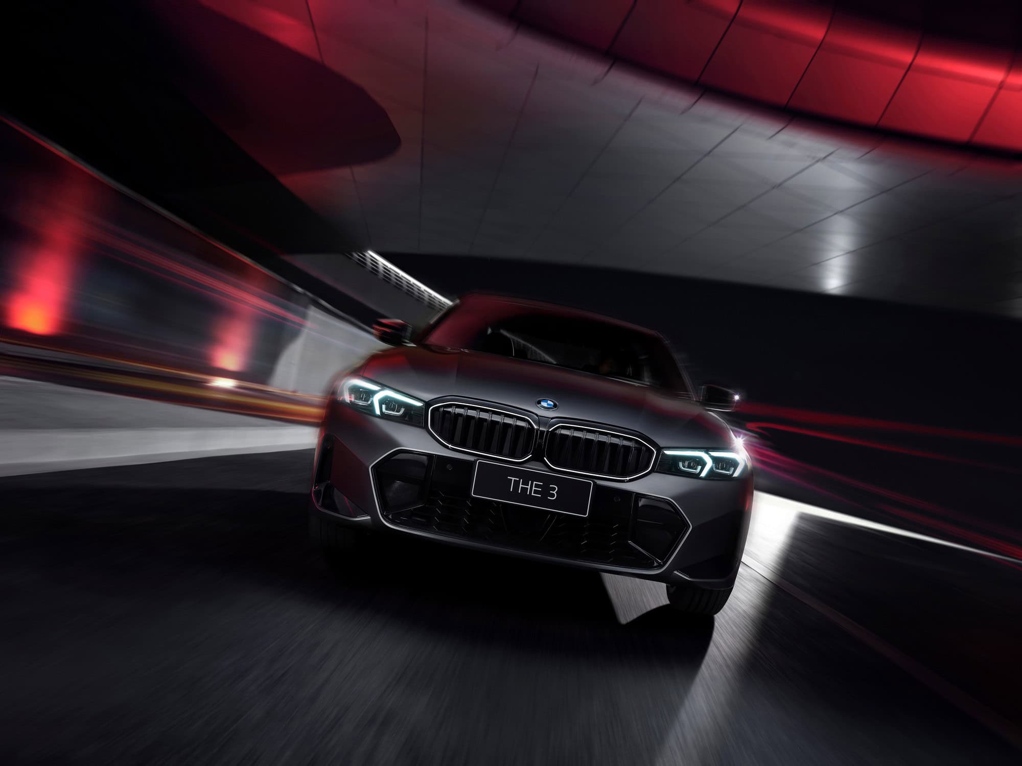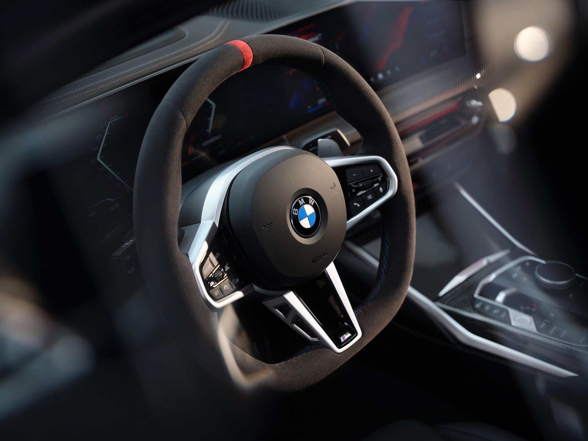 Speaking of the cabin, the Alcantara-wrapped steering wheel with a red 12 o’clock mark might suggest you’re looking at an M340i or even an M3. The carbon fiber trim also adds a more performance-oriented touch than you’d expect in a typical 330i. BMW tells us the 50 Years Edition is the first 3 Series sold in China to feature Alcantara accents, combined here with Sensatec (artificial leather). A large “3” graphic embroidered into the headrests adds a finishing touch.