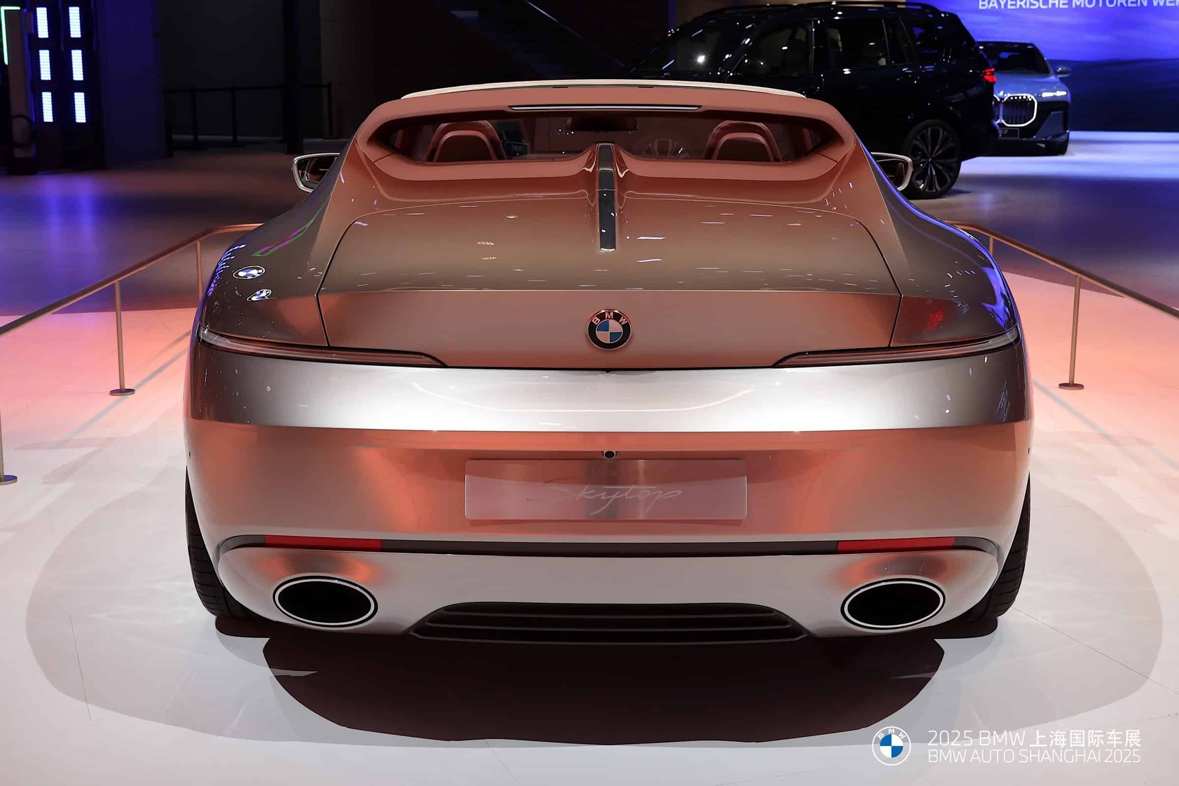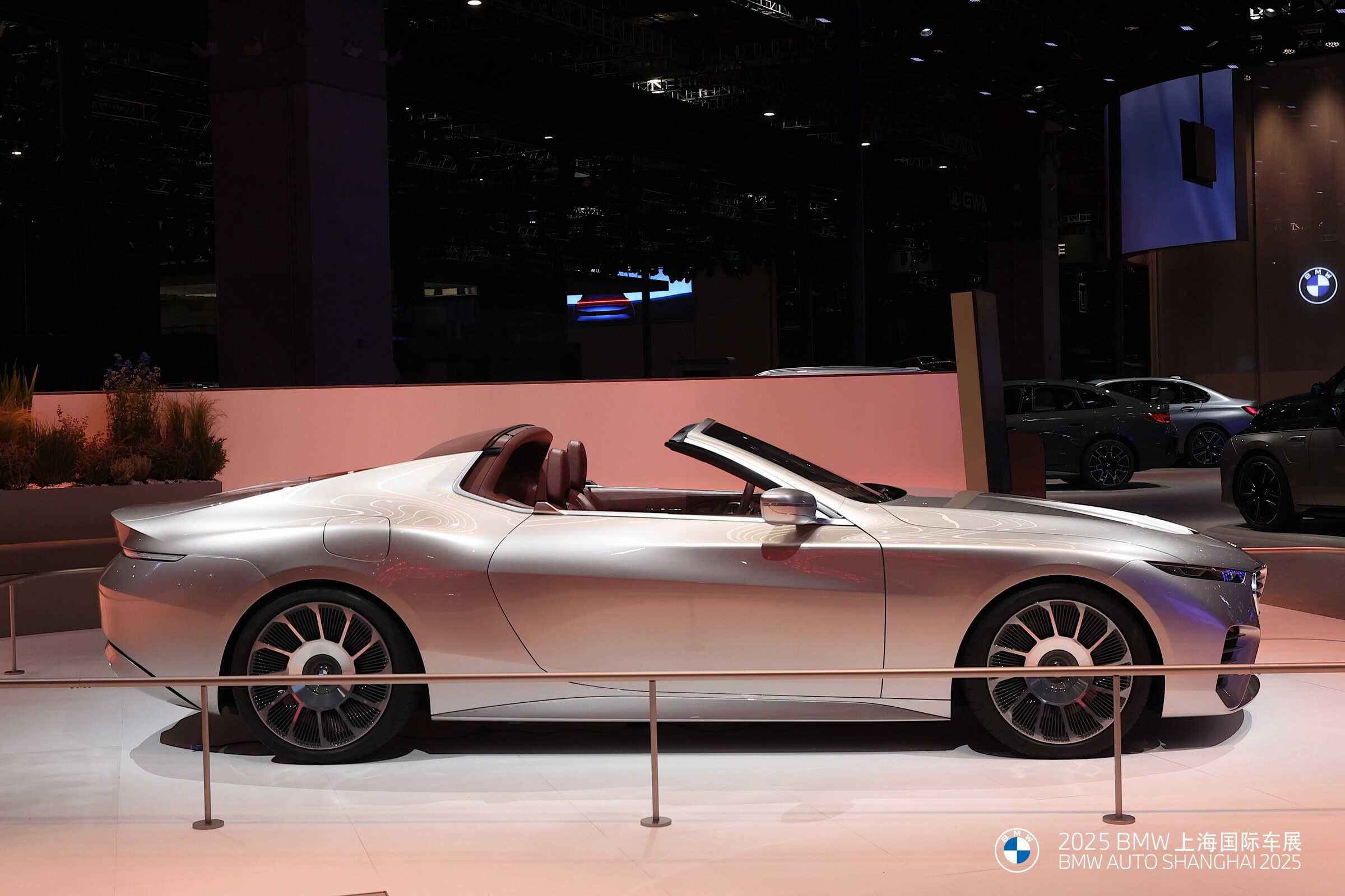 BMW is showcasing the Skytop without the targa top, which features two manually removable panels wrapped in leather. When the reddish-brown roof is removed, the parts are stored in a dedicated area of the cargo compartment. Beyond the special body reminiscent of the Z8 and 507, the car features the thinnest headlights of any model the Bavarian marque makes today. It also features a unique set of wheels styled to resemble turbines.