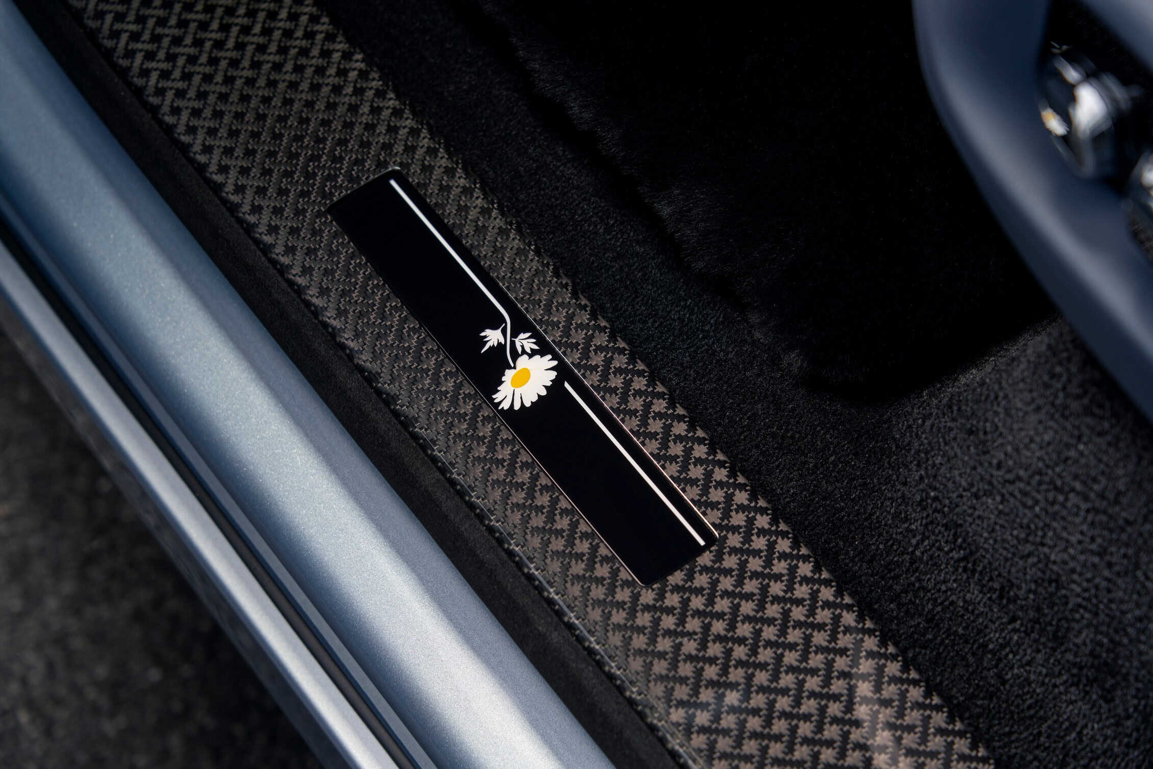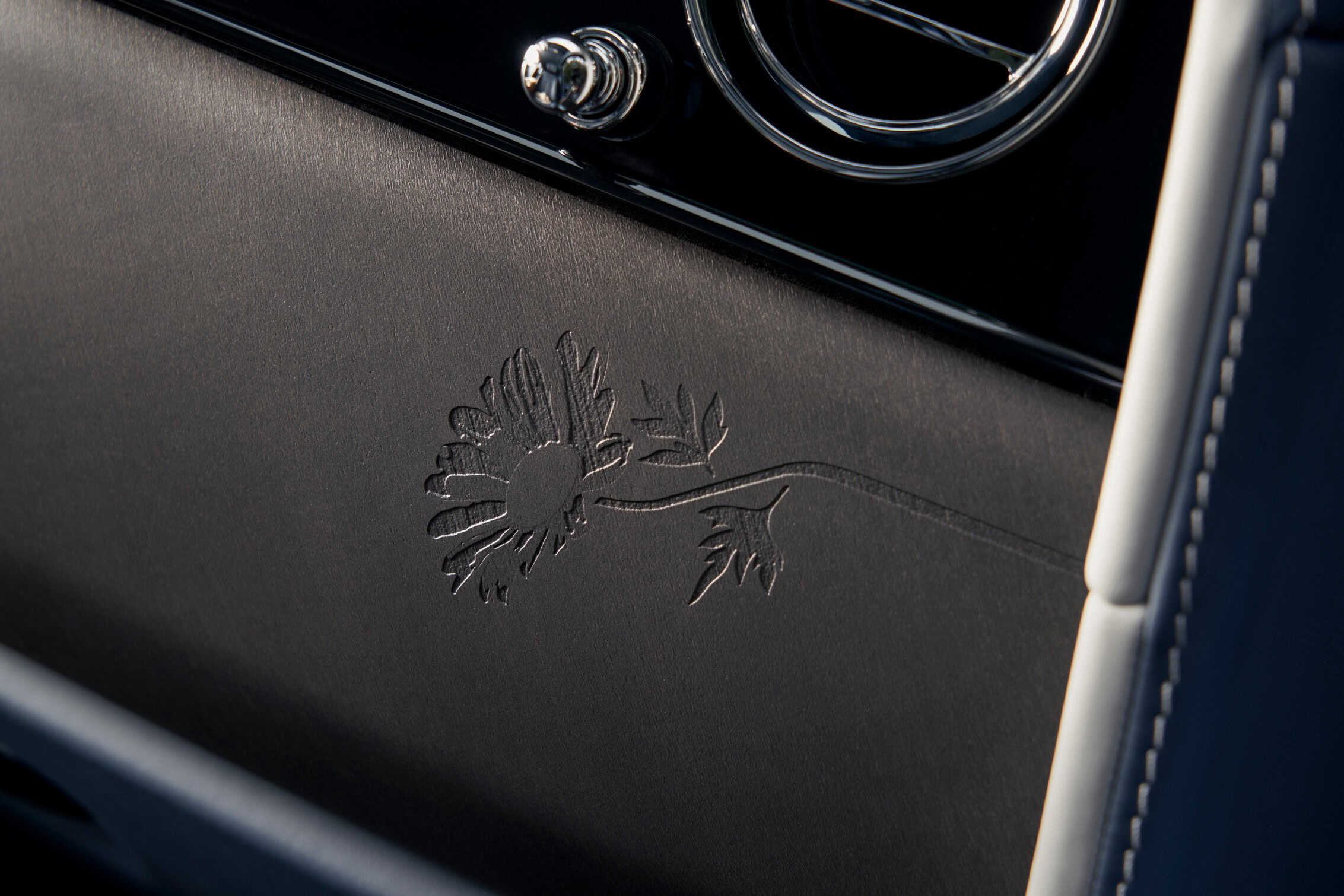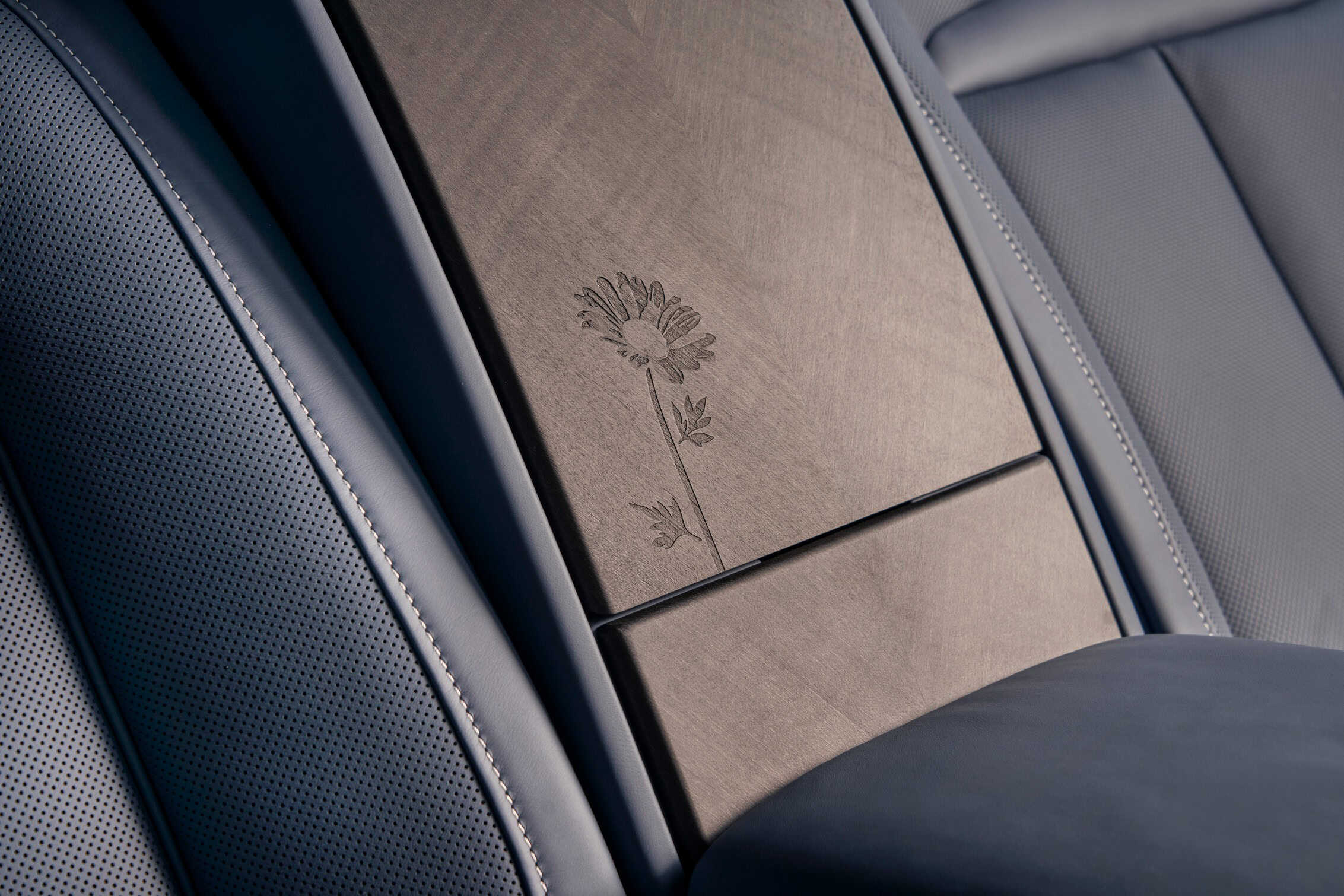 The daisy theme becomes more pronounced inside, especially on the wood trim. Rolls-Royce used a sandblasting technique to achieve this intricate finish. By directing a stream of fine mineral particles at the Blackwood veneers, artisans etched away the surface to reveal detailed daisy graphics.