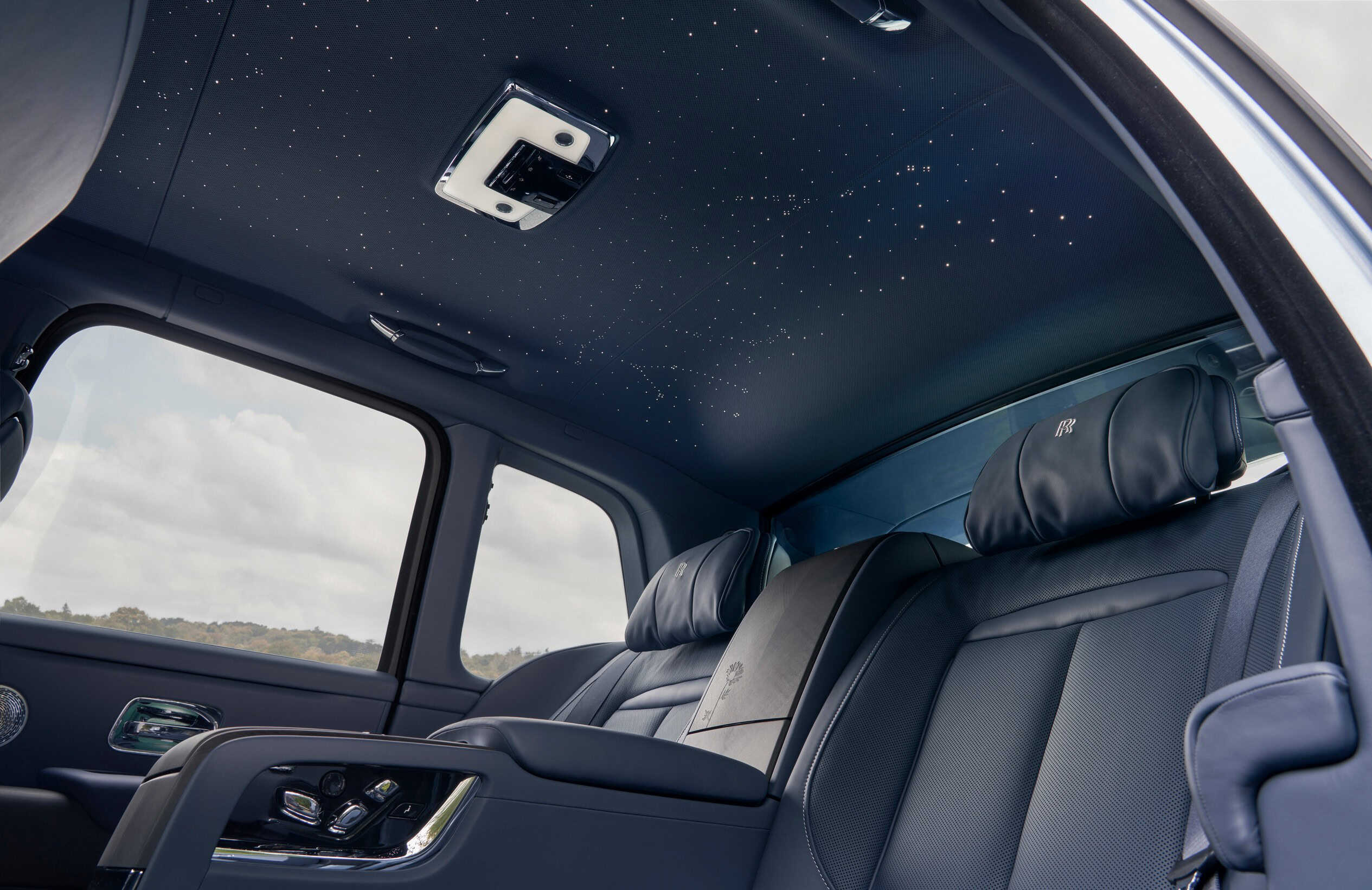 The commissioning client chose Fleet Blue leather, not only for the seats but also to cover the B- and C-pillars. Look closer and you’ll even spot it on the rotary knobs in the center console. The daisy motif continues on the illuminated door sills and even on the umbrellas stowed in the rear doors.The buyer also requested a bespoke headliner with Rolls-Royce’s signature Starlight treatment, an illuminated ceiling created with hundreds of fiber-optic lights. In this Cullinan, the custom pattern replicates the constellations of Ursa Major, Ursa Minor, Gemini, and Taurus.