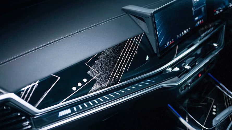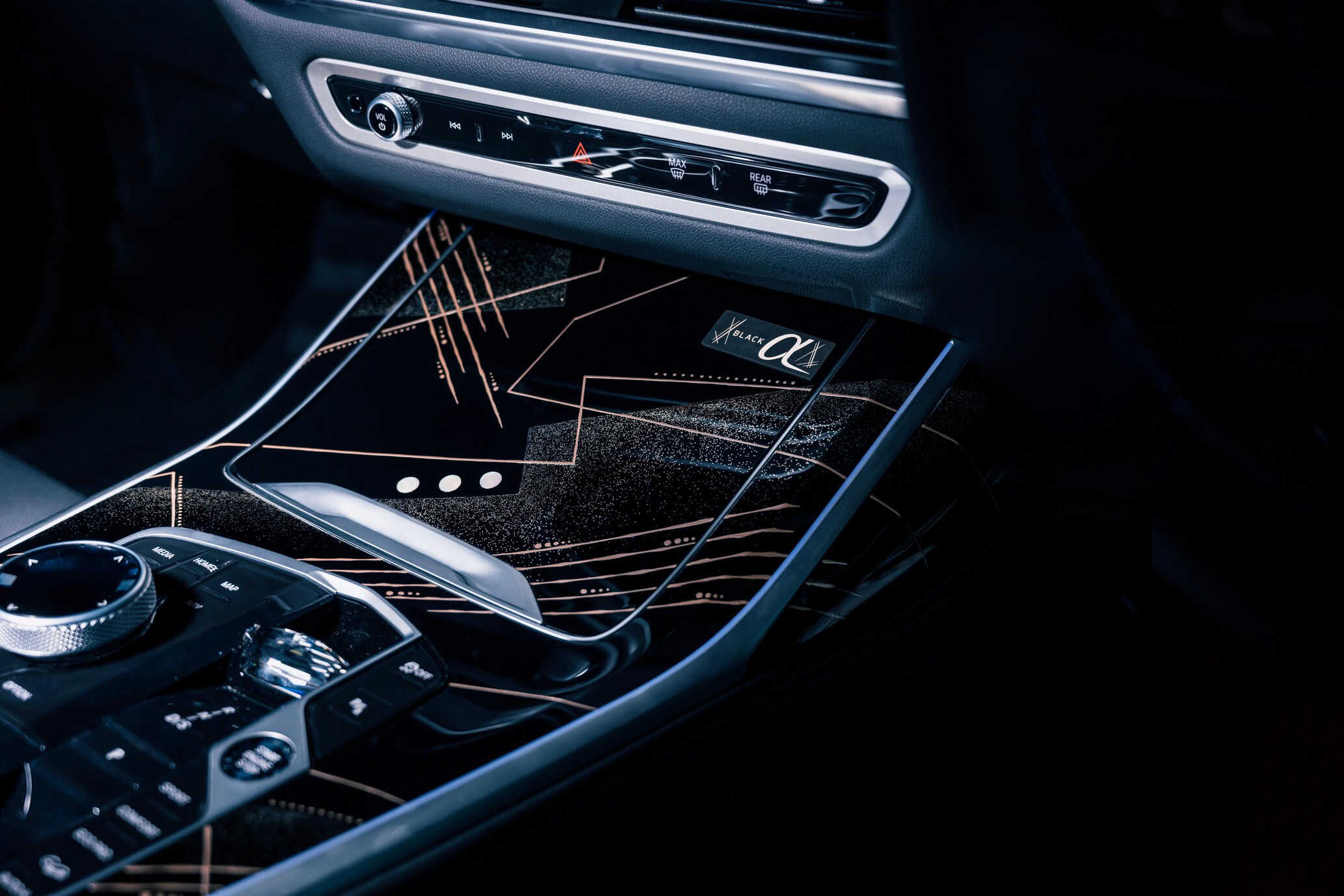 What sets the BLACK-α apart from a standard X7? Unique laser engravings appear on the center console lid and the passenger side of the dashboard as a nod to Momentum Factory Orii, a Takaoka City–based artisanal company renowned for its Takaoka copperware coloring techniques.